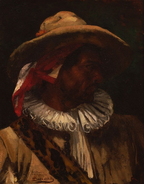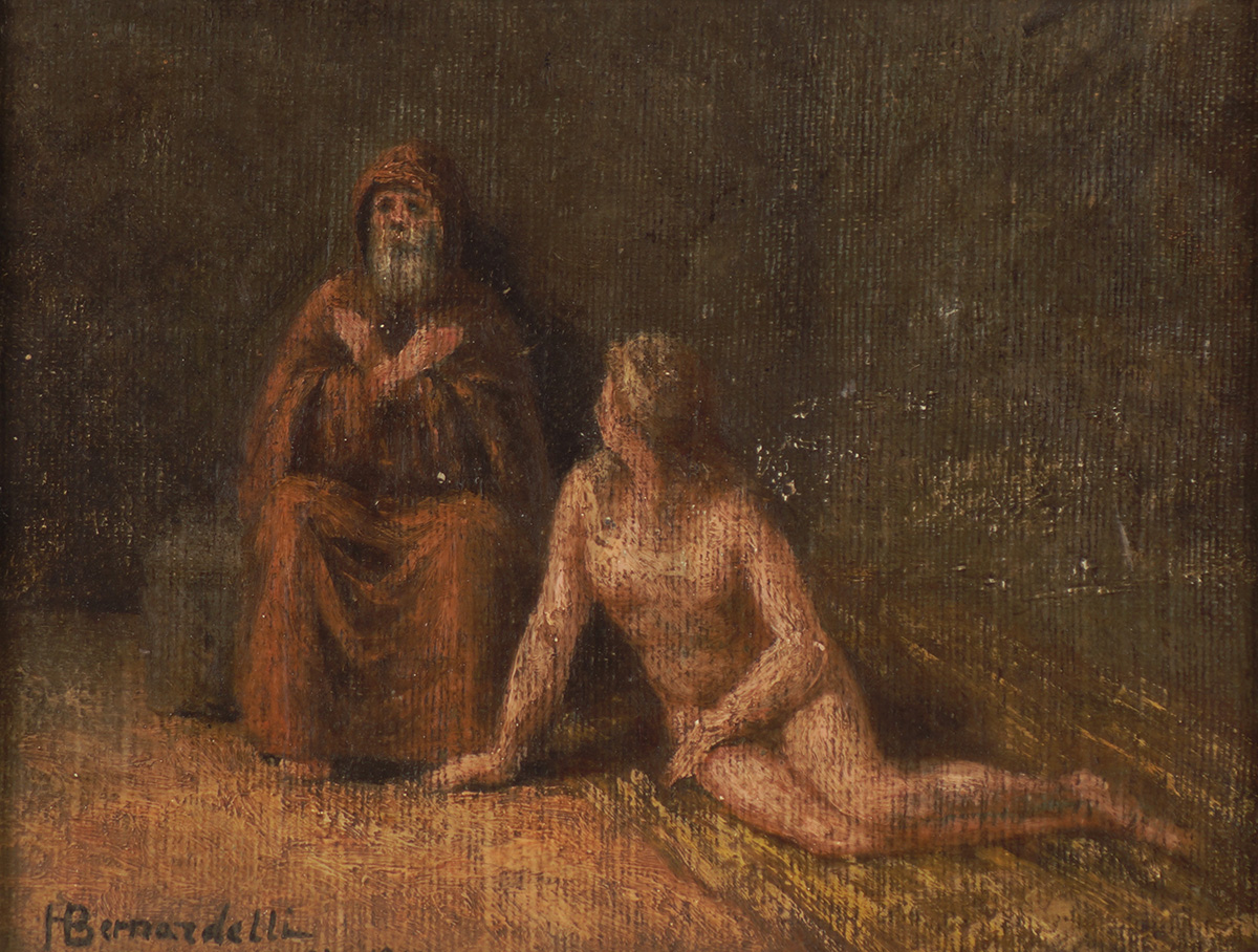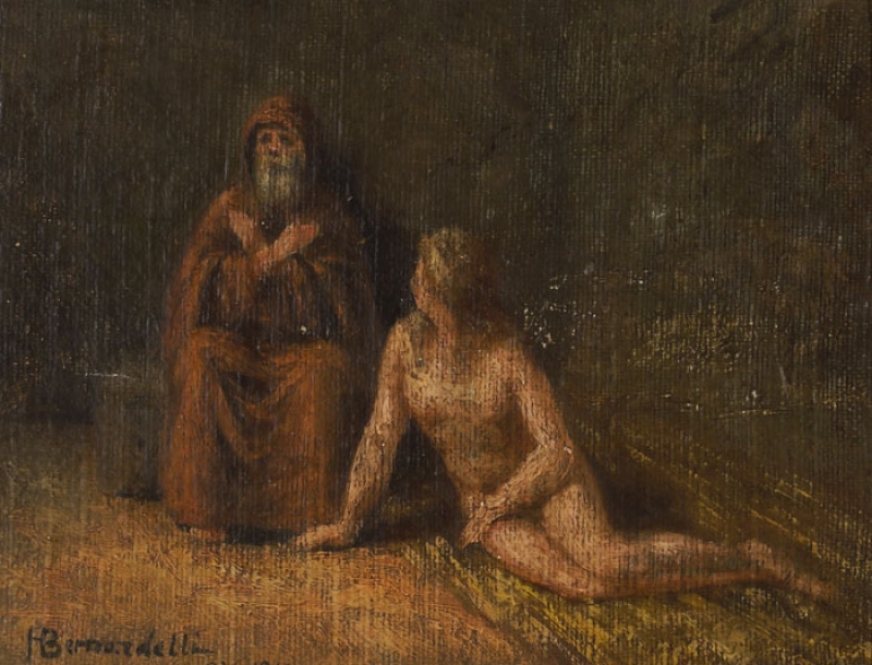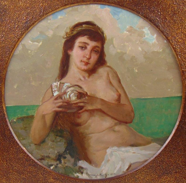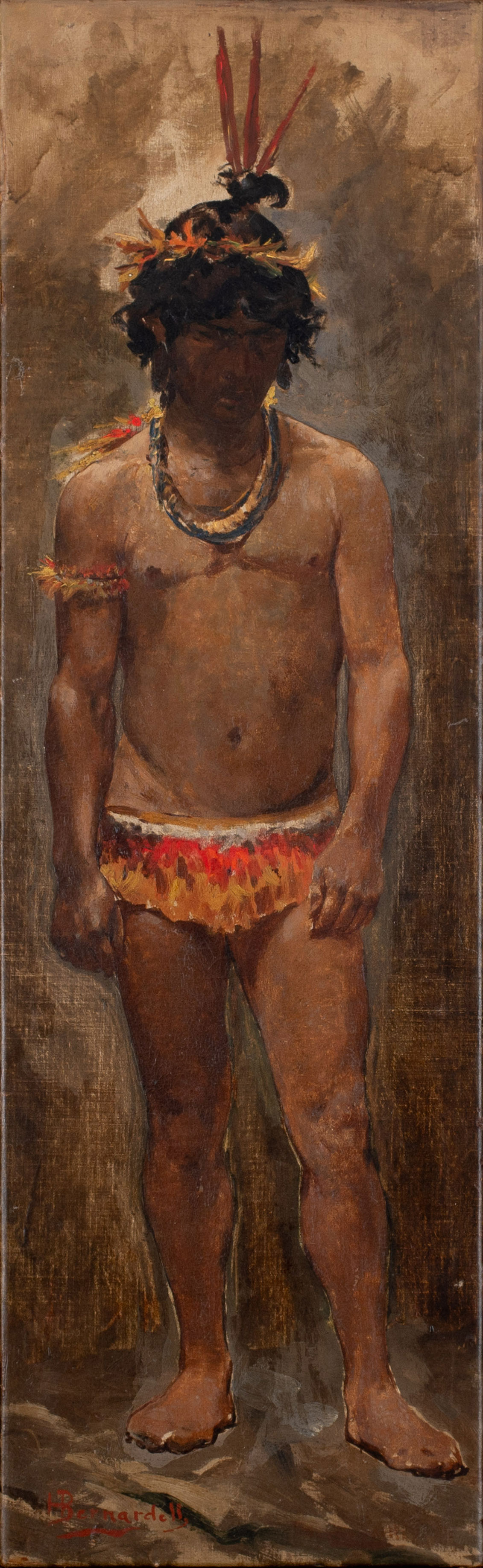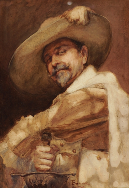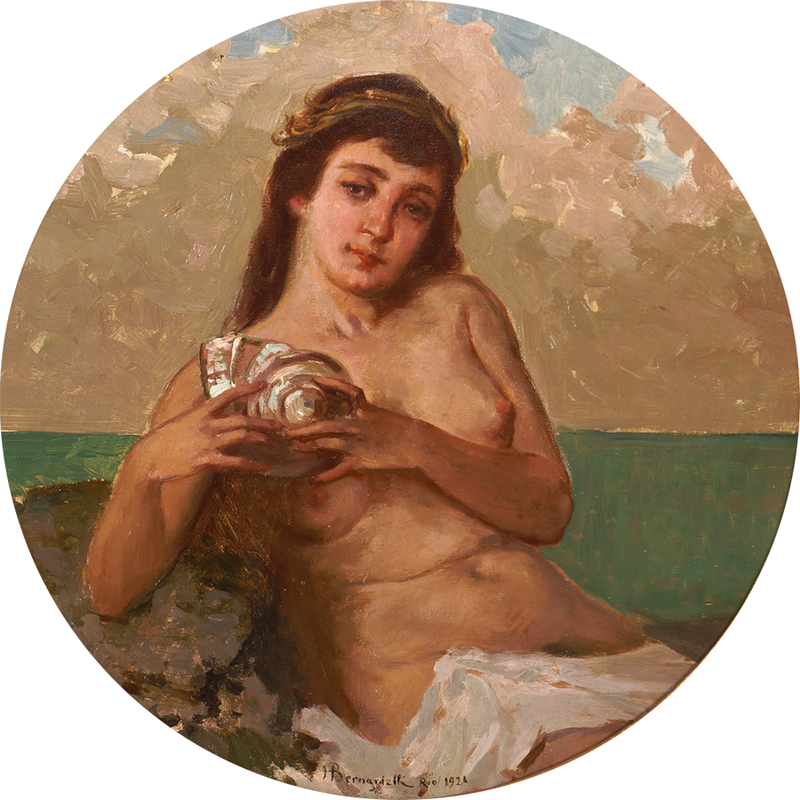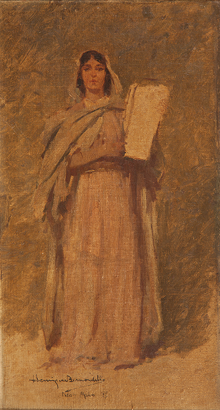 Henrique Bernardelli (Valparaíso, Chile 1858 - Rio de Janeiro RJ 1936). Pintor, desenhista, gravador, professor. Irmão do escultor Rodolfo Bernardelli (1852-1931) e do violonista e pintor Felix Bernadelli (1862-1905). Chega com a família ao Brasil  no começo da década de 1860, se estabelecendo no Rio Grande do Sul. Em 1867, transfere-se para o Rio de Janeiro. Três anos depois, matricula-se na Academia Imperial de Belas Artes (Aiba), juntamente com o irmão Rodolfo. É aluno de Zeferino da Costa (1840-1915), Agostinho da Motta (1824-1878) e Victor Meirelles (1832-1903). Viaja para a Itália em 1878. Em Roma, freqüenta o ateliê de Domenico Morelli (1826-1901) com quem estuda até 1886.  Volta ao Brasil no mesmo ano, realiza no Rio de Janeiro uma exposição individual que causa interesse e polêmica no meio local. São apresentadas, entre outras obras, Tarantela (1886), Maternidade (1878), Messalina (1880), Modelo em Repouso(ca.1881) e Ao Meio Dia.