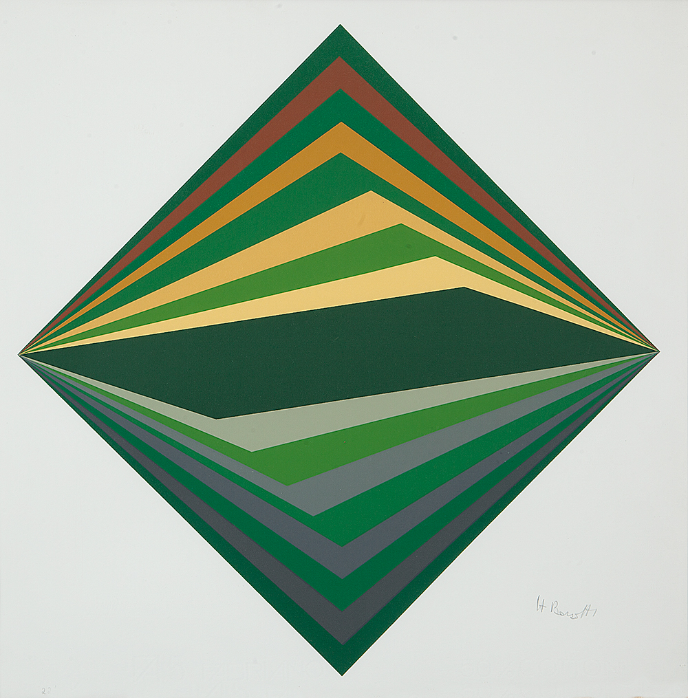 Hércules Rubens Barsotti (São Paulo SP 1914 - idem 2010). Pintor, desenhista, programador visual, gravador. Inicia formação artística em 1926, sob orientação do pintor Enrico Vio (1874-1960), com quem estuda desenho e composição. Em 1937, forma-se em química industrial pelo Instituto Mackenzie. Começa a pintar em 1940 e, na década seguinte, realiza as primeiras pinturas concretas, além de trabalhar como desenhista têxtil e projetar figurino para o teatro. Em 1954, com Willys de Castro (1926-1988), funda o Estúdio de Projetos Gráficos, elabora ilustrações para várias revistas e desenvolve estampas de tecidos produzidos em sua tecelagem. Viaja a estudo para a Europa em 1958, onde conhece Max Bill (1908-1994), então um dos principais teóricos da arte concreta. Na década de 1960, convidado por Ferreira Gullar (1930), integra-se ao Grupo Neoconcreto do Rio de Janeiro e participa das exposições de arte do grupo realizadas no Ministério da Educação e Cultura (MEC), no Rio de Janeiro, e no Museu de Arte Moderna de São Paulo (MAM/SP). Em 1960, expõe na mostra Konkrete Kunst [Arte Concreta], organizada por Max Bill, em Zurique. Hercules Barsotti explora a cor, as possibilidades dinâmicas da forma e utiliza formatos de quadros pouco usuais, como losangos, hexágonos, pentágonos e circunferências. Em sua obra a disposição dos campos de cor cria a ilusão de tridimensionalidade. Entre 1963 e 1965, colabora na fundação e participa do Grupo Novas Tendências, em São Paulo. Em 2004, o MAM/SP organiza uma retrospectiva do artista.
