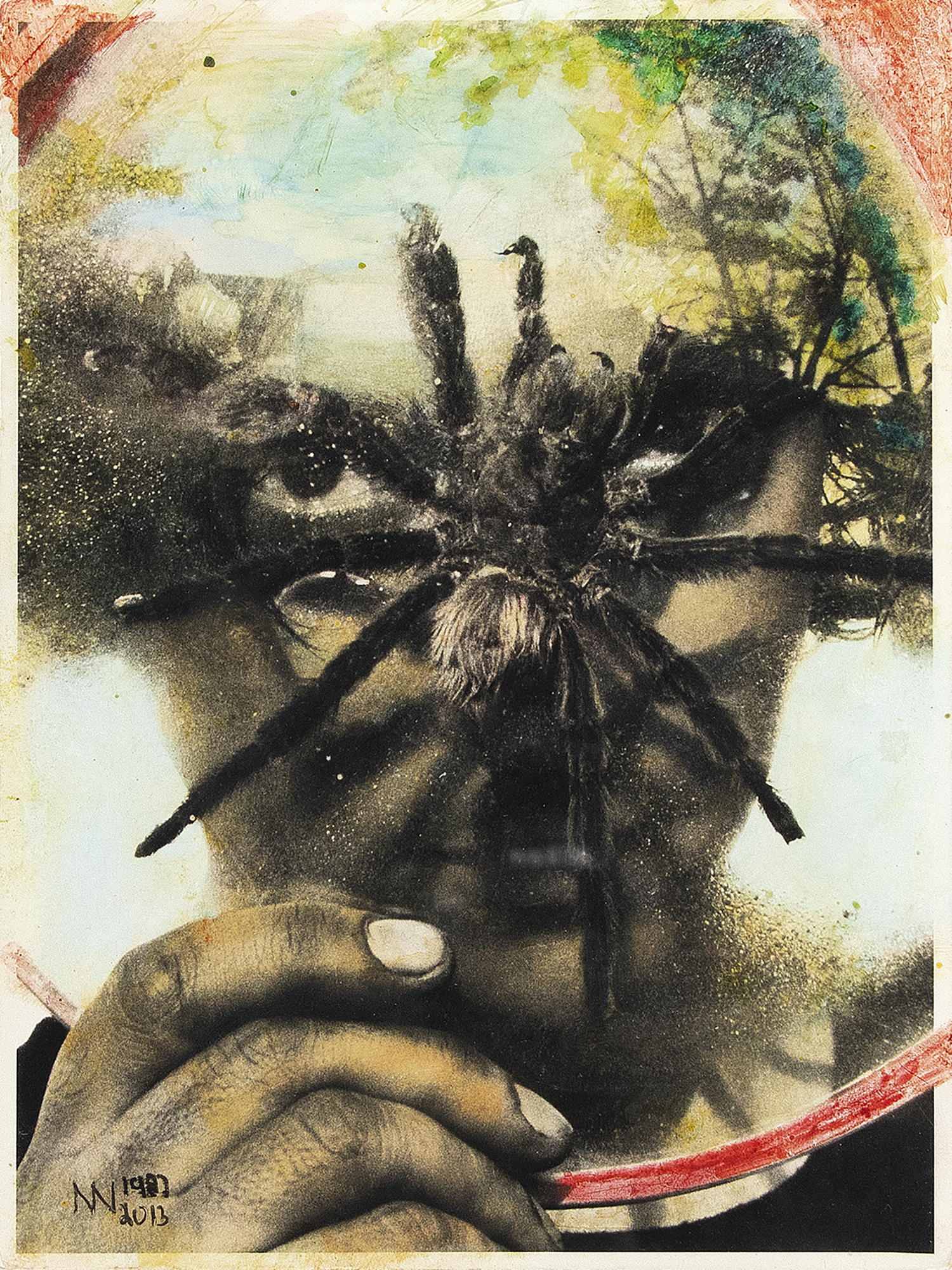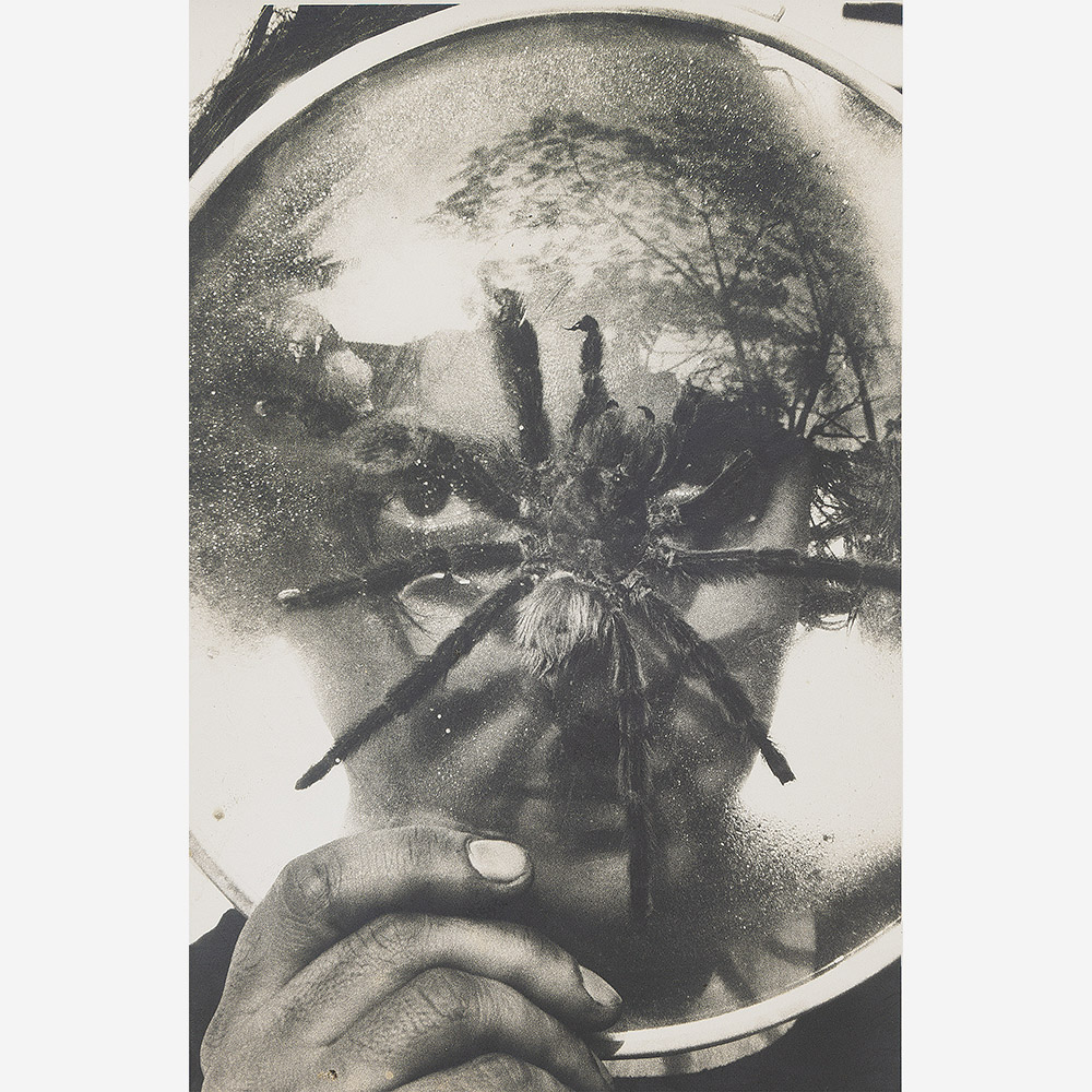 Ivan Cardoso - Tunga e a aranha- Fotografia analógica P&B em papel Kodak brilhante, em caixa de acrílico. - Assinada e datada 1982 inferior esquerdo. - Colorizara à mão pelo artista 2011. - Edição única. - 18 X 24 cm.