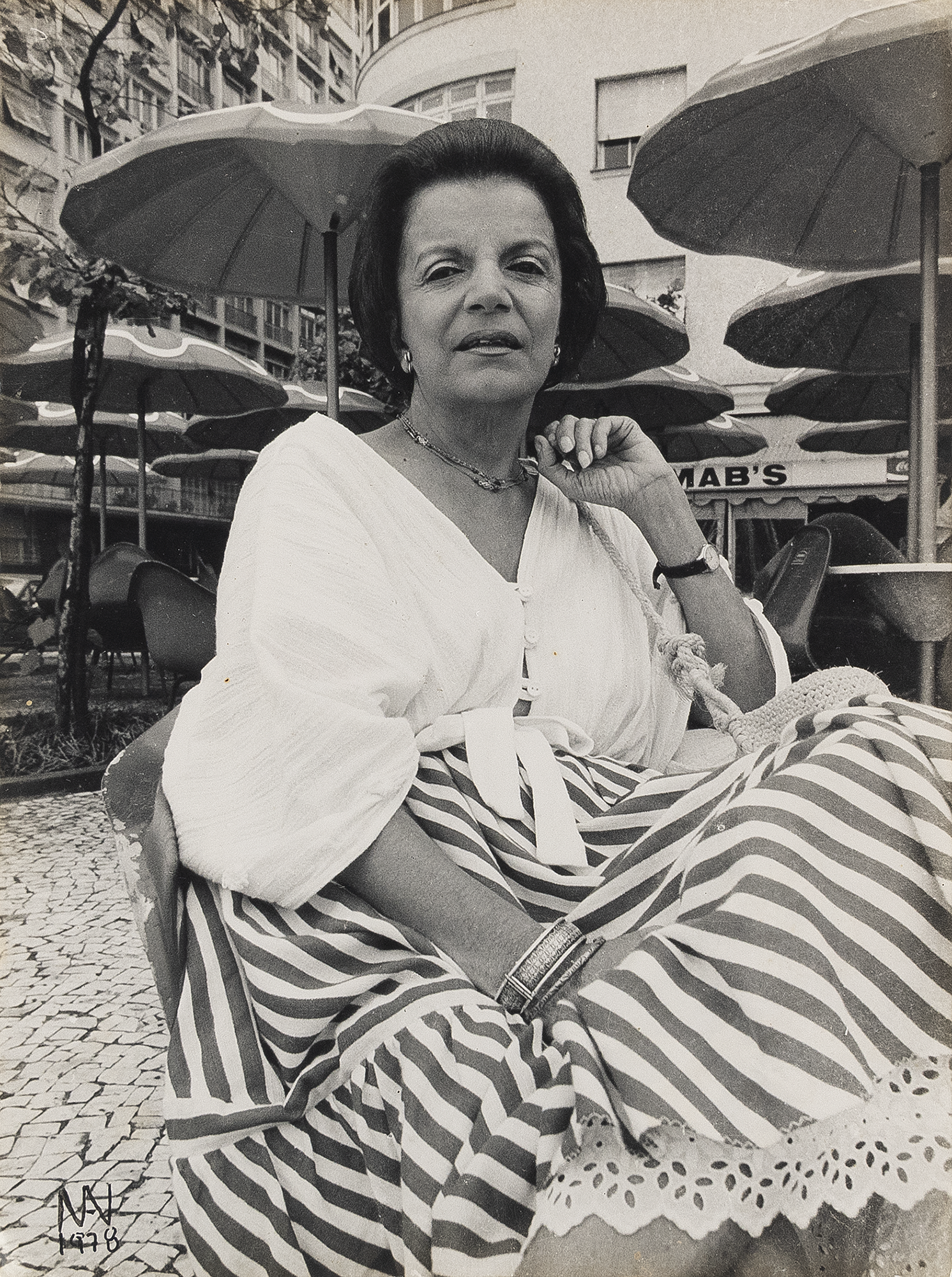 Ivan Cardoso - Lygia Clark no Mab's na praia - Fotografia analógica P&b em papel Kodak brilhante. - Assinada e datada 1978 inferior esquerdo. - Assinada datada 1978, Titulada e situada Rio no verso. - 18 x 24 cm.