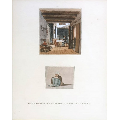 Jean-Baptiste Debret , pintor, desenhista, gravador, professor, decorador, cenógrafo. Freqüenta a Academia de Belas Artes, em Paris, entre 1785 e 1789, aluno de Jacques-Louis David (1748 - 1825), seu primo e líder do neoclassicismo francês. Estuda fortificações na École de Ponts et Chaussée [Escola de Pontes e Rodovias, futura Escola Politécnica], onde se torna professor de desenho. Em 1798, auxilia os arquitetos Percier e Fontaine na decoração de edifícios. Por volta de 1806, trabalha como pintor na corte de Napoleão (1769 - 1821). Após a queda do imperador e com a morte de seu único filho, Debret decide integrar a Missão Artística Francesa, que vem ao Brasil em 1816. Instala-se no Rio de Janeiro e, a partir de 1817, ministra aulas de pintura em seu ateliê, onde tem como aluno Simplício de Sá (1785 - 1839). Em 1818, colabora na decoração pública para a aclamação de D. João VI (1767 - 1826), no Rio de Janeiro. Por volta de 1825, realiza águas-fortes, que estão na Seção de Estampas da Biblioteca Nacional do Rio de Janeiro. De 1826 a 1831, é professor de pintura histórica na Academia Imperial de Belas Artes - Aiba, atividade que alterna com viagens para várias cidades do país, quando retrata tipos humanos, costumes e paisagens locais. Na Aiba tem como alunos Porto Alegre (1806 - 1879) e August Müller (1815 - ca.1883). Em 1829, organiza a Exposição da Classe de Pintura Histórica da Imperial Academia das Bellas Artes, primeira mostra pública de arte no Brasil. Deixa o país em 1831 e retorna a Paris com o discípulo Porto Alegre. Entre 1834 e 1839, edita, o livro Viagem Pitoresca e Histórica ao Brasil, em três volumes, ilustrado com litogravuras que têm como base as aquarelas realizadas com seus estudos e observações.