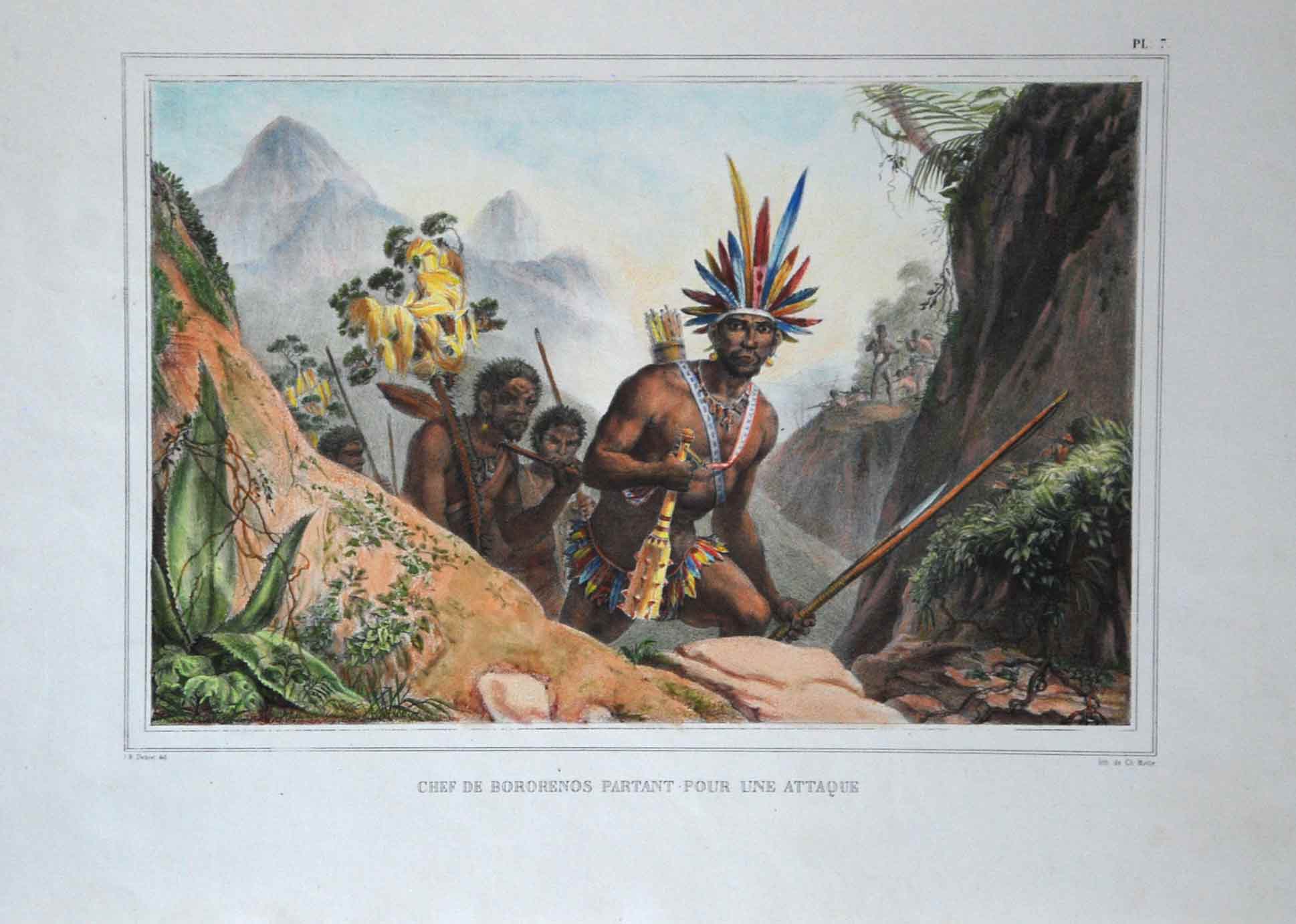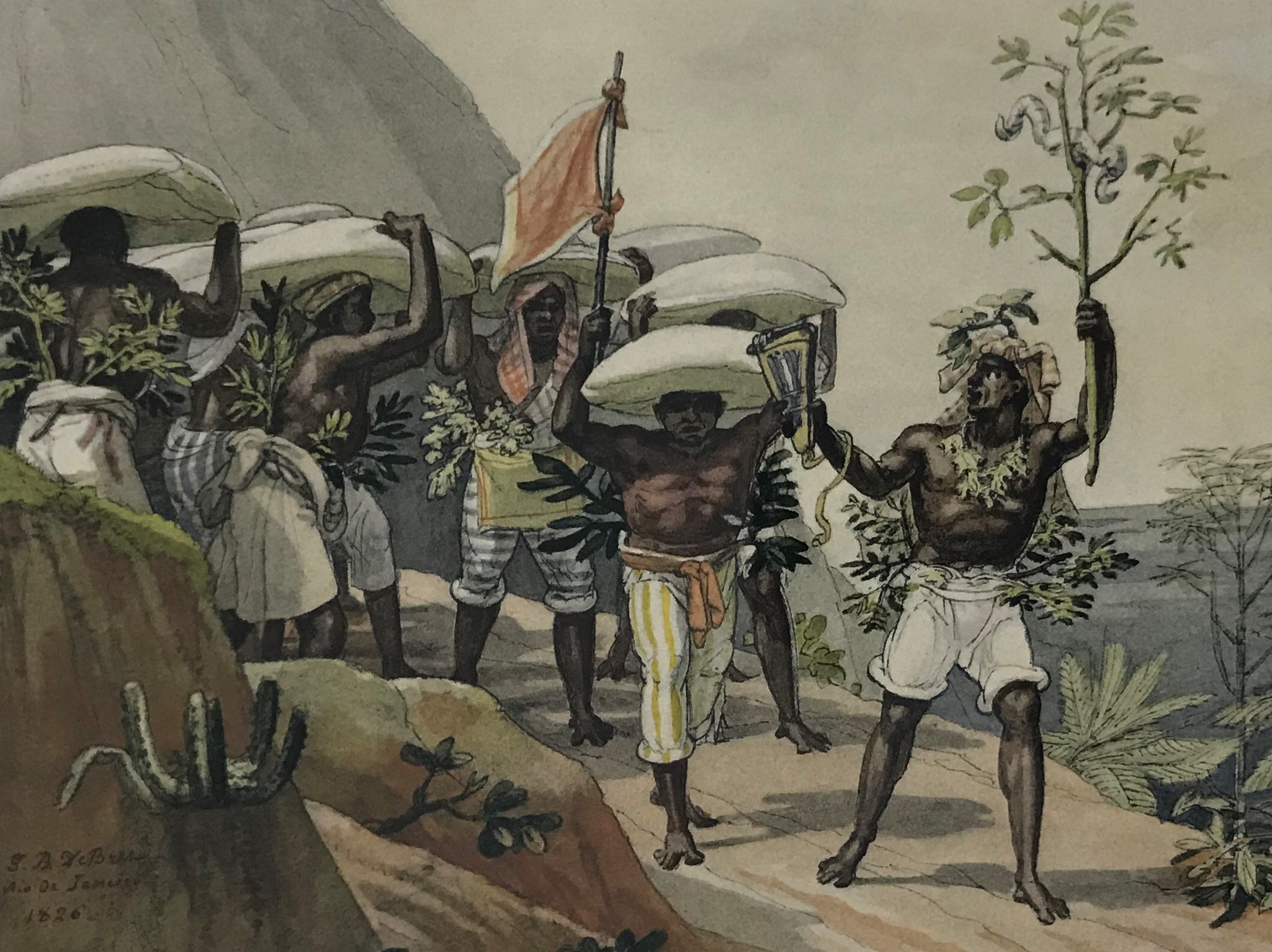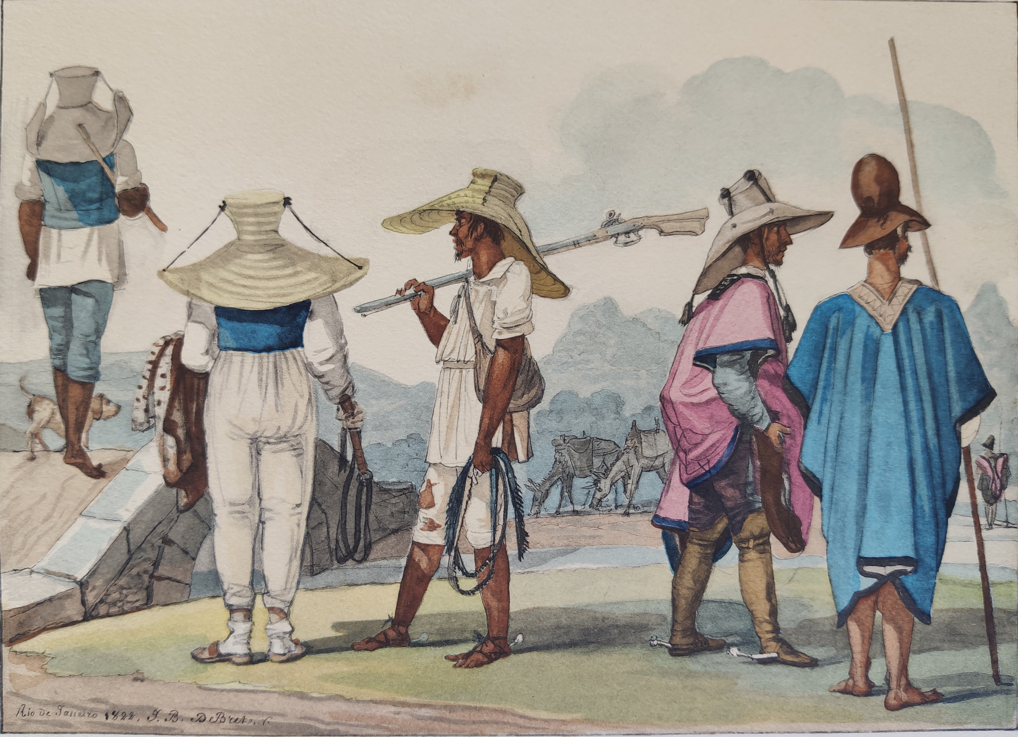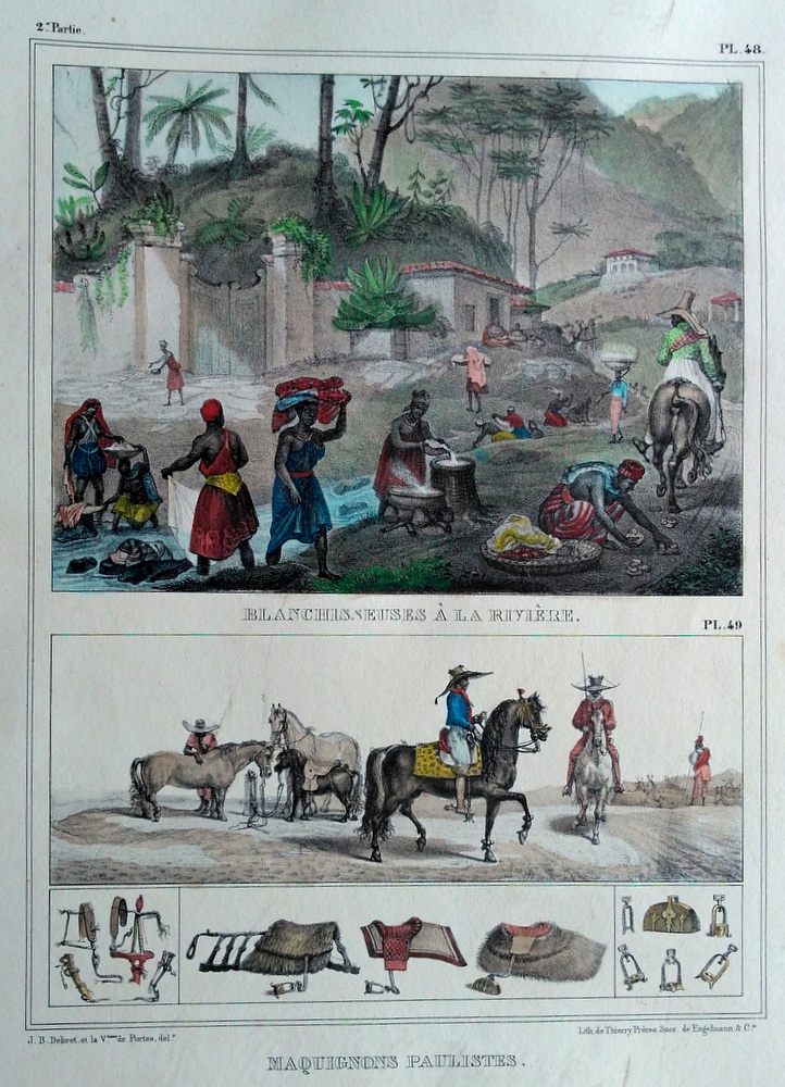 Jean-Baptiste Debret , pintor, desenhista, gravador, professor, decorador, cenógrafo. Freqüenta a Academia de Belas Artes, em Paris, entre 1785 e 1789, aluno de Jacques-Louis David (1748 - 1825), seu primo e líder do neoclassicismo francês. Estuda fortificações na École de Ponts et Chaussée [Escola de Pontes e Rodovias, futura Escola Politécnica], onde se torna professor de desenho. Em 1798, auxilia os arquitetos Percier e Fontaine na decoração de edifícios. Por volta de 1806, trabalha como pintor na corte de Napoleão (1769 - 1821). Após a queda do imperador e com a morte de seu único filho, Debret decide integrar a Missão Artística Francesa, que vem ao Brasil em 1816. Instala-se no Rio de Janeiro e, a partir de 1817, ministra aulas de pintura em seu ateliê, onde tem como aluno Simplício de Sá (1785 - 1839). Em 1818, colabora na decoração pública para a aclamação de D. João VI (1767 - 1826), no Rio de Janeiro. Por volta de 1825, realiza águas-fortes, que estão na Seção de Estampas da Biblioteca Nacional do Rio de Janeiro. De 1826 a 1831, é professor de pintura histórica na Academia Imperial de Belas Artes - Aiba, atividade que alterna com viagens para várias cidades do país, quando retrata tipos humanos, costumes e paisagens locais. Na Aiba tem como alunos Porto Alegre (1806 - 1879) e August Müller (1815 - ca.1883). Em 1829, organiza a Exposição da Classe de Pintura Histórica da Imperial Academia das Bellas Artes, primeira mostra pública de arte no Brasil. Deixa o país em 1831 e retorna a Paris com o discípulo Porto Alegre. Entre 1834 e 1839, edita, o livro Viagem Pitoresca e Histórica ao Brasil, em três volumes, ilustrado com litogravuras que têm como base as aquarelas realizadas com seus estudos e observações.