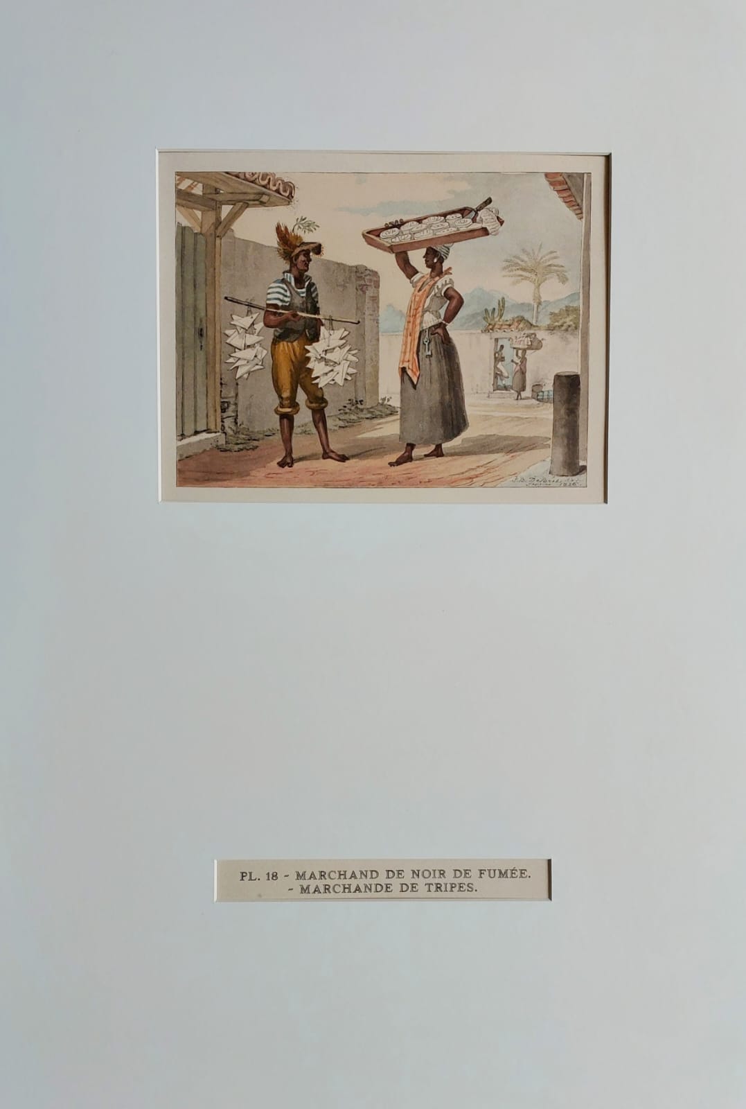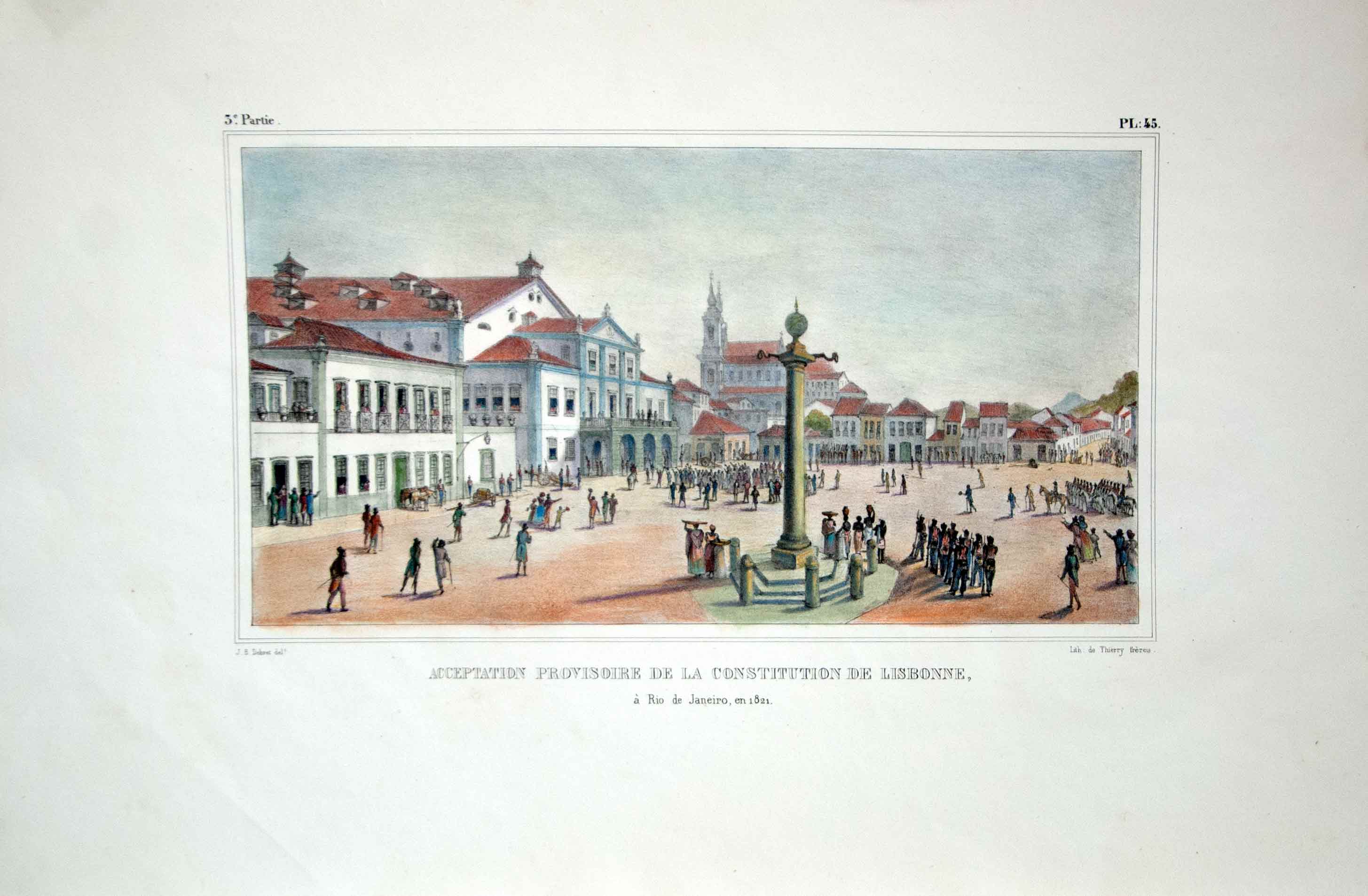 Jean-Baptiste Debret , pintor, desenhista, gravador, professor, decorador, cenógrafo. Freqüenta a Academia de Belas Artes, em Paris, entre 1785 e 1789, aluno de Jacques-Louis David (1748 - 1825), seu primo e líder do neoclassicismo francês. Estuda fortificações na École de Ponts et Chaussée [Escola de Pontes e Rodovias, futura Escola Politécnica], onde se torna professor de desenho. Em 1798, auxilia os arquitetos Percier e Fontaine na decoração de edifícios. Por volta de 1806, trabalha como pintor na corte de Napoleão (1769 - 1821). Após a queda do imperador e com a morte de seu único filho, Debret decide integrar a Missão Artística Francesa, que vem ao Brasil em 1816. Instala-se no Rio de Janeiro e, a partir de 1817, ministra aulas de pintura em seu ateliê, onde tem como aluno Simplício de Sá (1785 - 1839). Em 1818, colabora na decoração pública para a aclamação de D. João VI (1767 - 1826), no Rio de Janeiro. Por volta de 1825, realiza águas-fortes, que estão na Seção de Estampas da Biblioteca Nacional do Rio de Janeiro. De 1826 a 1831, é professor de pintura histórica na Academia Imperial de Belas Artes - Aiba, atividade que alterna com viagens para várias cidades do país, quando retrata tipos humanos, costumes e paisagens locais. Na Aiba tem como alunos Porto Alegre (1806 - 1879) e August Müller (1815 - ca.1883). Em 1829, organiza a Exposição da Classe de Pintura Histórica da Imperial Academia das Bellas Artes, primeira mostra pública de arte no Brasil. Deixa o país em 1831 e retorna a Paris com o discípulo Porto Alegre. Entre 1834 e 1839, edita, o livro Viagem Pitoresca e Histórica ao Brasil, em três volumes, ilustrado com litogravuras que têm como base as aquarelas realizadas com seus estudos e observações.
