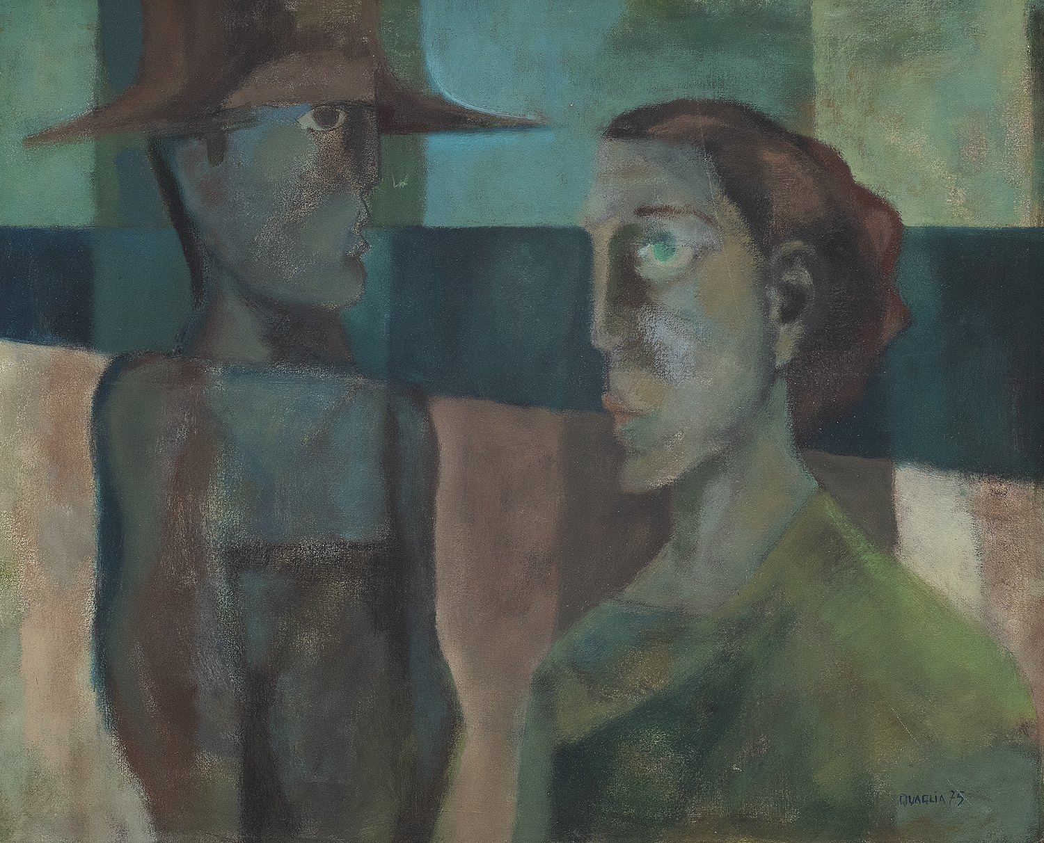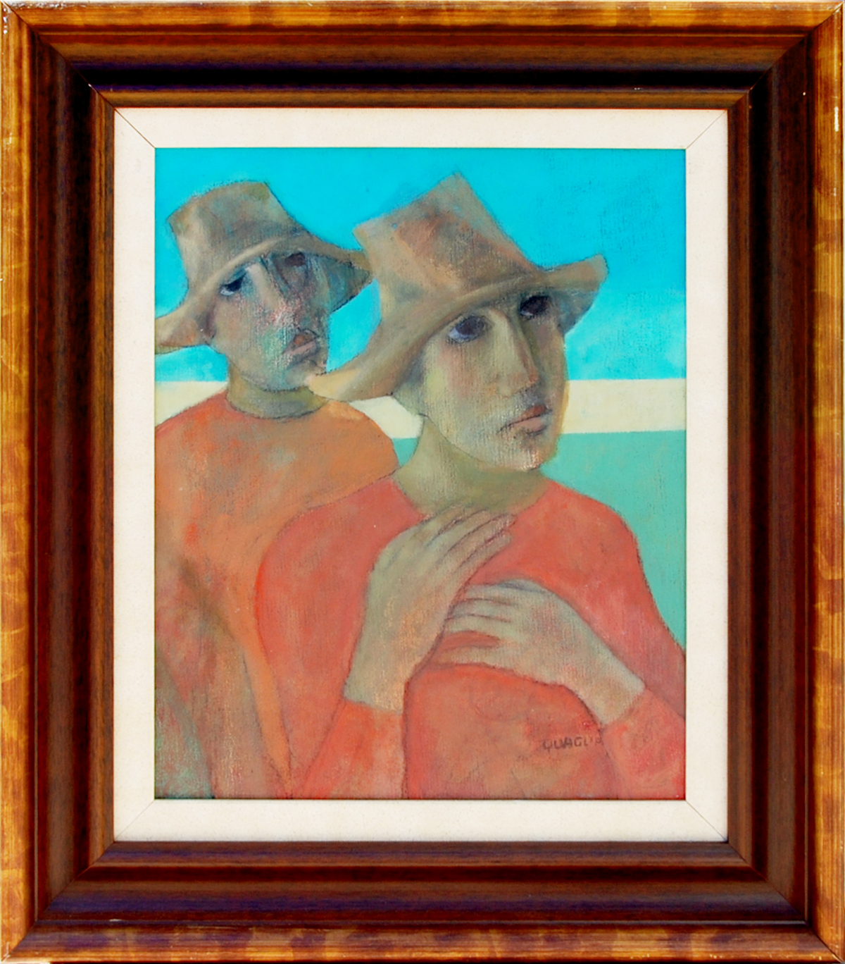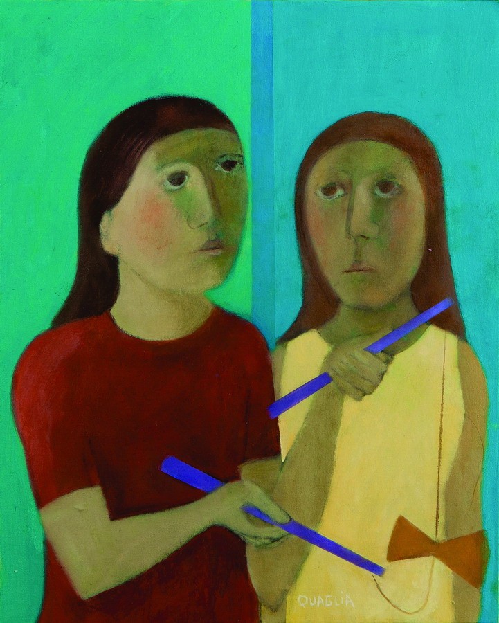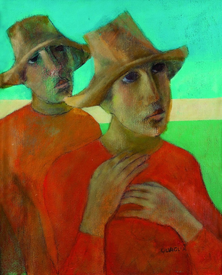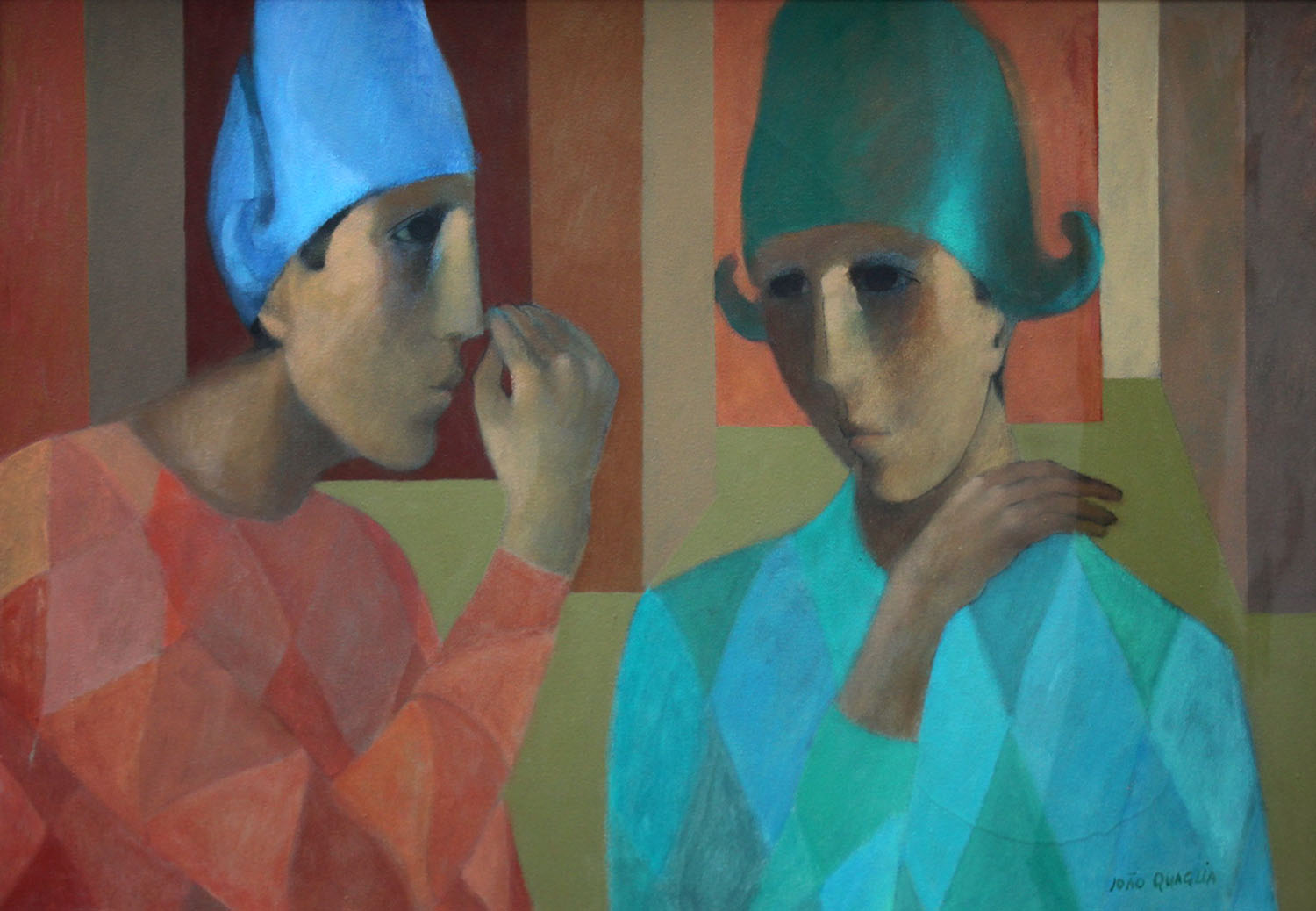 "Quaglia, pintor nascido na Bahia, e envolvido em muitas andanças nacionais e estrangeiras, parece refletir, de forma convincente e madura, a raiz de Segall na pintura contemporânea do Brasil. A melancolia e expressão interiormente solitária dos personagens têm entre ambos sensível familiaridade, apesar do clima romântico com que Quaglia atenua a expressão de carência existencial do nosso tempo. Em fases anteriores, a pintura de Quaglia mostrava uma pele dolorida, expressa em textura que transmitia um transe emotivo. Hoje esta pintura se torna compacta e veludosa, definindo os planos e contrastes numa espécie de modelagem cromática. O desenho também se simplifica, os traços são mínimos em quantidade, embora certos recursos, como a fusão de corpo/roupa/membros em massa única de cor, criem uma surpreendente marca expressiva, liberando os braços e as mãos como raízes de vida. As mãos, por sua vez, passam códigos de comunicação sobre o silêncio, que paira nos rostos num misto de perplexidade e comiseração. Neste sentido quer nos parecer, que na série atual, a mímica é uma constante temática. Numa pintura tão densa e despojada, qualquer detalhe é marcante, e o espectador está sempre à espera de uma revelação, já que o aparelho visual encontra motivos de sobra para comprometer-se numa leitura íntima e solidária. (...)"