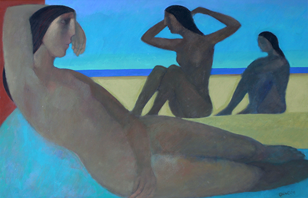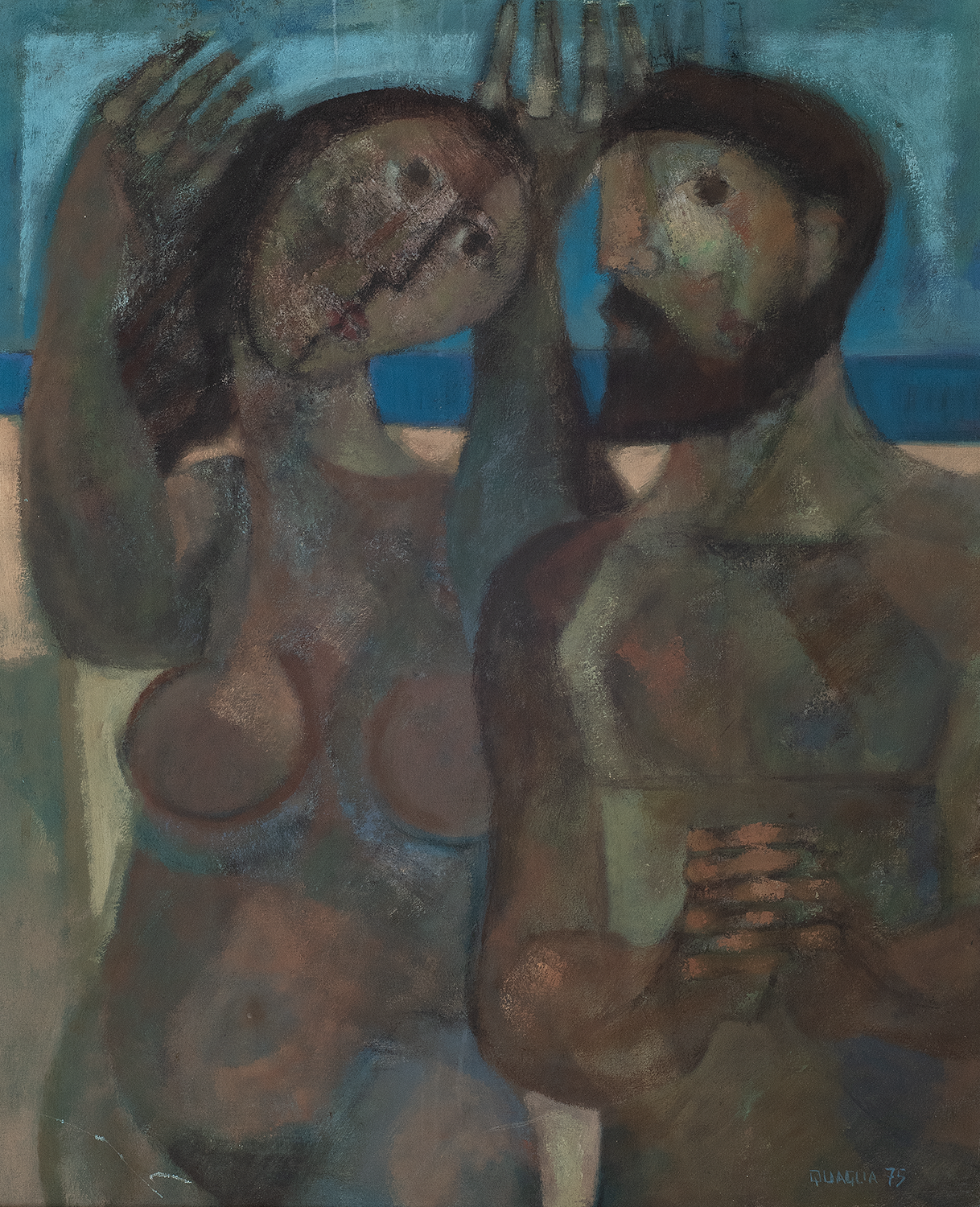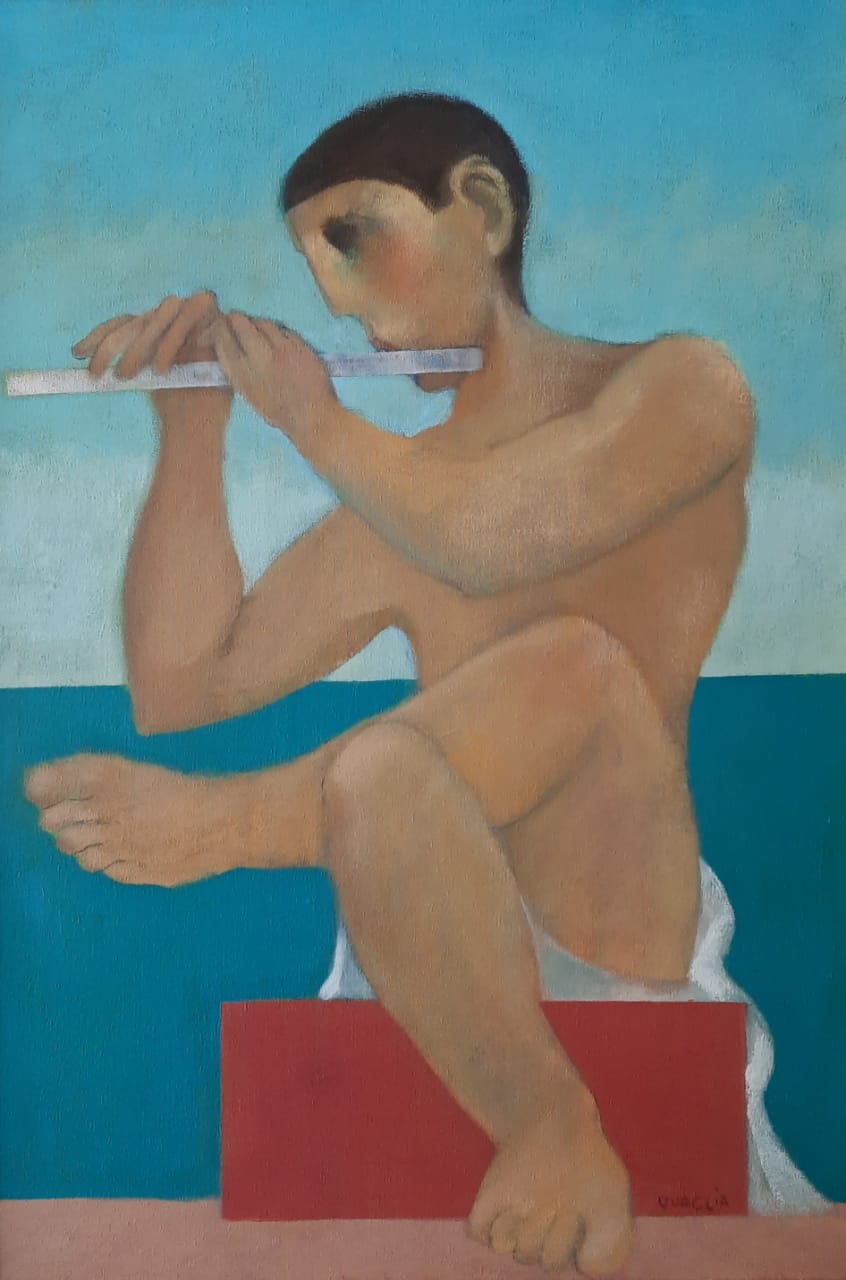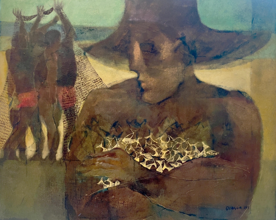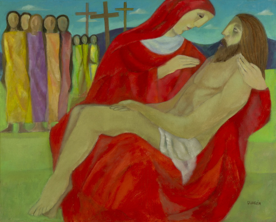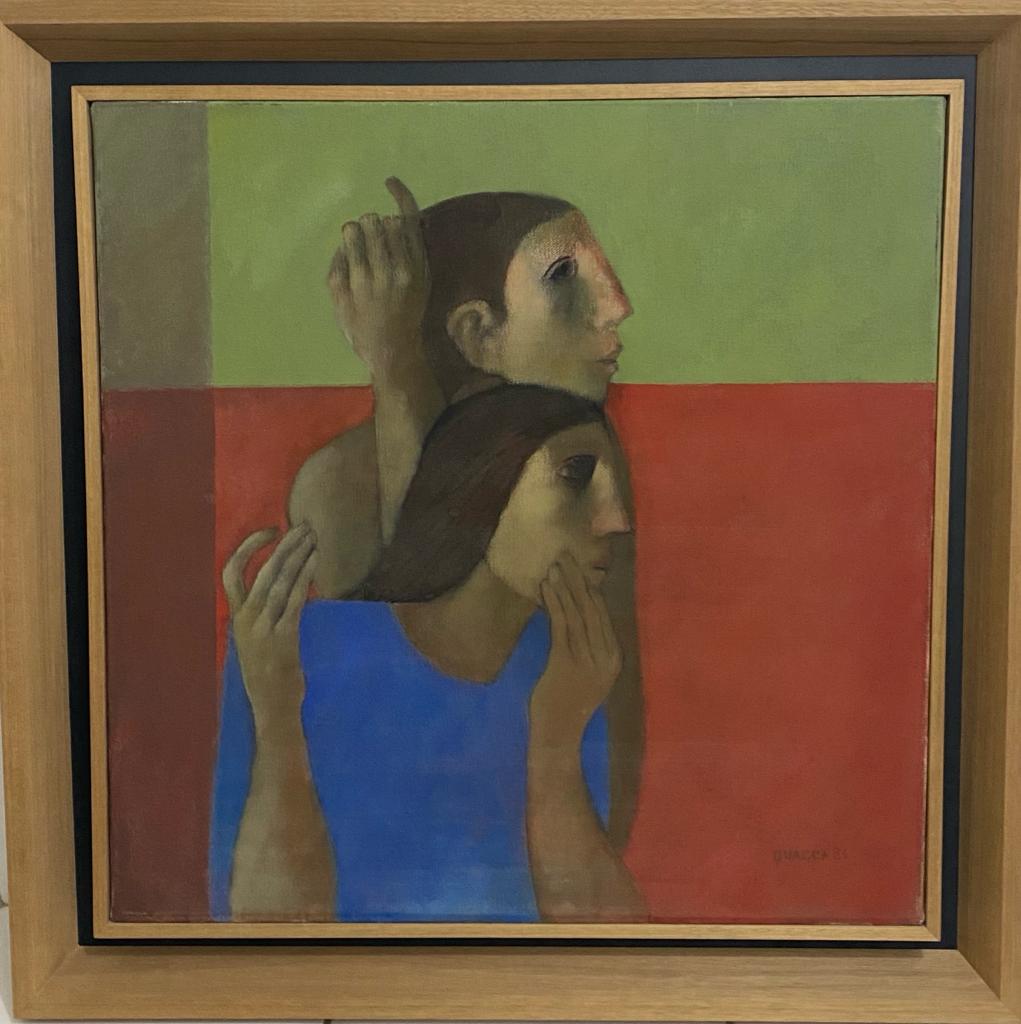 "Quaglia, pintor nascido na Bahia, e envolvido em muitas andanças nacionais e estrangeiras, parece refletir, de forma convincente e madura, a raiz de Segall na pintura contemporânea do Brasil. A melancolia e expressão interiormente solitária dos personagens têm entre ambos sensível familiaridade, apesar do clima romântico com que Quaglia atenua a expressão de carência existencial do nosso tempo. Em fases anteriores, a pintura de Quaglia mostrava uma pele dolorida, expressa em textura que transmitia um transe emotivo. Hoje esta pintura se torna compacta e veludosa, definindo os planos e contrastes numa espécie de modelagem cromática. O desenho também se simplifica, os traços são mínimos em quantidade, embora certos recursos, como a fusão de corpo/roupa/membros em massa única de cor, criem uma surpreendente marca expressiva, liberando os braços e as mãos como raízes de vida. As mãos, por sua vez, passam códigos de comunicação sobre o silêncio, que paira nos rostos num misto de perplexidade e comiseração. Neste sentido quer nos parecer, que na série atual, a mímica é uma constante temática. Numa pintura tão densa e despojada, qualquer detalhe é marcante, e o espectador está sempre à espera de uma revelação, já que o aparelho visual encontra motivos de sobra para comprometer-se numa leitura íntima e solidária. (...)"