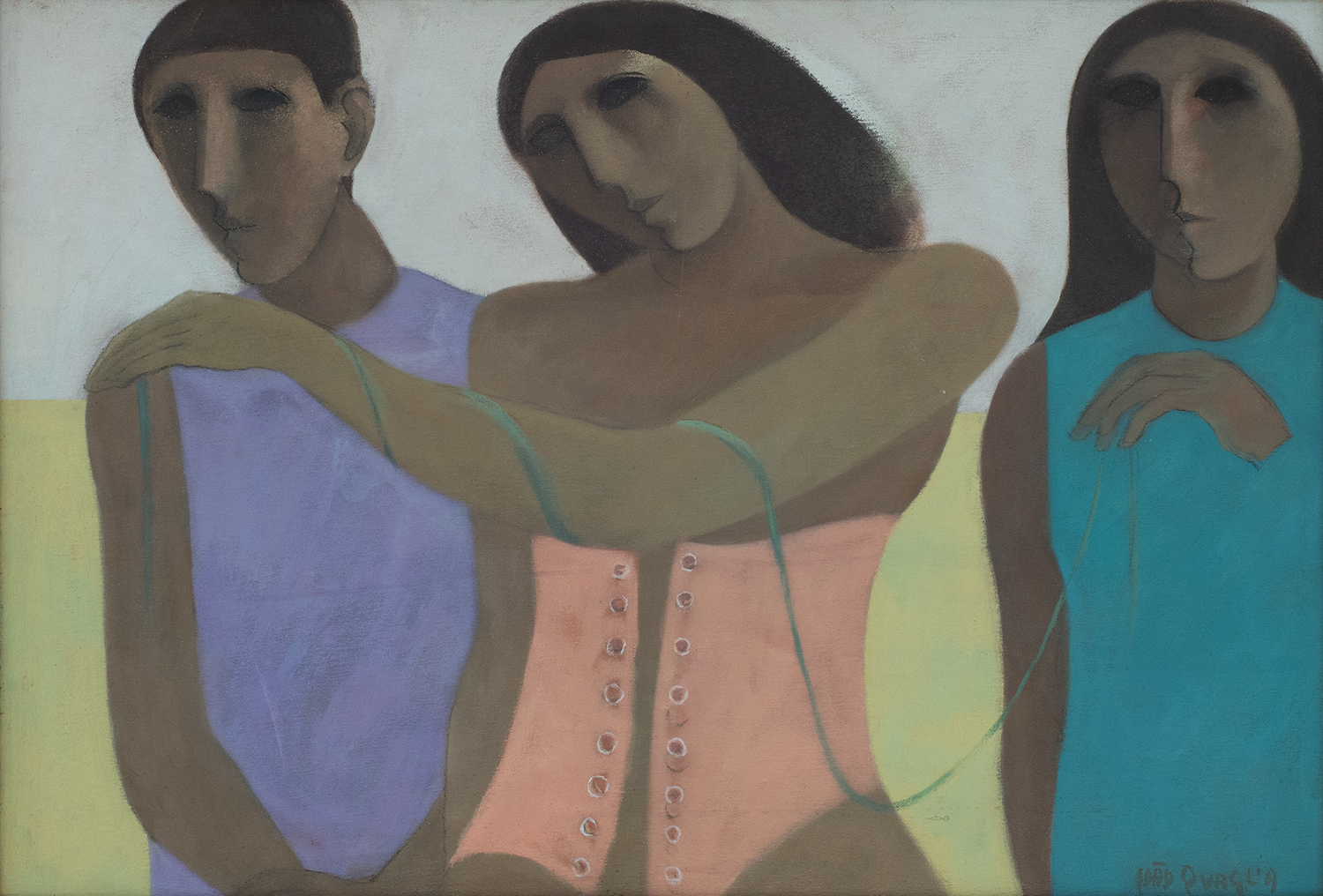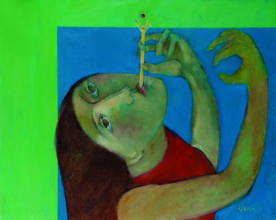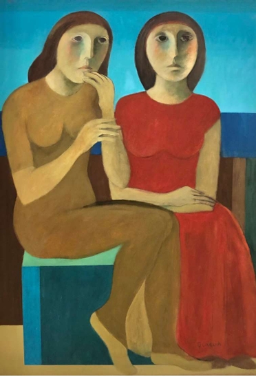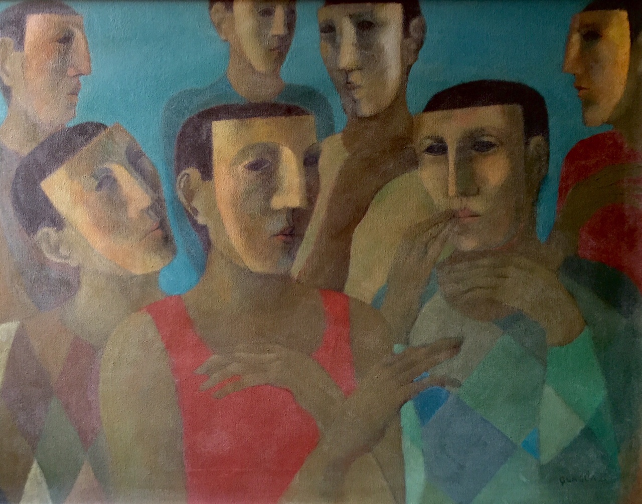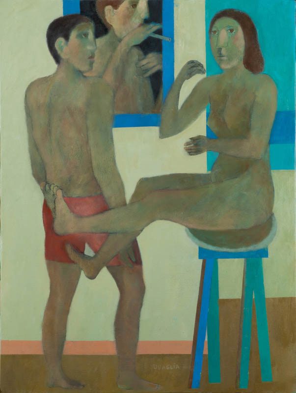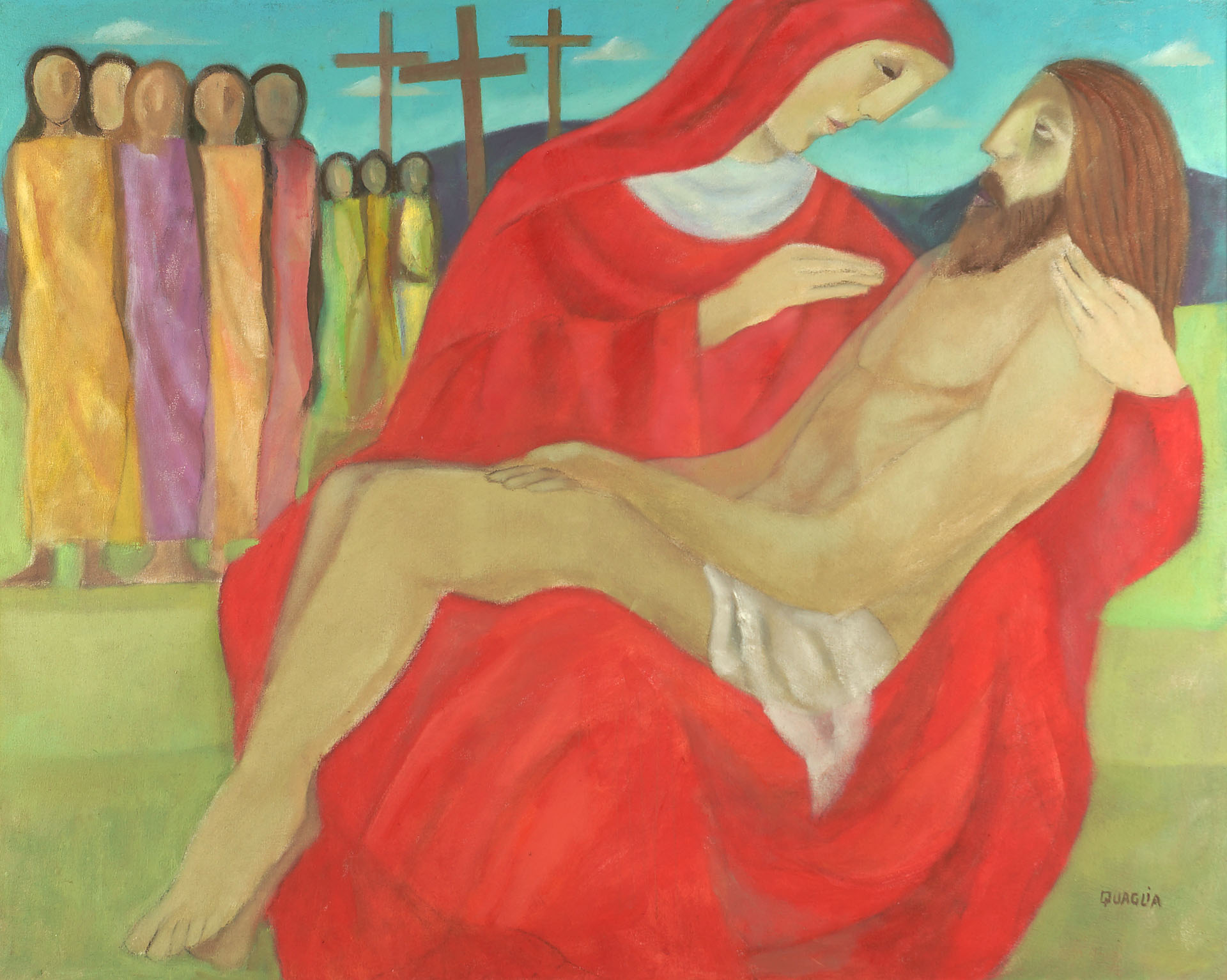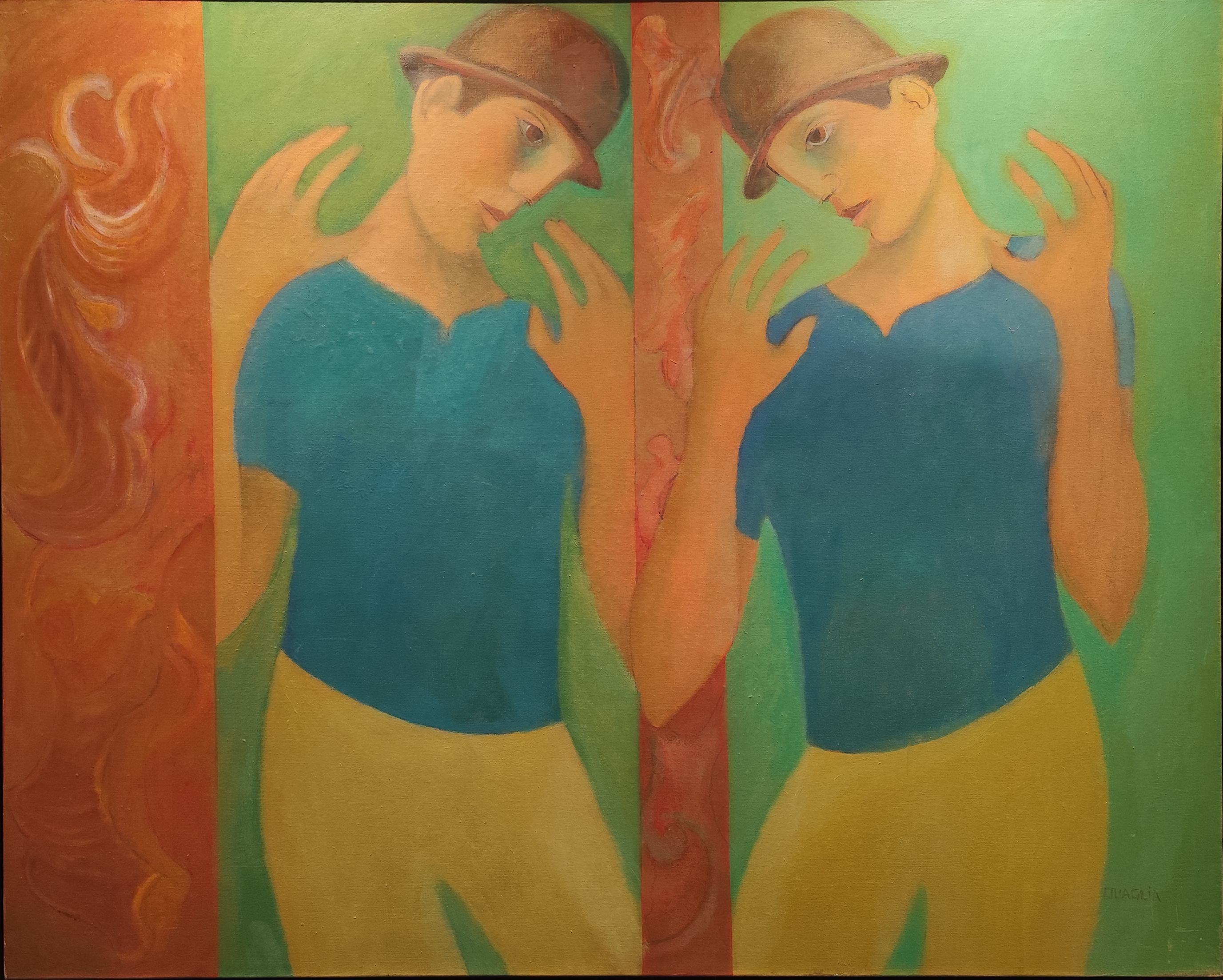 "Quaglia, pintor nascido na Bahia, e envolvido em muitas andanças nacionais e estrangeiras, parece refletir, de forma convincente e madura, a raiz de Segall na pintura contemporânea do Brasil. A melancolia e expressão interiormente solitária dos personagens têm entre ambos sensível familiaridade, apesar do clima romântico com que Quaglia atenua a expressão de carência existencial do nosso tempo. Em fases anteriores, a pintura de Quaglia mostrava uma pele dolorida, expressa em textura que transmitia um transe emotivo. Hoje esta pintura se torna compacta e veludosa, definindo os planos e contrastes numa espécie de modelagem cromática. O desenho também se simplifica, os traços são mínimos em quantidade, embora certos recursos, como a fusão de corpo/roupa/membros em massa única de cor, criem uma surpreendente marca expressiva, liberando os braços e as mãos como raízes de vida. As mãos, por sua vez, passam códigos de comunicação sobre o silêncio, que paira nos rostos num misto de perplexidade e comiseração. Neste sentido quer nos parecer, que na série atual, a mímica é uma constante temática. Numa pintura tão densa e despojada, qualquer detalhe é marcante, e o espectador está sempre à espera de uma revelação, já que o aparelho visual encontra motivos de sobra para comprometer-se numa leitura íntima e solidária. (...)"