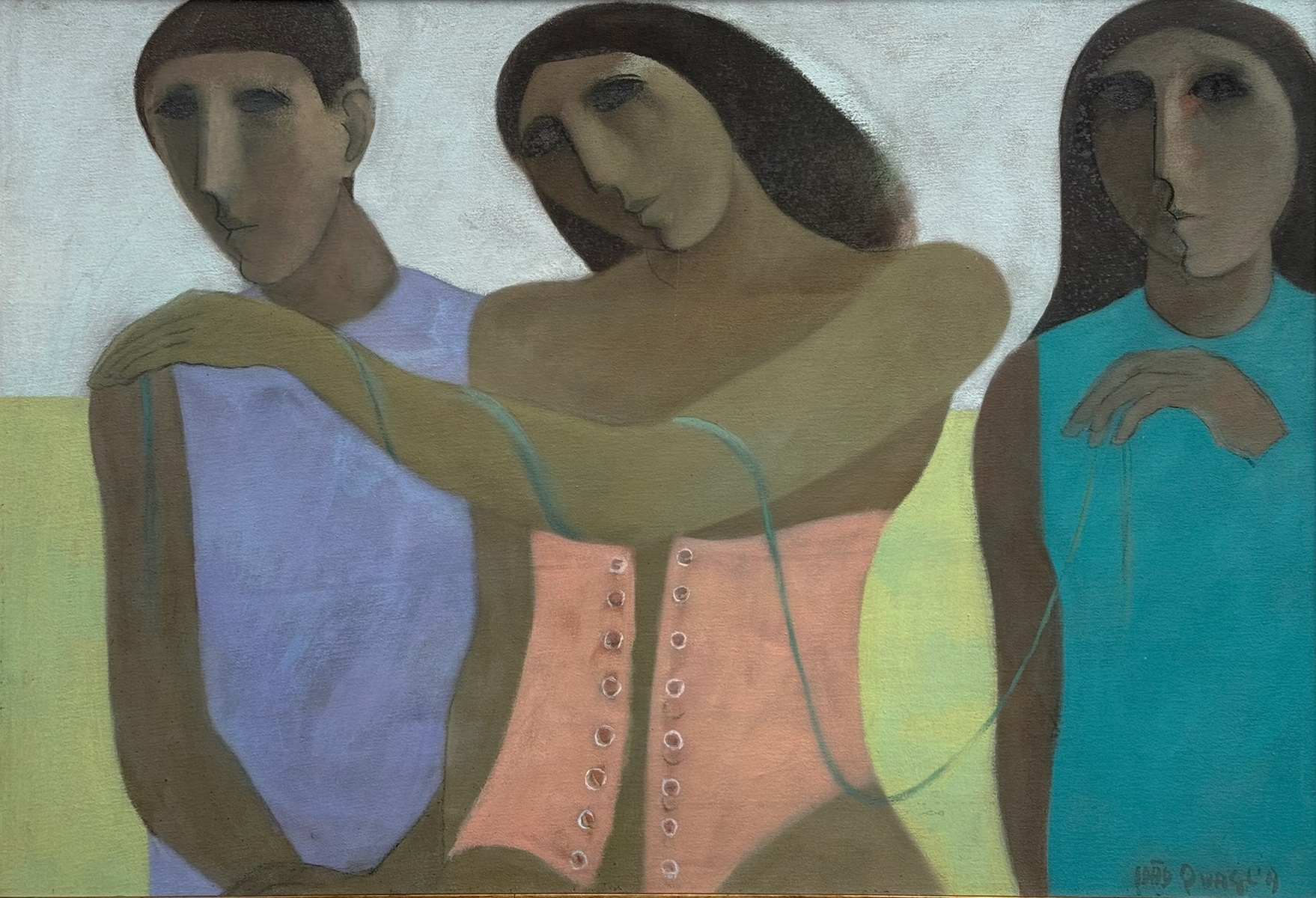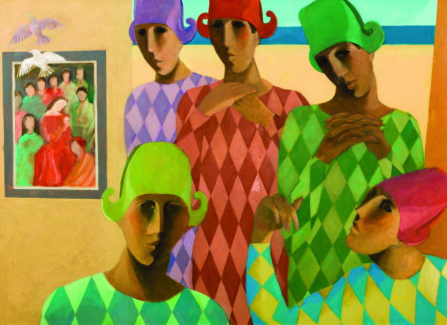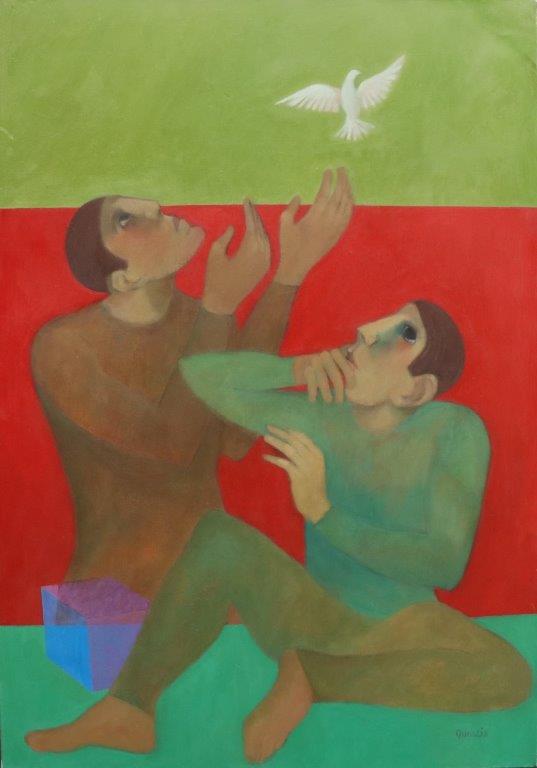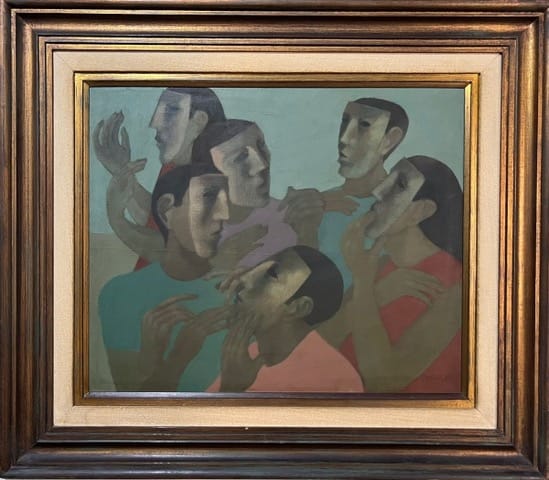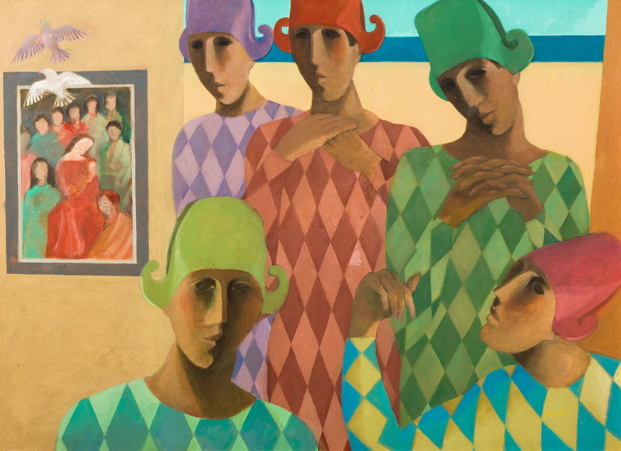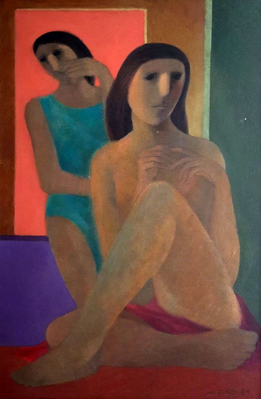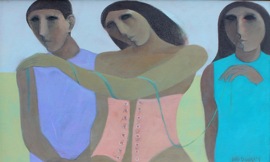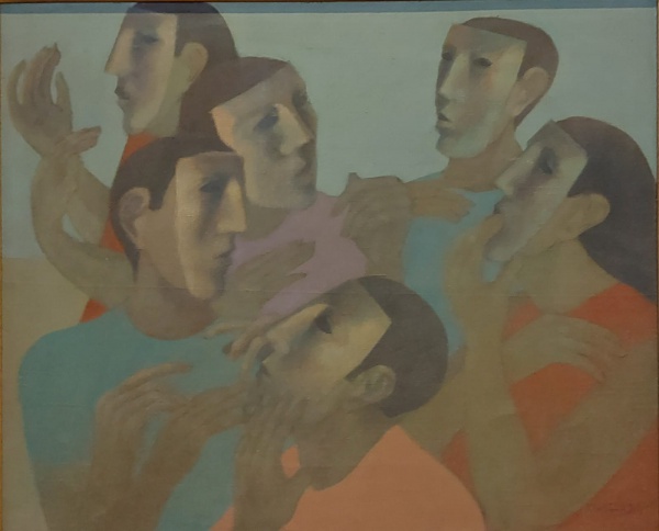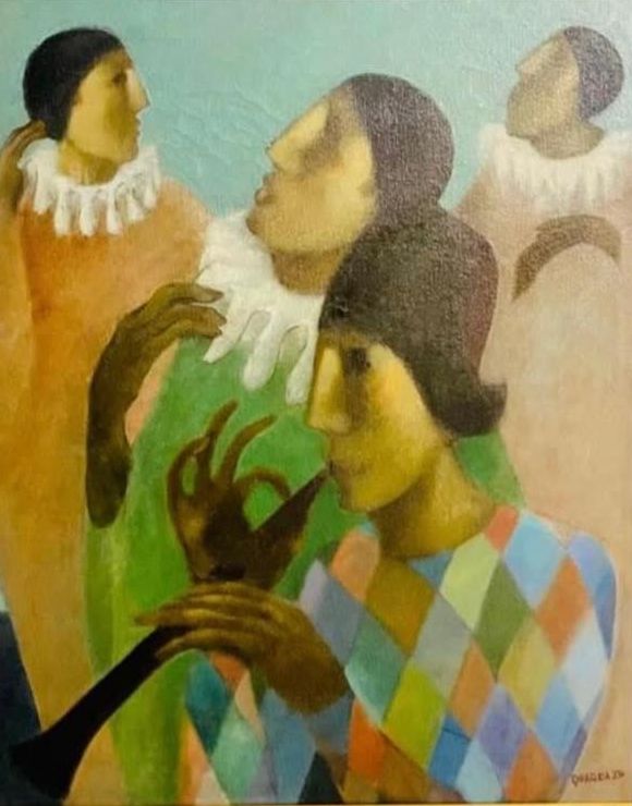 "Quaglia, pintor nascido na Bahia, e envolvido em muitas andanças nacionais e estrangeiras, parece refletir, de forma convincente e madura, a raiz de Segall na pintura contemporânea do Brasil. A melancolia e expressão interiormente solitária dos personagens têm entre ambos sensível familiaridade, apesar do clima romântico com que Quaglia atenua a expressão de carência existencial do nosso tempo. Em fases anteriores, a pintura de Quaglia mostrava uma pele dolorida, expressa em textura que transmitia um transe emotivo. Hoje esta pintura se torna compacta e veludosa, definindo os planos e contrastes numa espécie de modelagem cromática. O desenho também se simplifica, os traços são mínimos em quantidade, embora certos recursos, como a fusão de corpo/roupa/membros em massa única de cor, criem uma surpreendente marca expressiva, liberando os braços e as mãos como raízes de vida. As mãos, por sua vez, passam códigos de comunicação sobre o silêncio, que paira nos rostos num misto de perplexidade e comiseração. Neste sentido quer nos parecer, que na série atual, a mímica é uma constante temática. Numa pintura tão densa e despojada, qualquer detalhe é marcante, e o espectador está sempre à espera de uma revelação, já que o aparelho visual encontra motivos de sobra para comprometer-se numa leitura íntima e solidária. (...)"