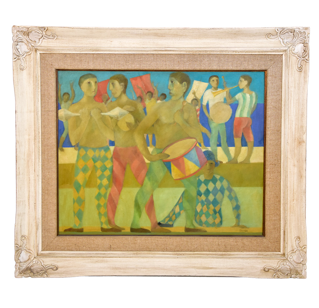 QUAGLIA (João Garboggini Quaglia, Salvador - BA, 20/12/1928 - 2014) "Carnaval", 2005. Óleo sobre tela Assinado no c.i.d. e no verso assinado e datado (2005) Medidas: 80 x 100,5 cm. Emoldurado: 120 x 140 cm. Nascido em Salvador, no ano de 1947, no Rio de Janeiro cursa a Escola Nacional de Belas Artes. Em 1956, realizou os murais para a Base Aérea de Salvador e para a Embaixada Brasileira, em Madri, Espanha. Em 1958, recebeu o prêmio de viagem ao exterior do Salão Nacional de Arte Moderna. Na década de 60, ilustrou para João Cabral de Melo Neto o álbum de litografias "Corrida de Touros". Foi professor na Associação Brasileira de Desenho, na Universidade de Santa Maria, na Escola de Belas Artes de Minas Gerais e até no Festival de Ouro Preto. O livro "QUAGLIA: 50 anos de arte", texto de Mário Margutti; foi lançado no M.N.B.A, Rio de Janeiro em 2002.