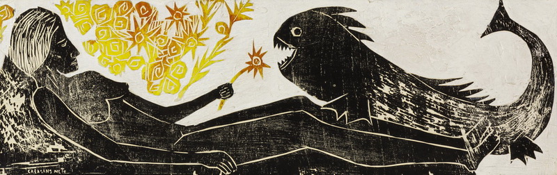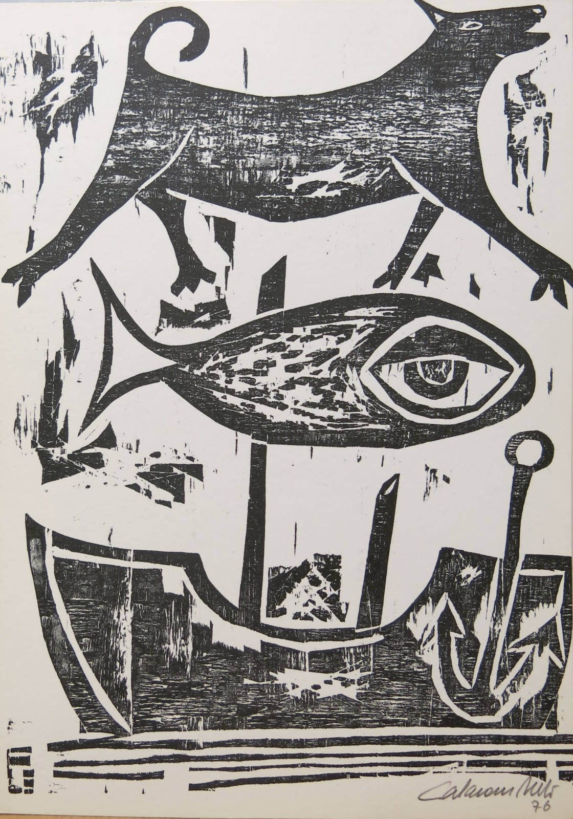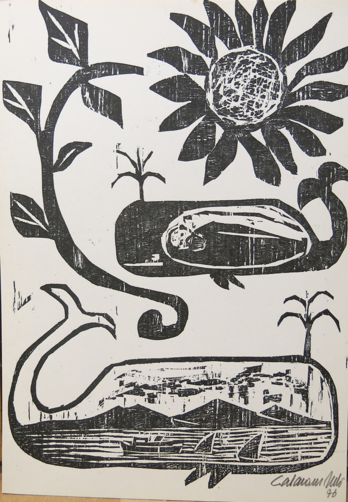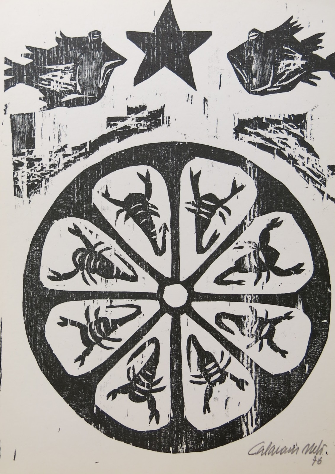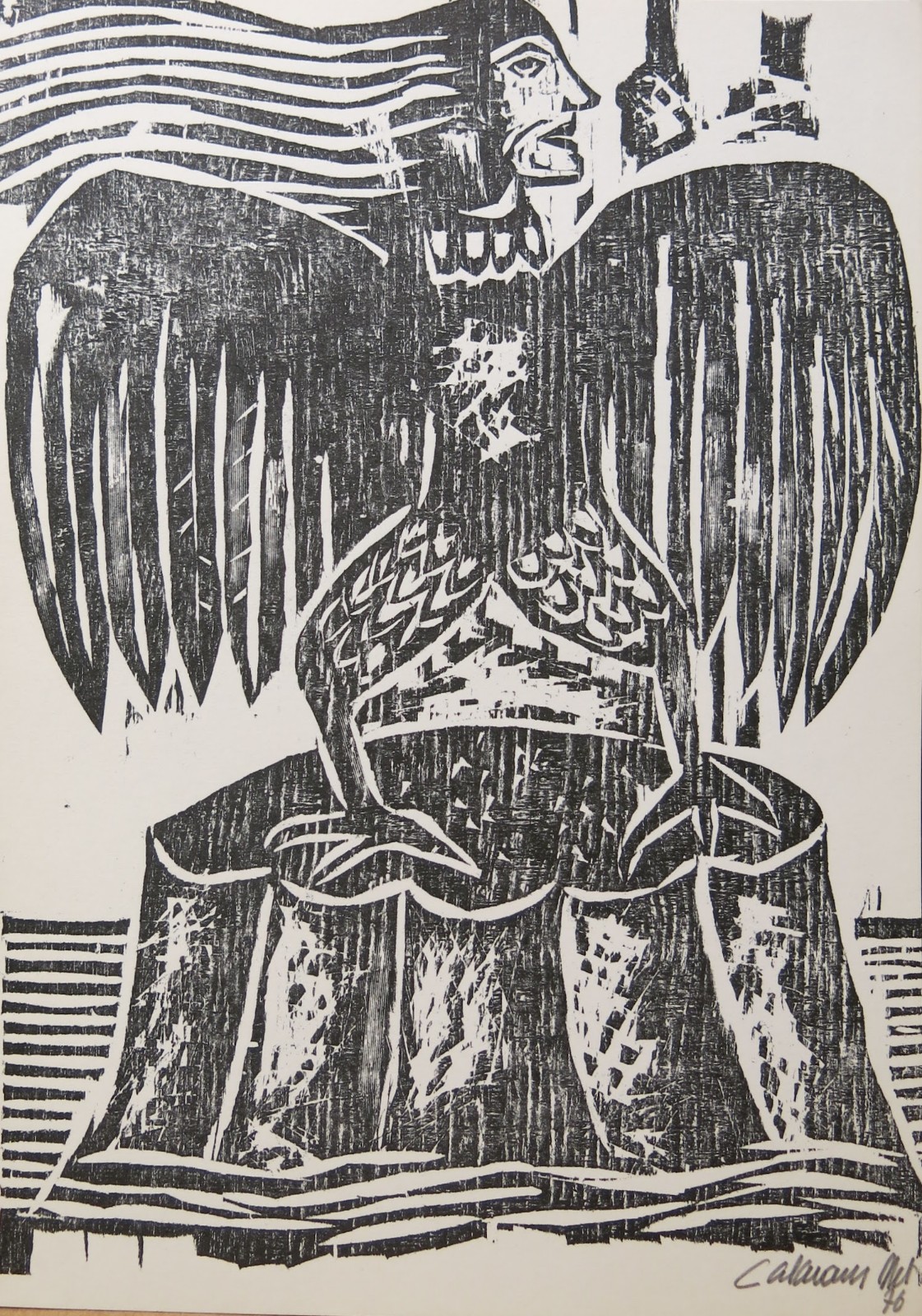 José Júlio Calasans Neto (Salvador BA 1932 - idem 2006). Pintor, gravador, ilustrador, desenhista, entalhador e cenógrafo. Estuda pintura com Genaro de Carvalho. Na Escola de Belas Artes da Universidade Federal da Bahia, UFBA, tem aulas de gravura com Mario Cravo Júnior. Em Salvador funda, com outros artistas, a Jogralesca (teatralização de poemas), a revista Mapa e a Editora Macunaíma. Especializa-se em gravura em metal e madeira e empenha-se na relação da gravura com a cultura popular e o cordel. Entre 1956 e 1965, cria cenários para produções como Deus e o Diabo na Terra do Sol, de Glauber Rocha, e Eles Não Usam Black-Tie, de Gianfrancesco Guarnieri. Ilustra romances como Tereza Batista Cansada de Guerra e Tieta do Agreste, de Jorge Amado. Nos anos 80 passa a dedicar-se também à pintura.