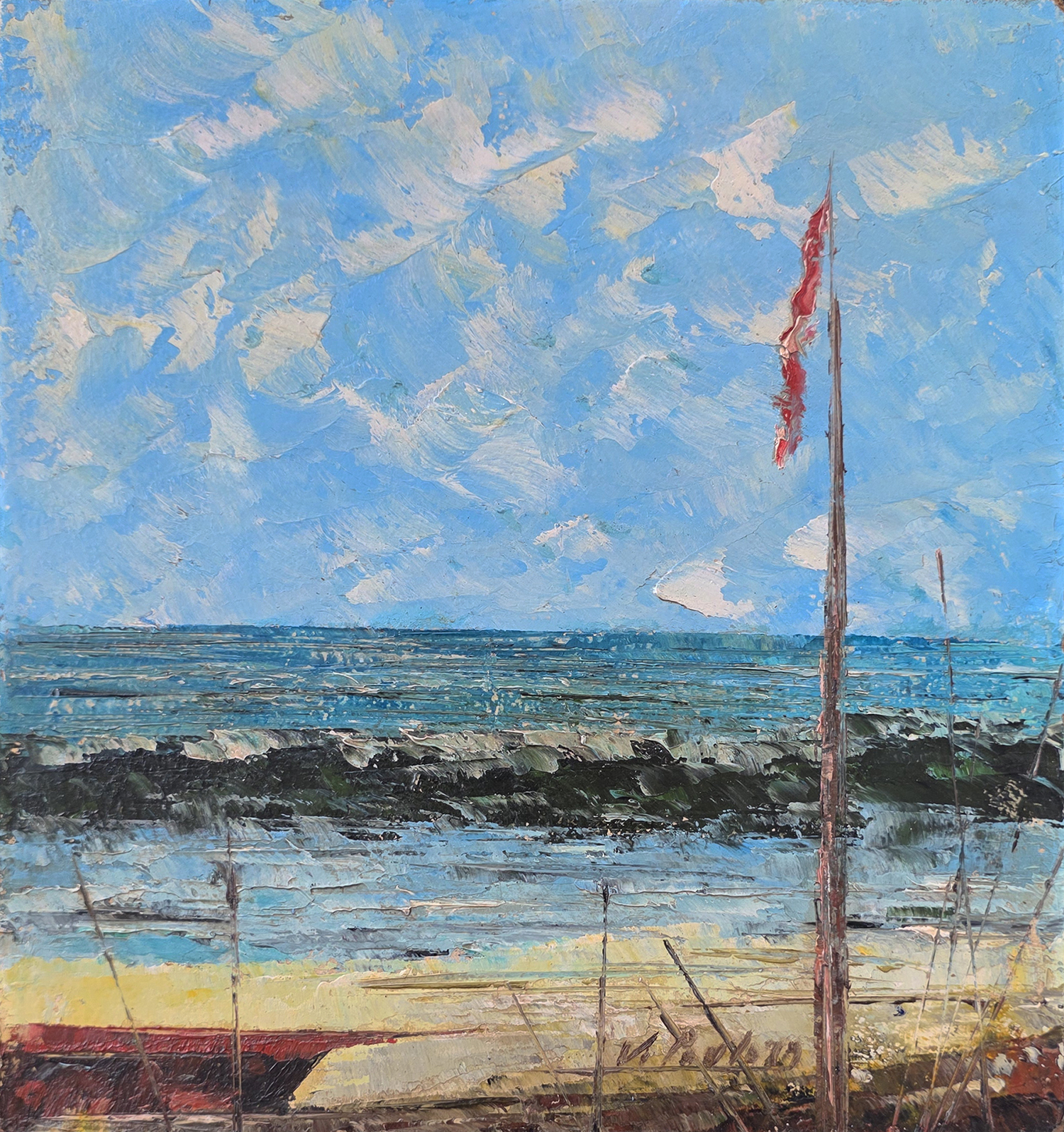 José Paulo Moreira da Fonseca - Cores quentes sobre o mar - 1962 - Óleo sobre tela - Assinado canto inferior direito - 27 x 35 cm.