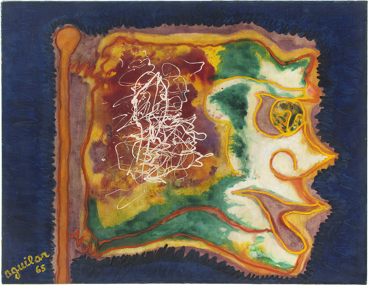 José Roberto Aguilar (São Paulo SP 1941). Pintor, videomaker, performer, escultor, escritor, músico e curador. Autodidata, integra o movimento performático-literário Kaos, em 1956, com Jorge Mautner (1941) e José Agripino de Paula (1937-2007). Em 1963, expõe pinturas na 7ª Bienal Internacional de São Paulo. Considerado um dos pioneiros da nova figuração no Brasil, participa da mostra Opinião 65, no Museu de Arte Moderna do Rio de Janeiro (MAM/RJ), em 1965. Nessa época, passa a pintar com spray e pistola de ar comprimido. Vive em Londres, entre 1969 e 1972, e em Nova York, entre 1974 e 1975, época em que inicia suas experimentações com vídeo. Volta a morar em São Paulo em 1976. No ano seguinte, participa da 14ª Bienal Internacional de São Paulo com a instalação Circo Antropofágico Ambulante Cósmico e Latino-Americano Apresenta Esta Noite: A Transformação Permanente do Tabu em Totem, em que expõe 12 monitores de TV no palco do Teatro Ruth Escobar. Em 1981, cria o grupo musical Banda Performática e lança o livro A Divina Comédia Brasileira. Torna-se discípulo do líder espiritual indiano Rajneesh, em 1983, e começa a assinar suas telas como Aguilar Vigyan. Em 1989, realiza a performance Tomada da Bastilha, com a participação de 300 artistas, assistida por cerca de 10 mil pessoas em São Paulo. Nos anos 1990, faz pinturas em telas gigantes e esculturas em vidro e cerâmica. De 1995 a 2002, é diretor do espaço cultural Casa das Rosas, em São Paulo. Em 2003, Aguilar é nomeado representante do Ministério da Cultura na capital paulista.