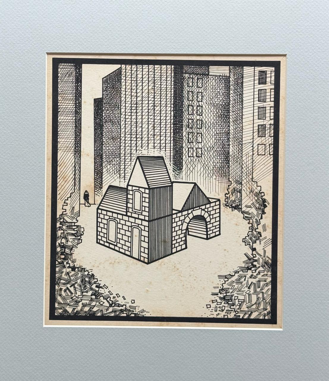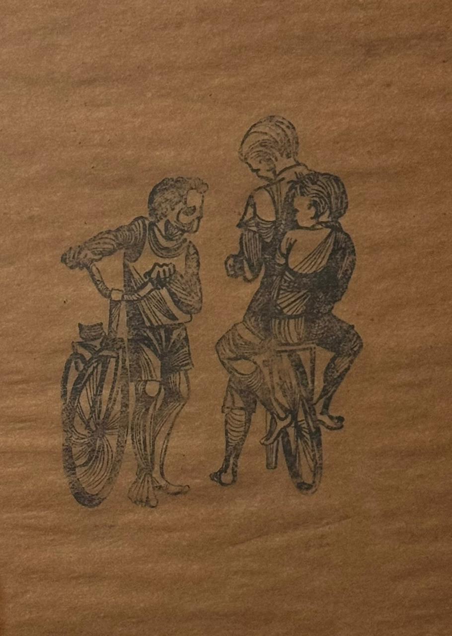 JUAREZ MACHADO "CICLISTA SOBRE TELHADOS" DESENHO ORIGINAL EM BICO DE PENA. CARIMBO NO VERSO: PUBLICADA EM 21-11-1970 - ARQUIVO JB- ARQUIVO DE FOTOGRAFIAS.CADERNO 3, PÁGINA 3. INSCRIÇÃO A PRÓPRIO PUNHO: "COLUNA SEMANAL NONSENSE PARA O JORNAL DO BRASIL RIO, 1970" MED: 35 X 25 CM.