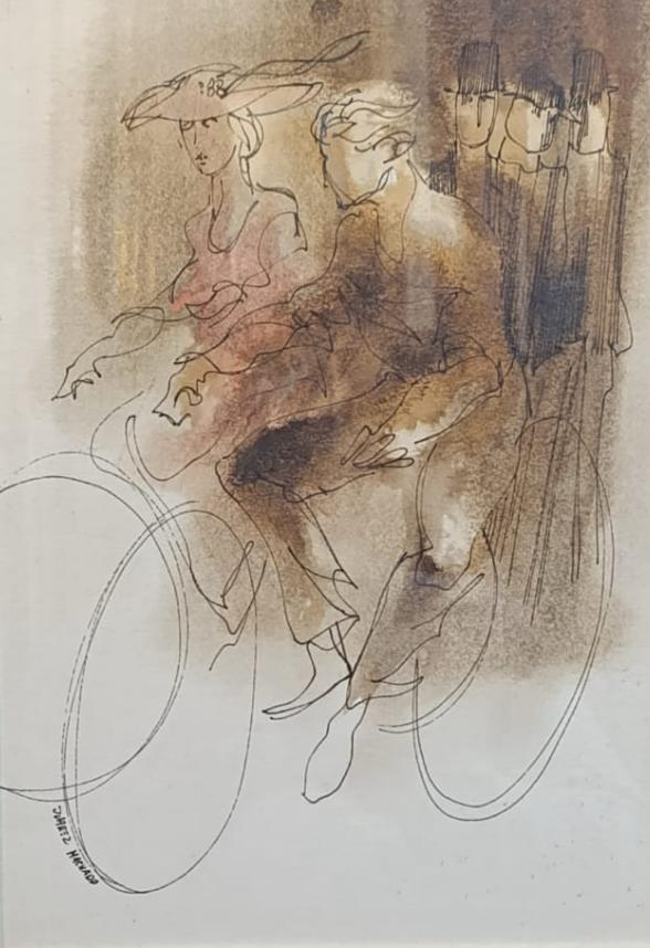 JUAREZ MACHADO "CICLISTA SOBRE TELHADOS" DESENHO ORIGINAL EM BICO DE PENA. CARIMBO NO VERSO: PUBLICADA EM 21-11-1970 - ARQUIVO JB- ARQUIVO DE FOTOGRAFIAS.CADERNO 3, PÁGINA 3. INSCRIÇÃO A PRÓPRIO PUNHO: "COLUNA SEMANAL NONSENSE PARA O JORNAL DO BRASIL RIO, 1970" MED: 35 X 25 CM.