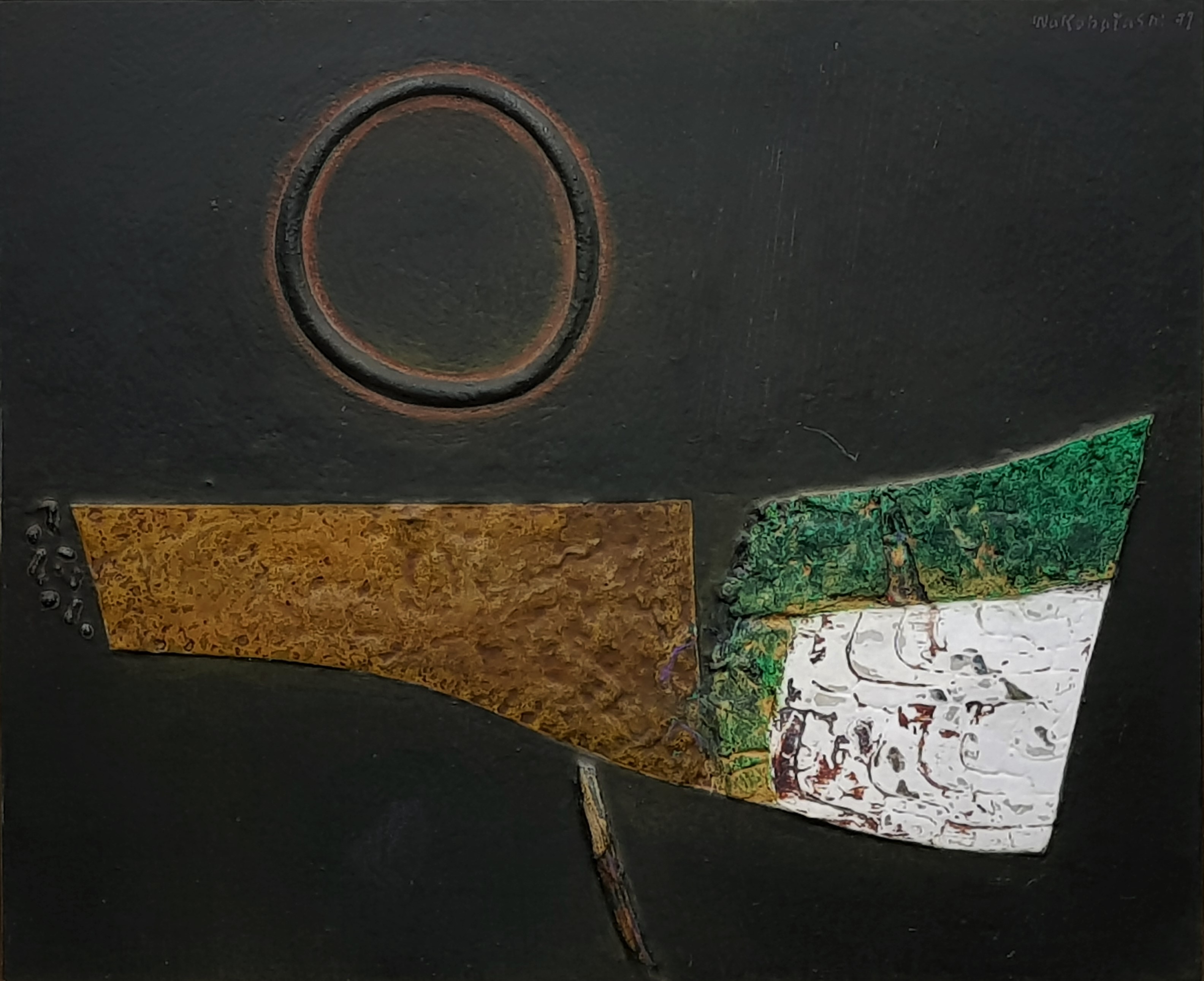 Kazuo Wakabayashi - Sem título. Acrílica e cola sobre eucatex, 16x22 cm, déc. 70, A.C.S.D. Com moldura