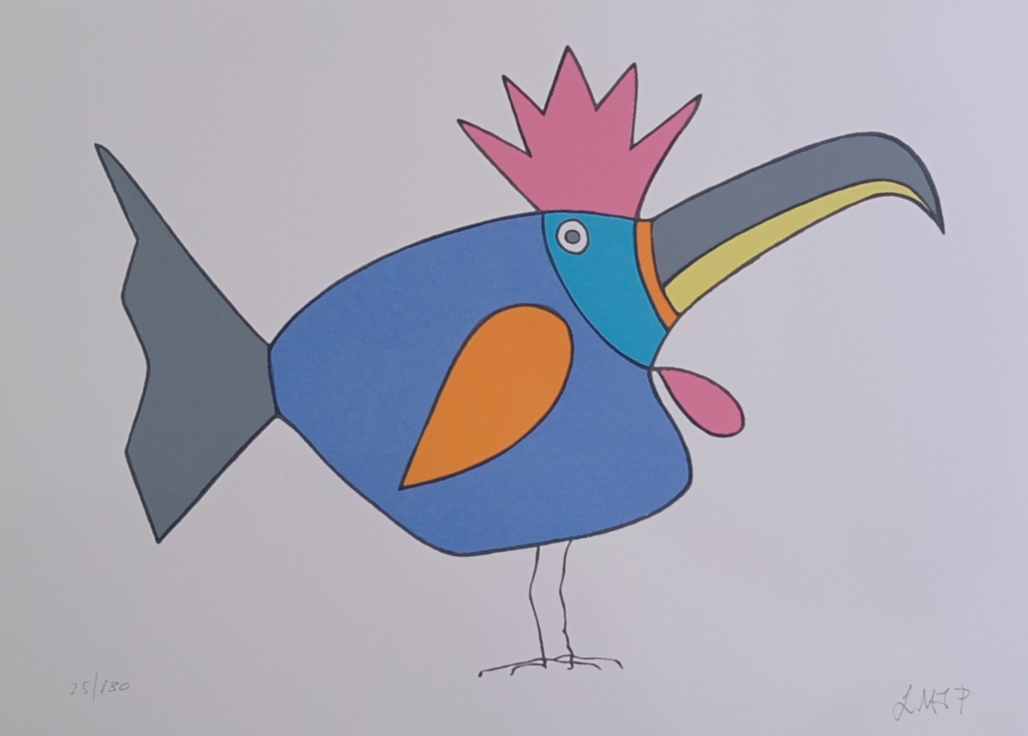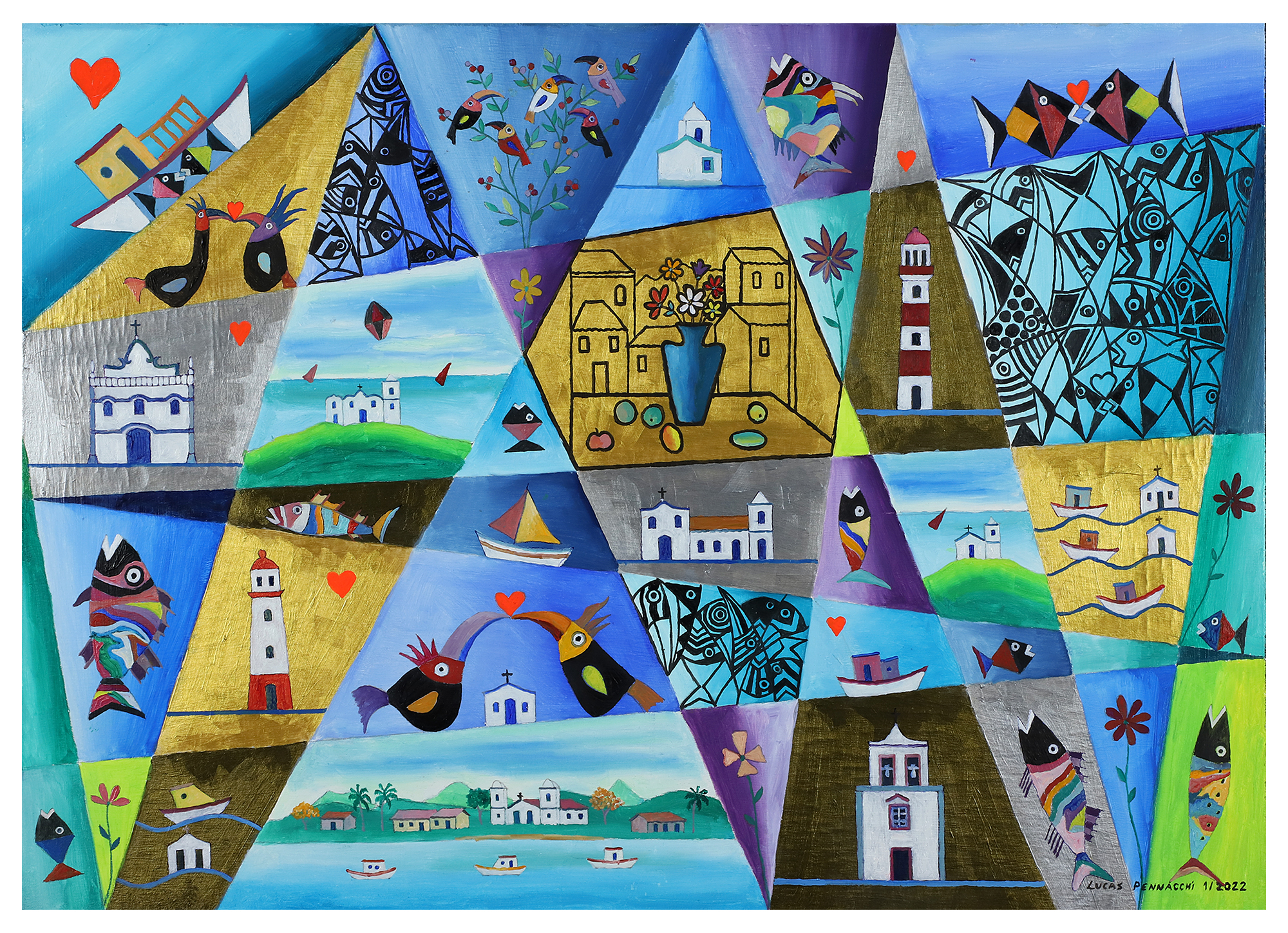 líricas e carregadas de emoção, ele nos surpreende com pássaros bicudos e engraçados e ainda nos apresenta composições rebuscadas e atraentes de peixes coloridos “voando no espaço”. O artista usa o suporte clássico do acrílico e tinta plástica sobre placa “com areia”, cria gravura na técnica da serigrafia e da xilogravura, gosta de pintar em objetos de cerâmica, e ainda se dedica a elaboração de mosaicos.