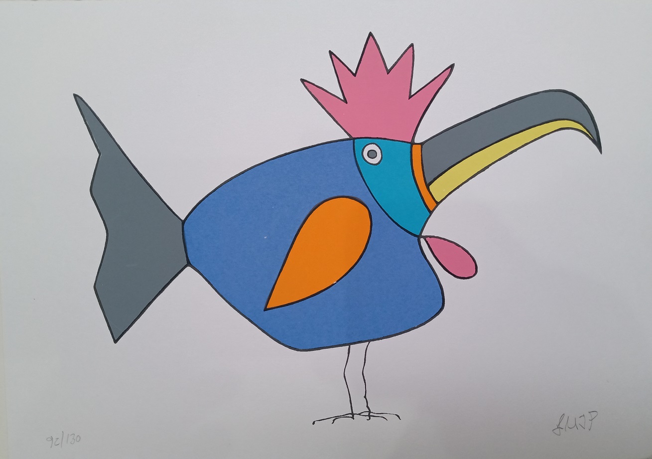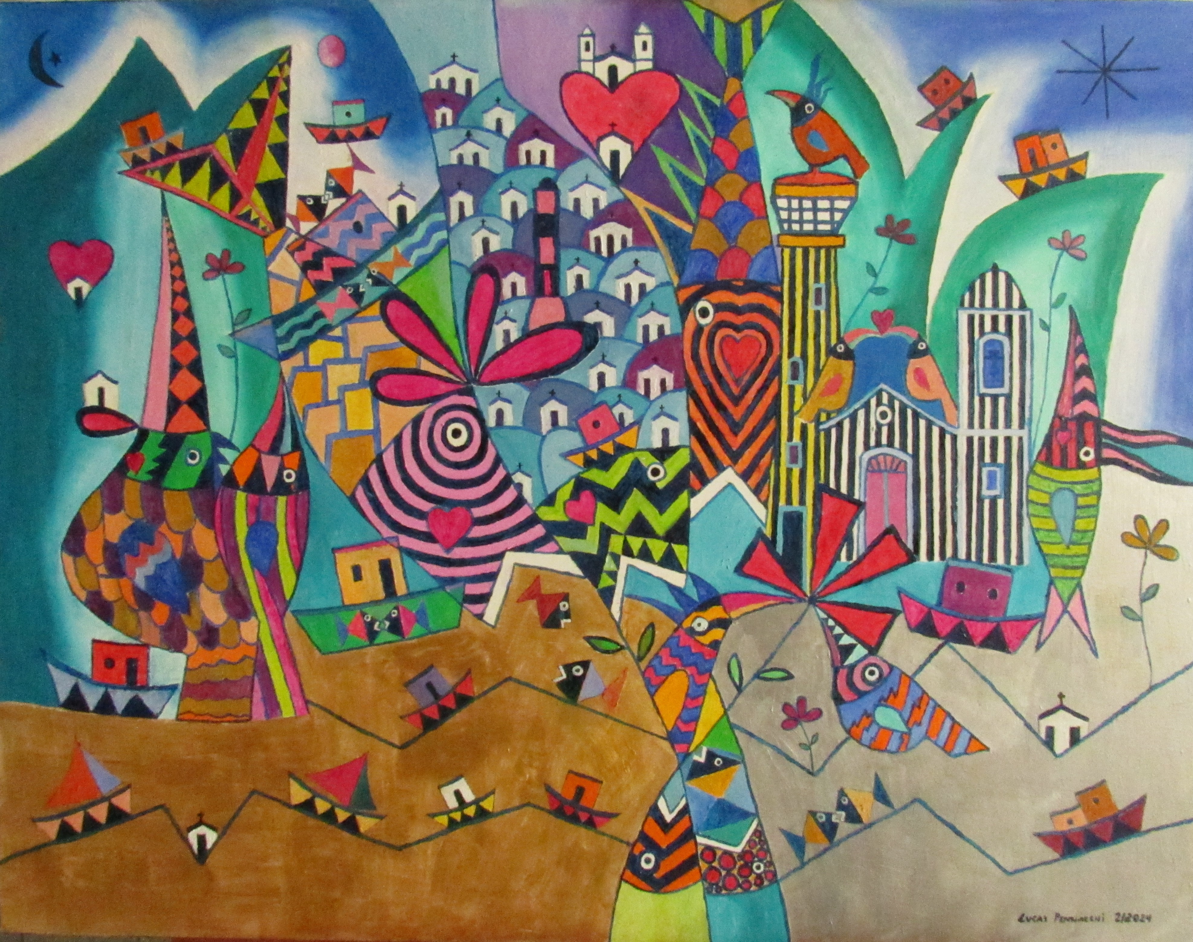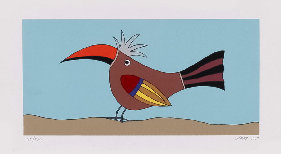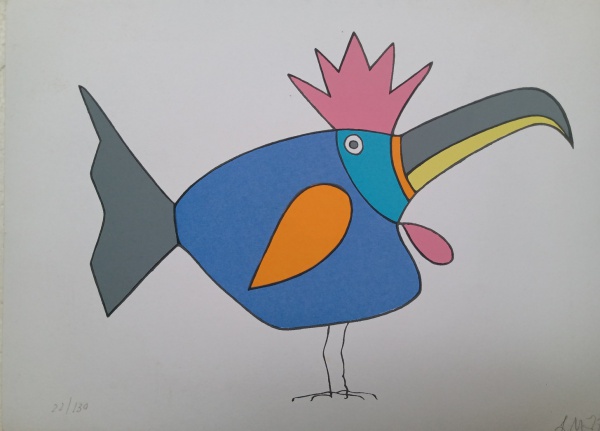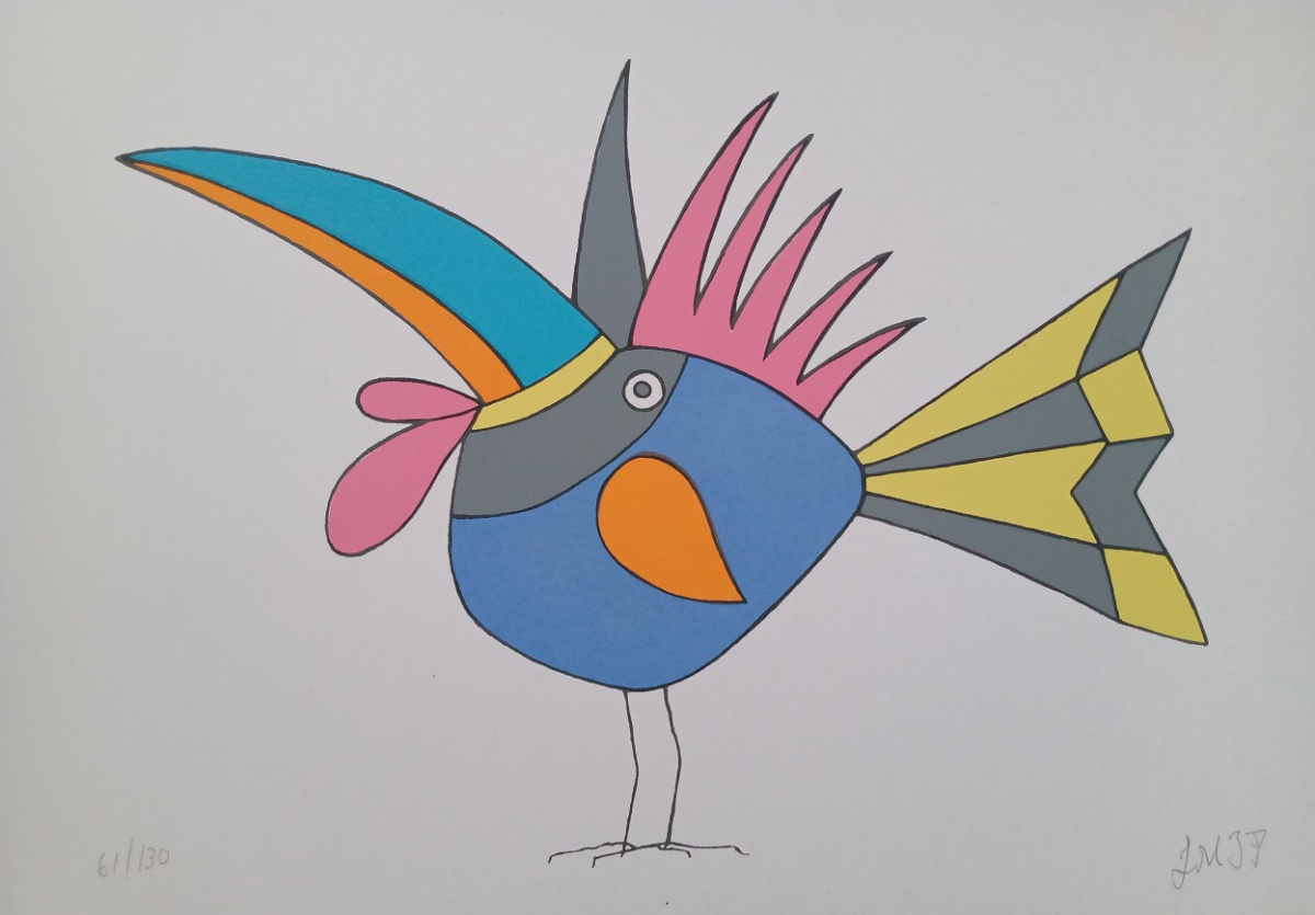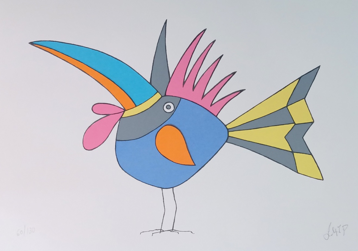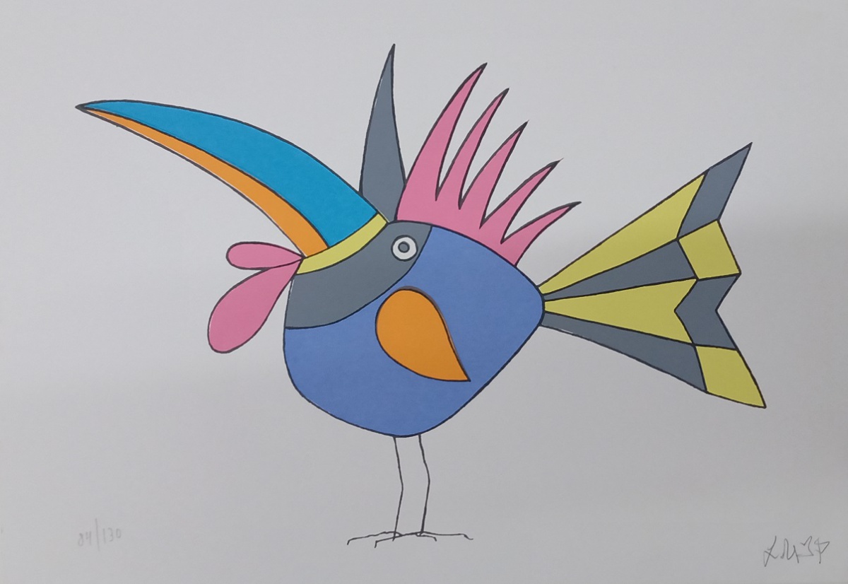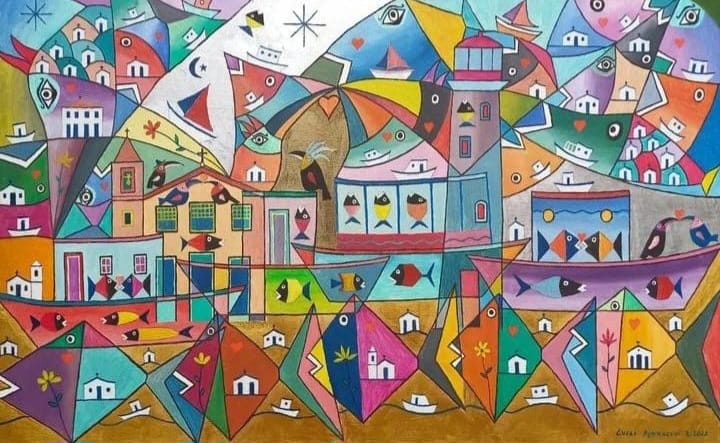 líricas e carregadas de emoção, ele nos surpreende com pássaros bicudos e engraçados e ainda nos apresenta composições rebuscadas e atraentes de peixes coloridos “voando no espaço”. O artista usa o suporte clássico do acrílico e tinta plástica sobre placa “com areia”, cria gravura na técnica da serigrafia e da xilogravura, gosta de pintar em objetos de cerâmica, e ainda se dedica a elaboração de mosaicos.