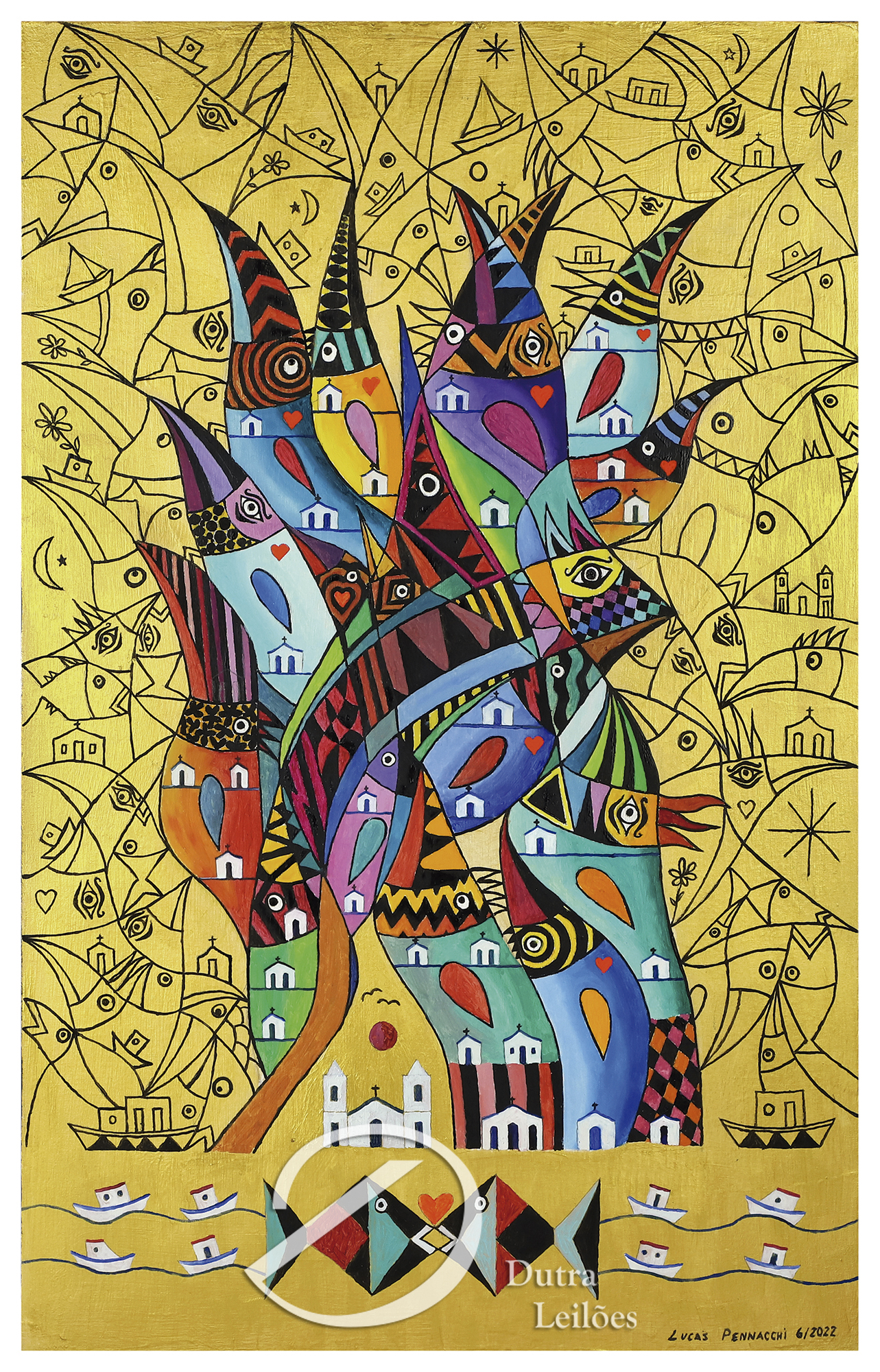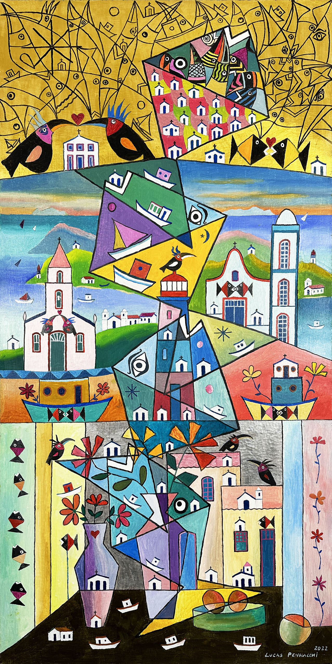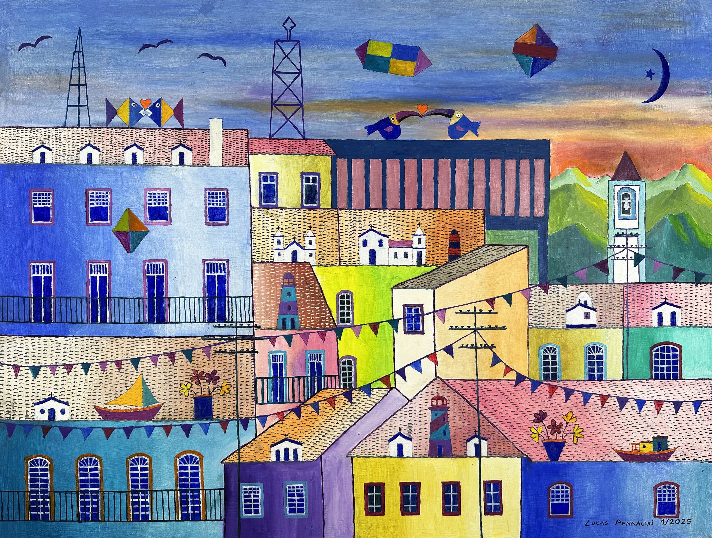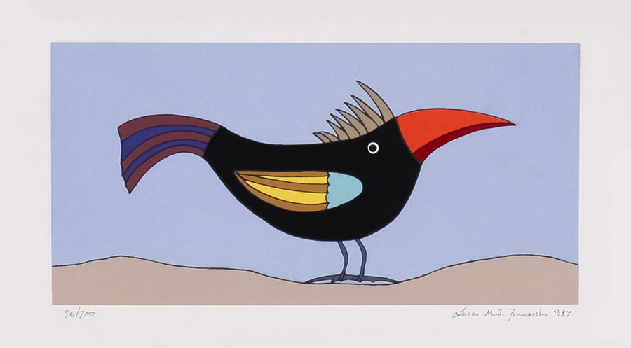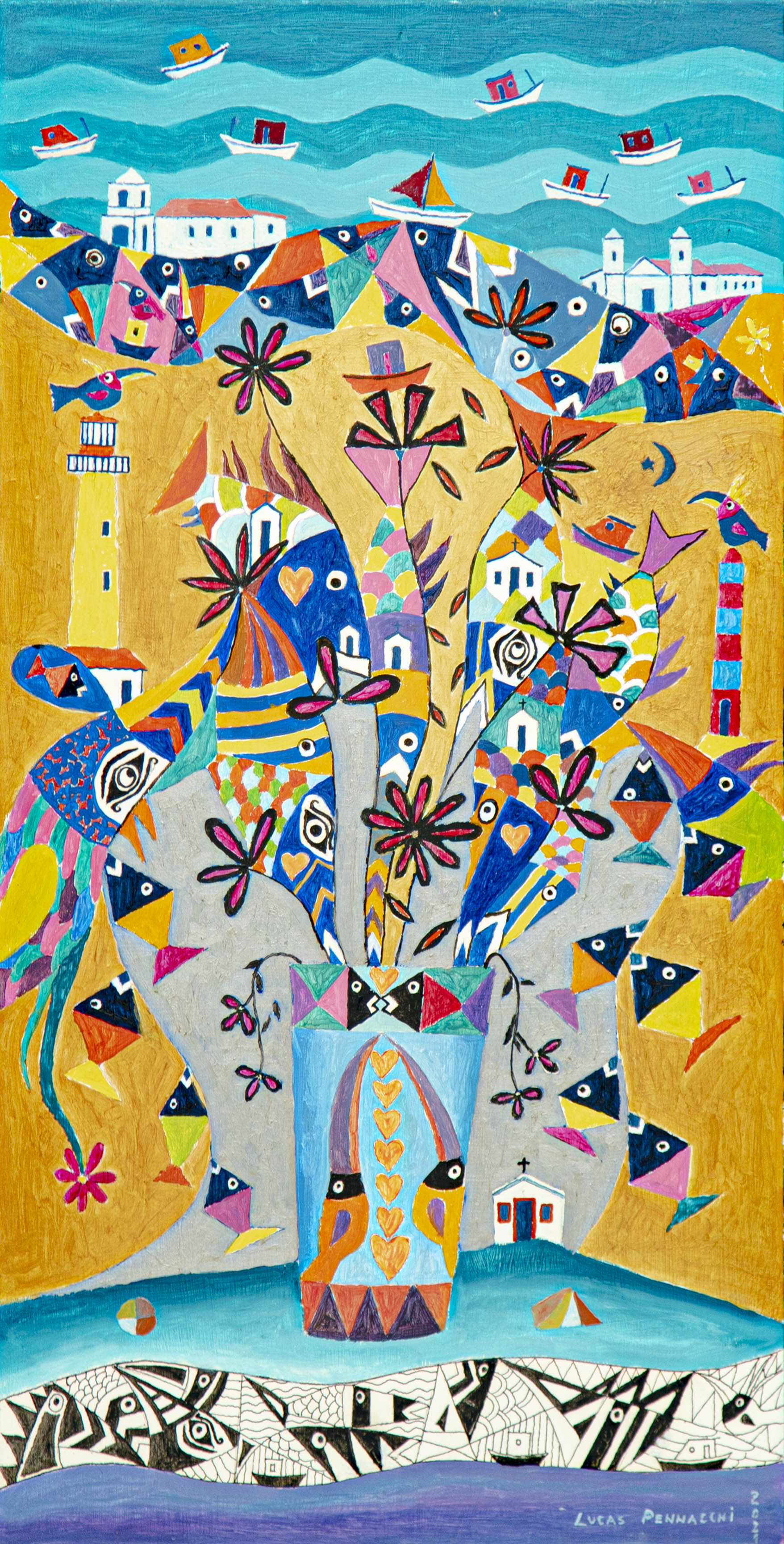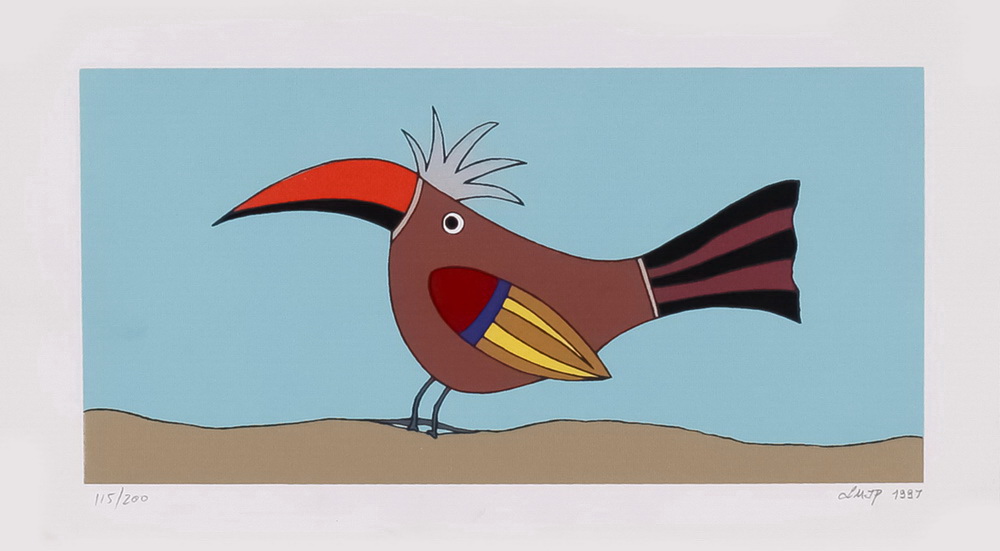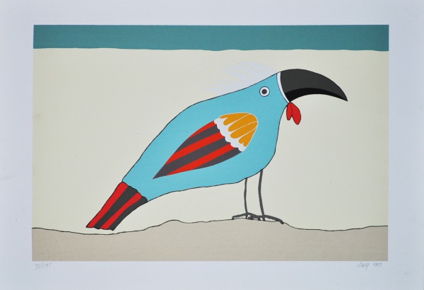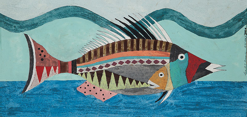 líricas e carregadas de emoção, ele nos surpreende com pássaros bicudos e engraçados e ainda nos apresenta composições rebuscadas e atraentes de peixes coloridos “voando no espaço”. O artista usa o suporte clássico do acrílico e tinta plástica sobre placa “com areia”, cria gravura na técnica da serigrafia e da xilogravura, gosta de pintar em objetos de cerâmica, e ainda se dedica a elaboração de mosaicos.