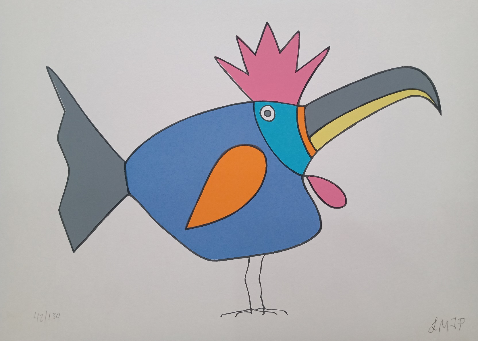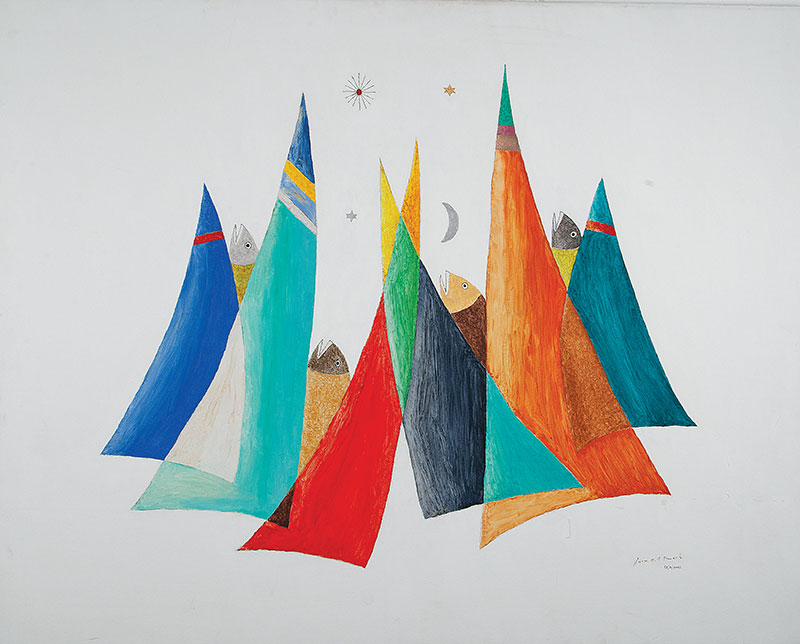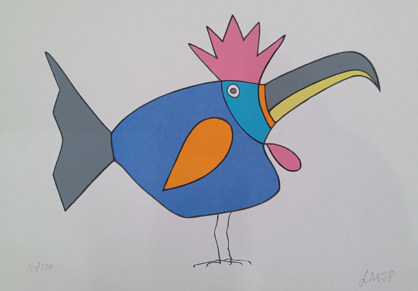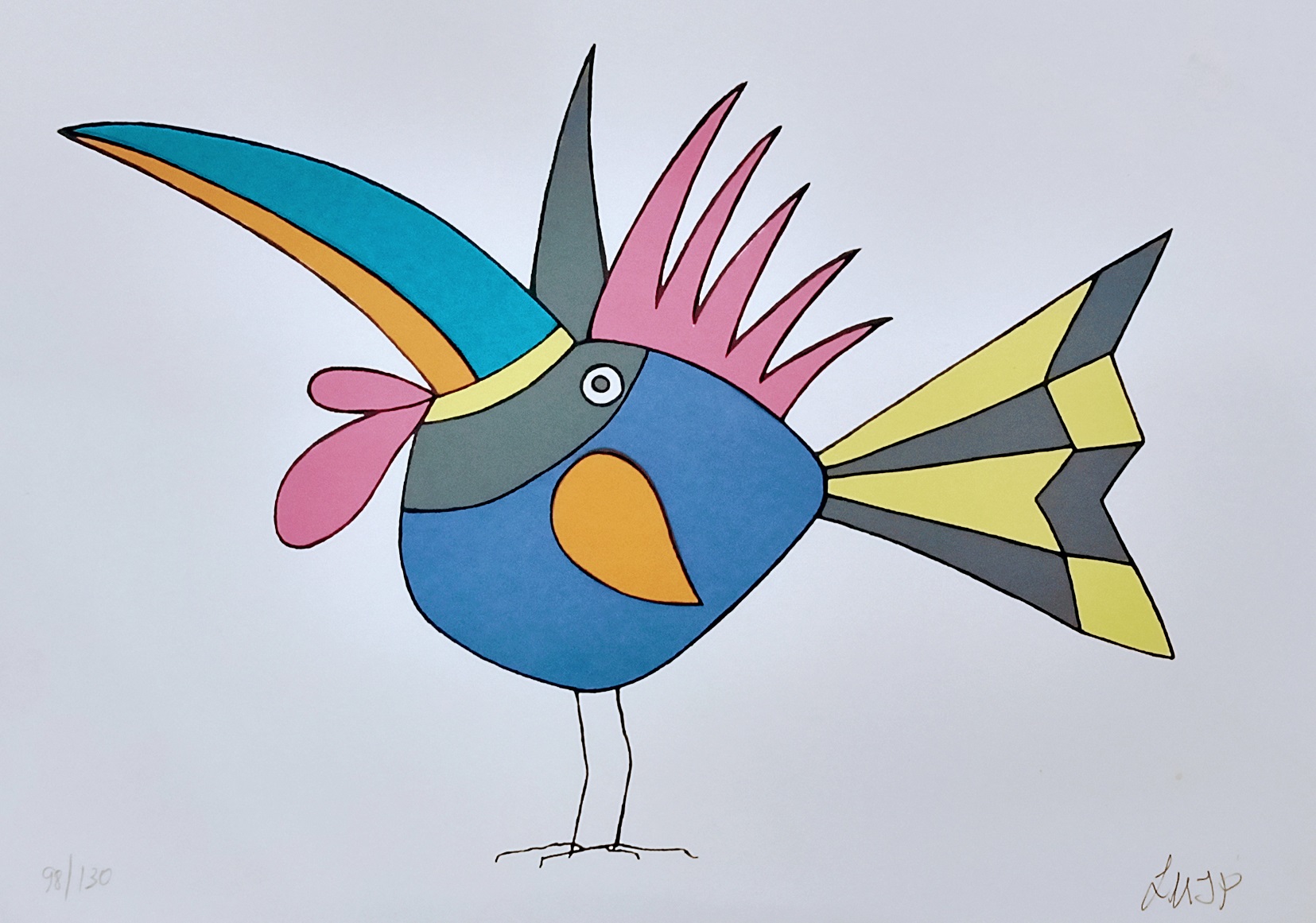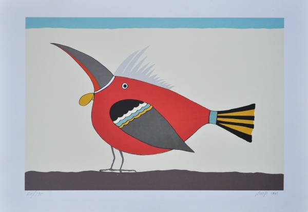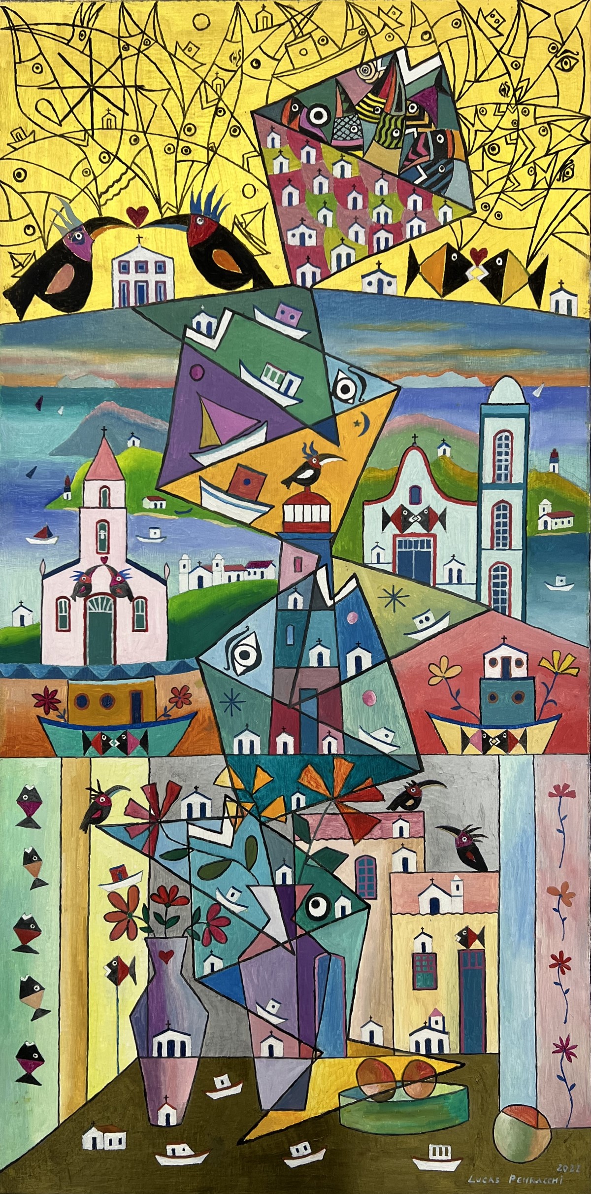 líricas e carregadas de emoção, ele nos surpreende com pássaros bicudos e engraçados e ainda nos apresenta composições rebuscadas e atraentes de peixes coloridos “voando no espaço”. O artista usa o suporte clássico do acrílico e tinta plástica sobre placa “com areia”, cria gravura na técnica da serigrafia e da xilogravura, gosta de pintar em objetos de cerâmica, e ainda se dedica a elaboração de mosaicos.