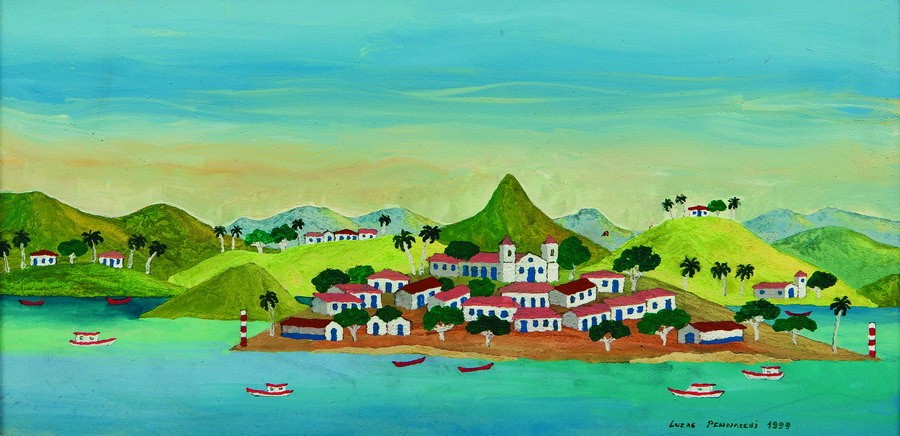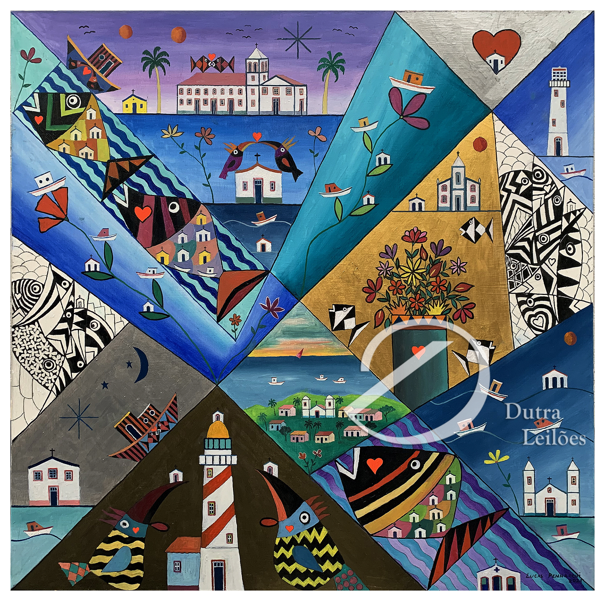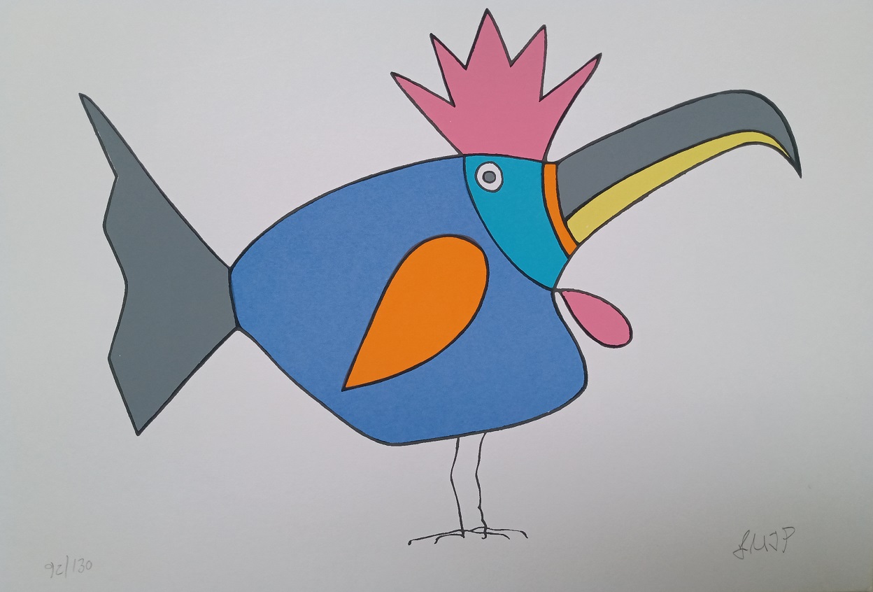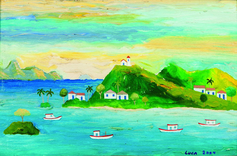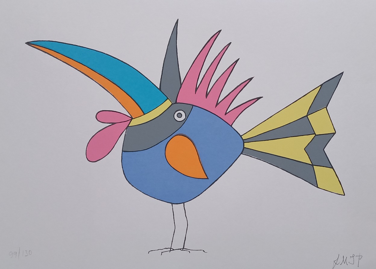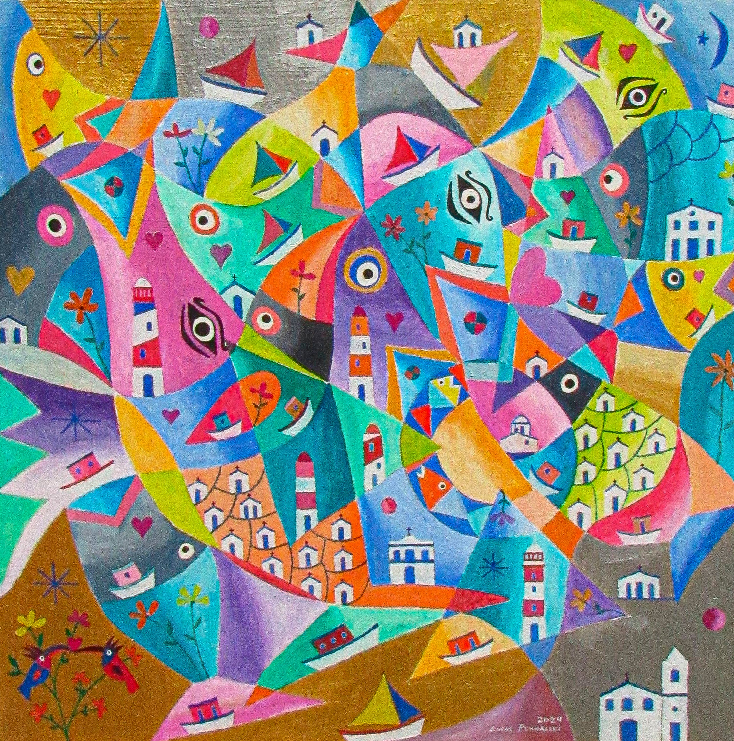 líricas e carregadas de emoção, ele nos surpreende com pássaros bicudos e engraçados e ainda nos apresenta composições rebuscadas e atraentes de peixes coloridos “voando no espaço”. O artista usa o suporte clássico do acrílico e tinta plástica sobre placa “com areia”, cria gravura na técnica da serigrafia e da xilogravura, gosta de pintar em objetos de cerâmica, e ainda se dedica a elaboração de mosaicos.