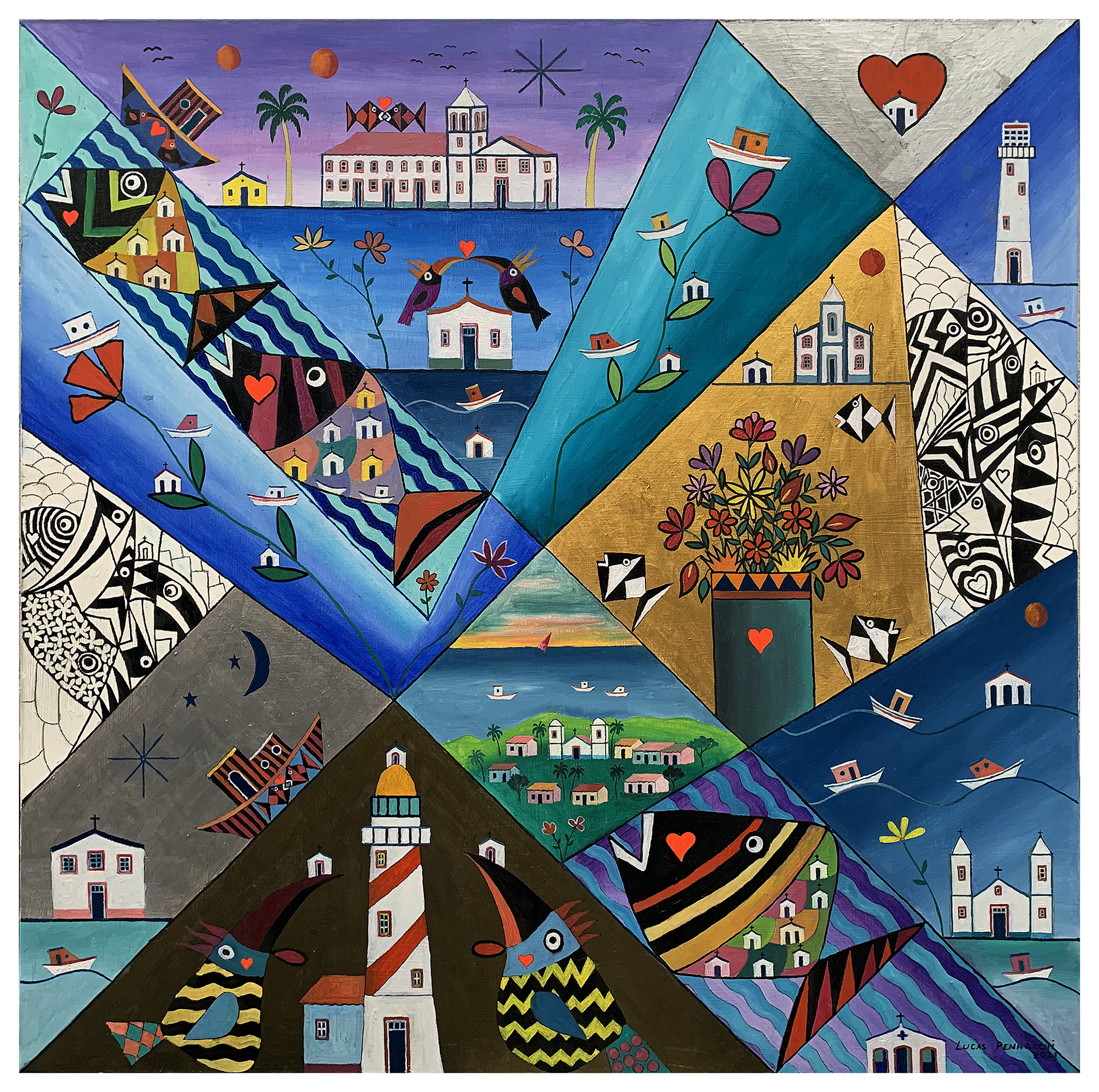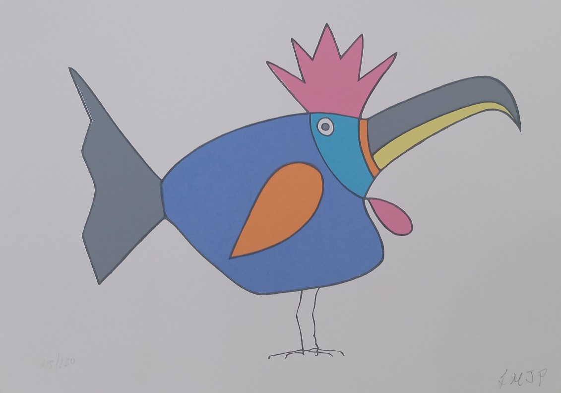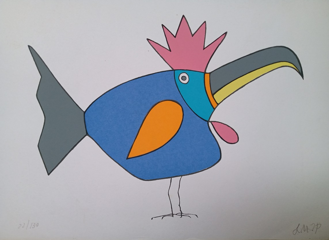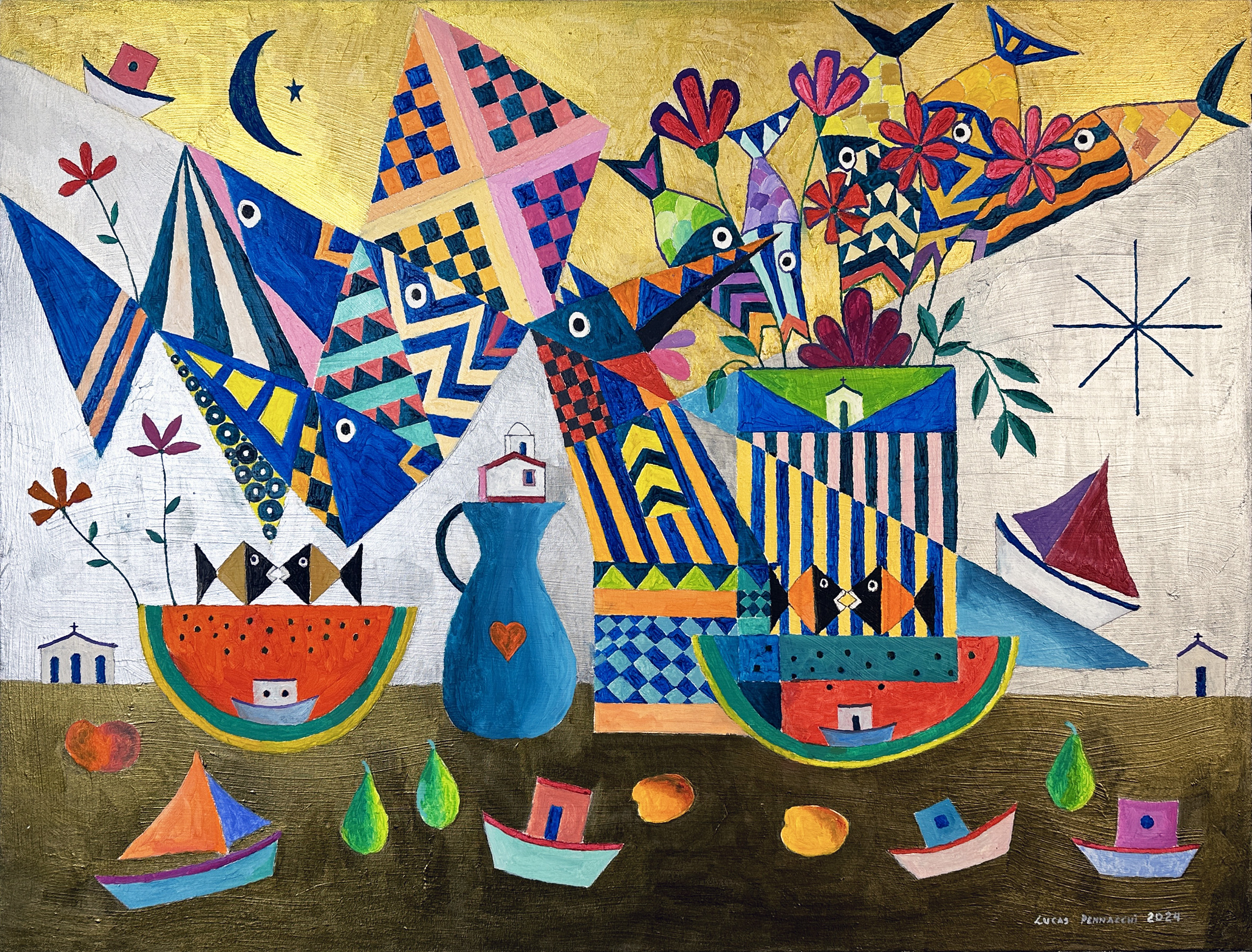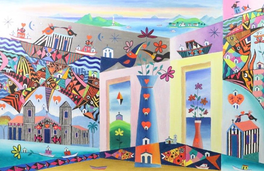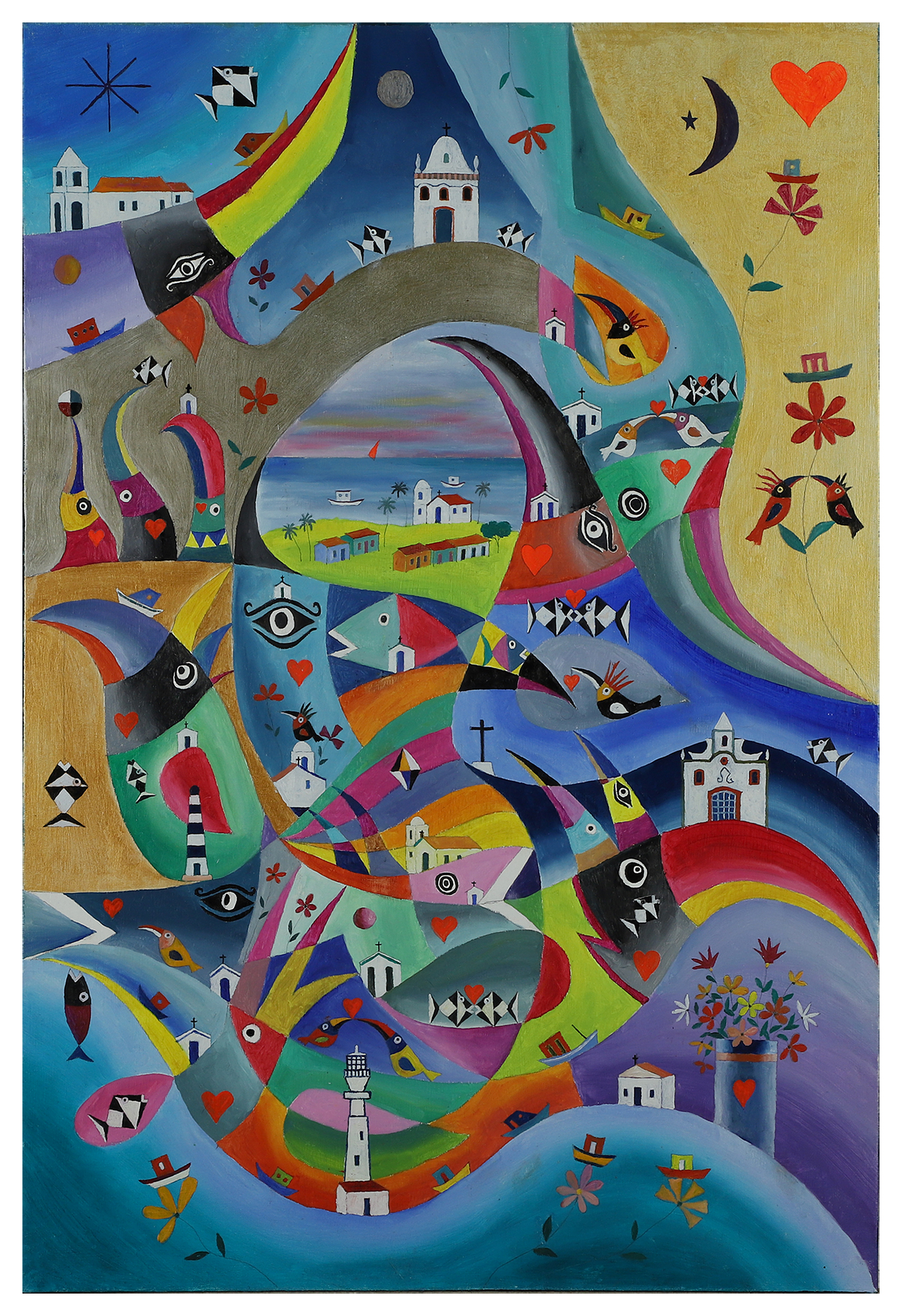 líricas e carregadas de emoção, ele nos surpreende com pássaros bicudos e engraçados e ainda nos apresenta composições rebuscadas e atraentes de peixes coloridos “voando no espaço”. O artista usa o suporte clássico do acrílico e tinta plástica sobre placa “com areia”, cria gravura na técnica da serigrafia e da xilogravura, gosta de pintar em objetos de cerâmica, e ainda se dedica a elaboração de mosaicos.