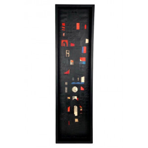 LYRIA PALOMBINI – Sem Título, 1992. Obra em técnica mista com tinta acrílica, colagem e materiais diversos sobre Eucatex, composta por fragmentos de couro e cartão — alguns com relevo, possivelmente derivados de gravuras da própria artista. A composição abstrata, marcada por texturas e contrastes, evidencia o domínio técnico e a sensibilidade construtiva de Lyria Palombini, cuja produção transita entre a gravura e a pintura matérica. Assinada, datada e localizada no verso: São Paulo, 1992. Dimensões: Imagem 30 × 120 cm | Moldura 34 × 124 cm.