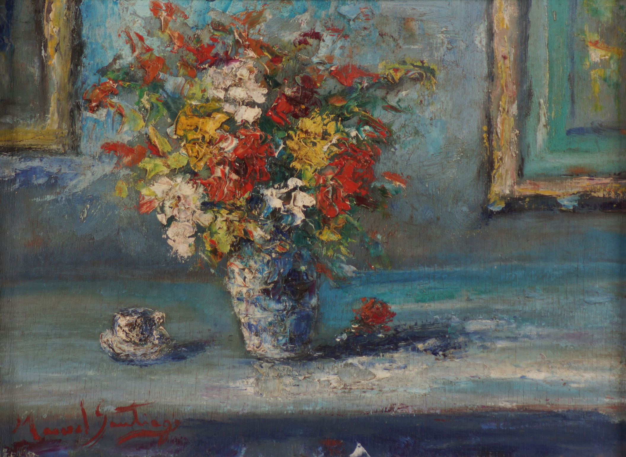 Em paris seu núcleo de convívio écom velhos amigos como: Di Cavalcanti, Quirino Campofiorito, Armando Vianna e Candido Portinari, que se reunião no Café La Rotonde, de Montpamasse, Aliás, todos estudaram juntos com Chambelland e Batista da Costa no Rio de Janeiro. Portinari e Santiago tinham uma relação próxima e partilhavam do  contexto de redefinição da arte nacional, onde Santiago imprimiu a valorização das lendas da Amazônia um instrumento de nacionalização da arte.