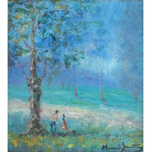 Manoel Santiago - Banhistas e veleiros - 24,5 x 29 cm - Óleo sobre madeira - Assinatura canto inferior esquerdo