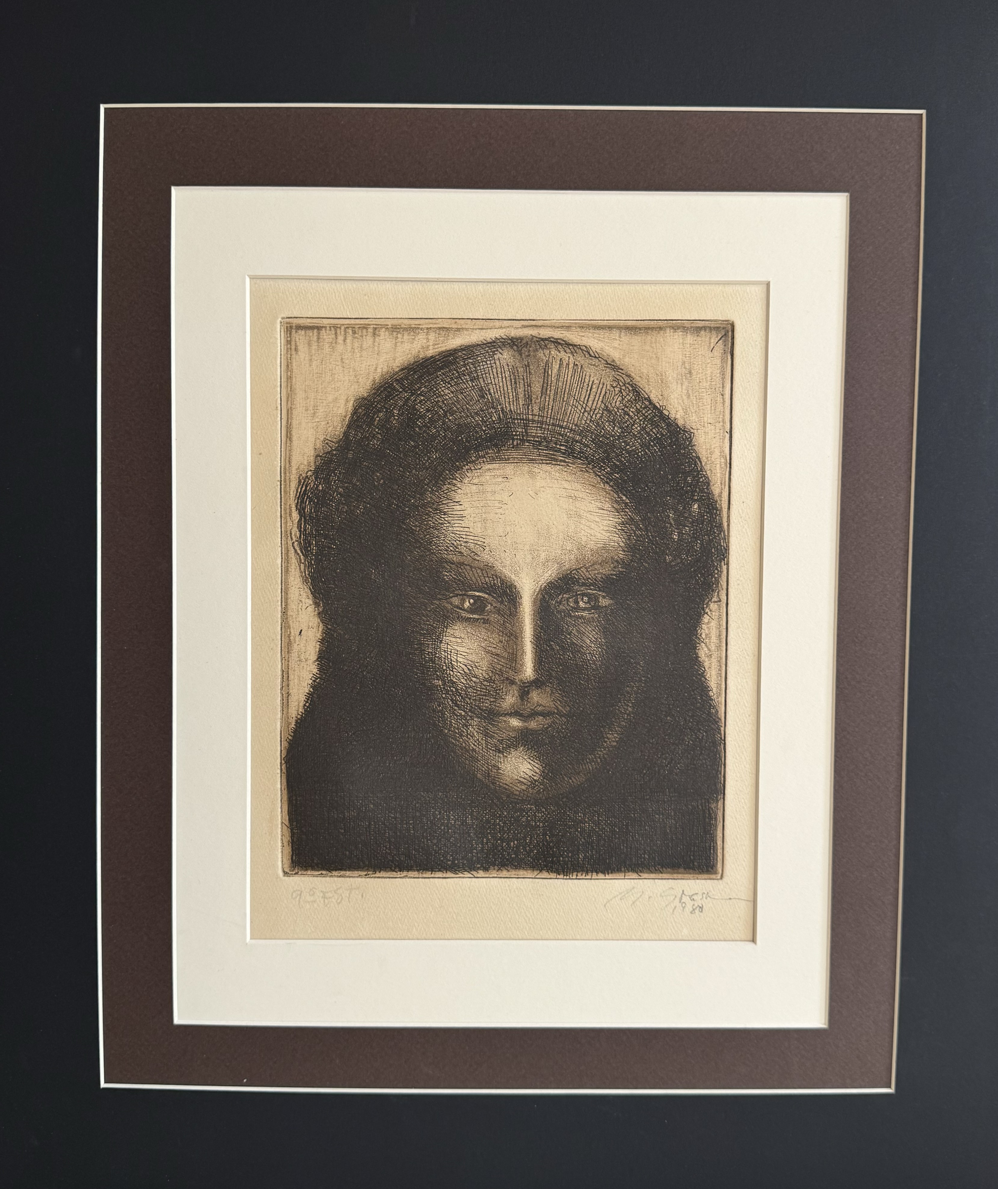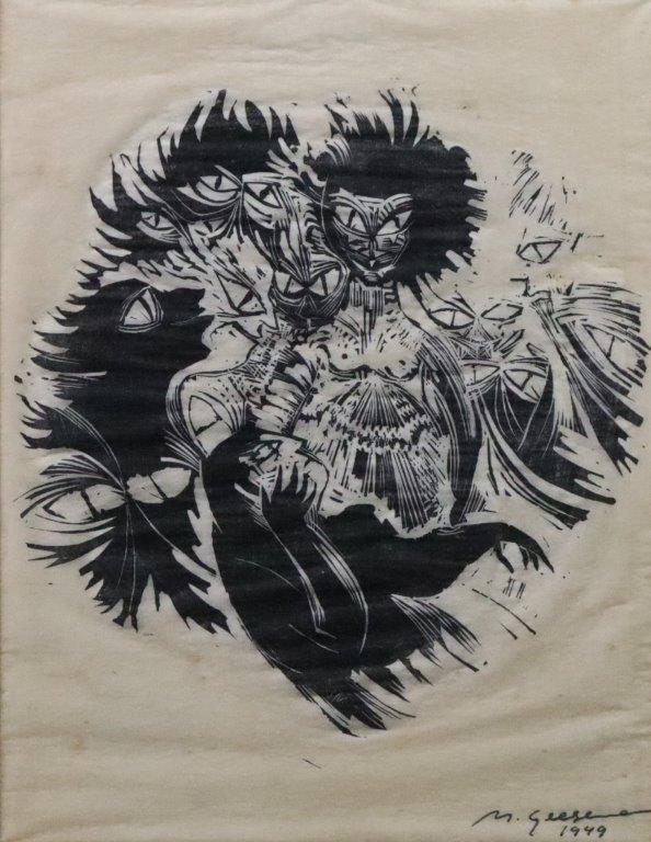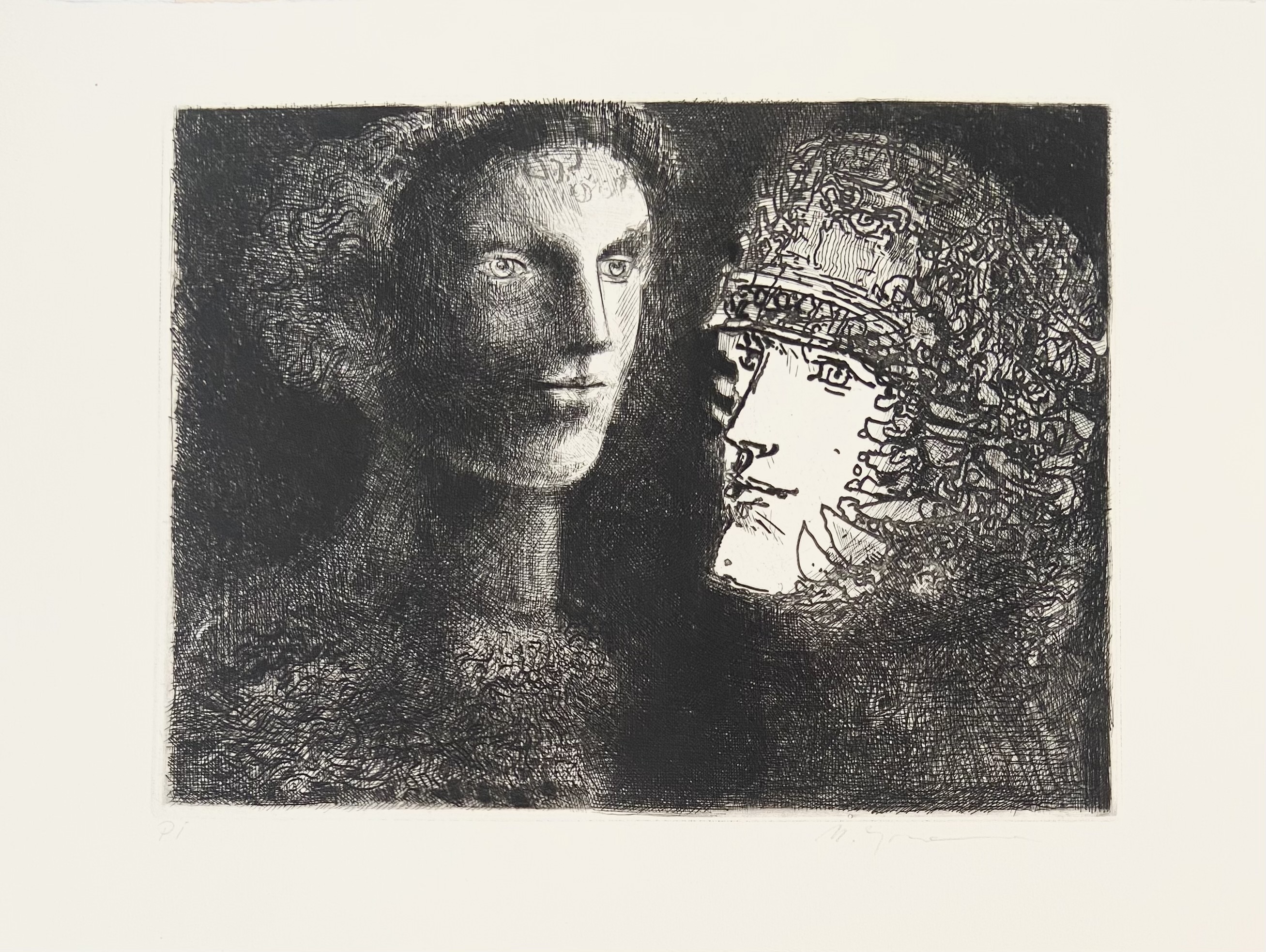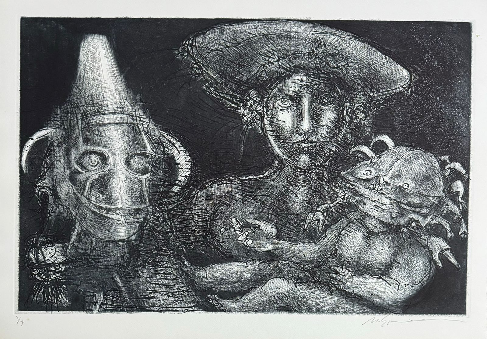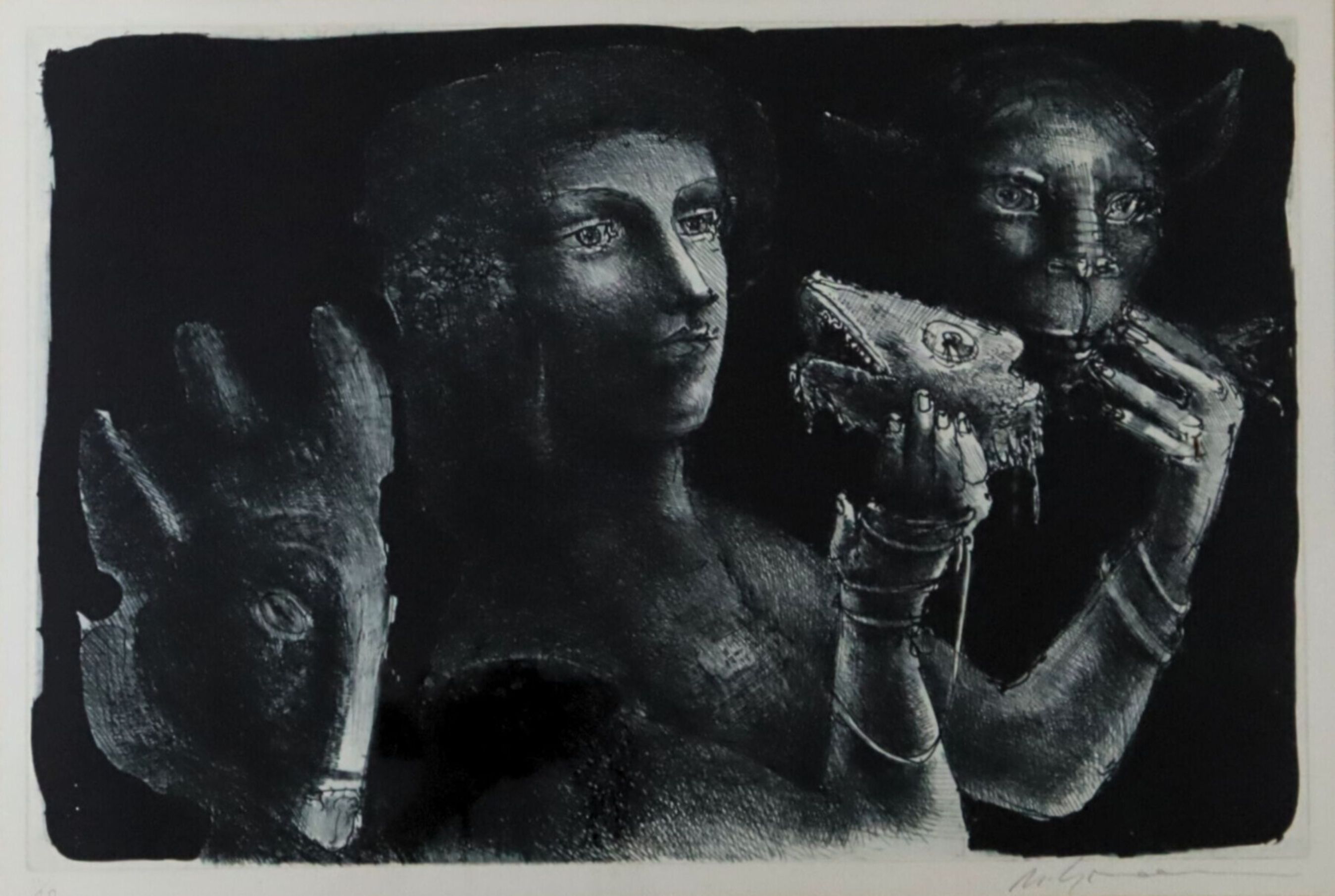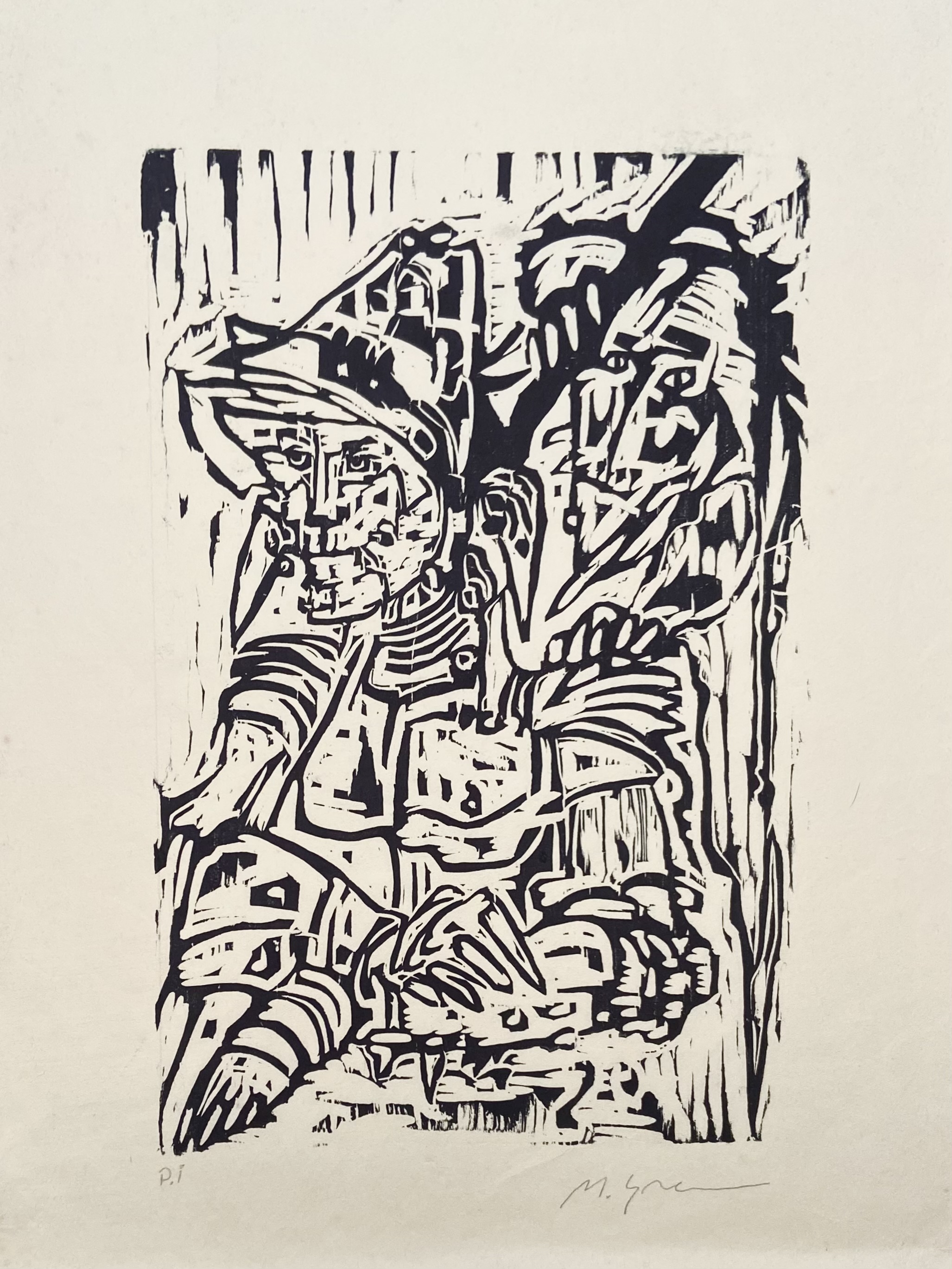 Marcelo Grassmann (1925–2013) – Figura. Gravura em metal, prova do artista (P.A.). Gravador, desenhista, ilustrador e professor brasileiro, referência central da gravura no Brasil, com formação técnica sólida e atuação como ilustrador da imprensa. Ass. CID. Dimensões: 42 × 32 cm.