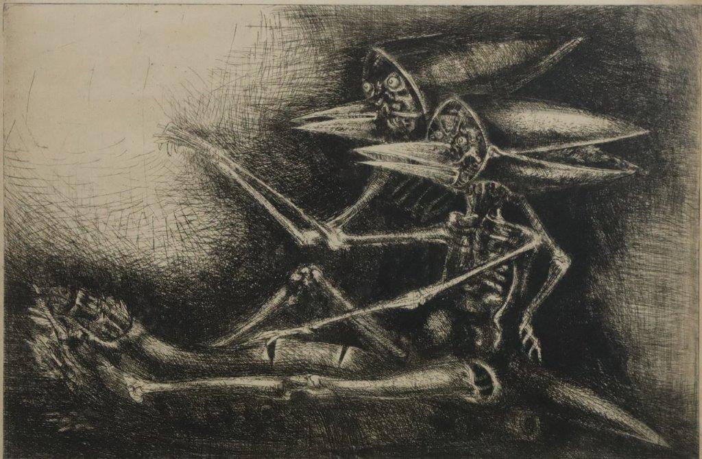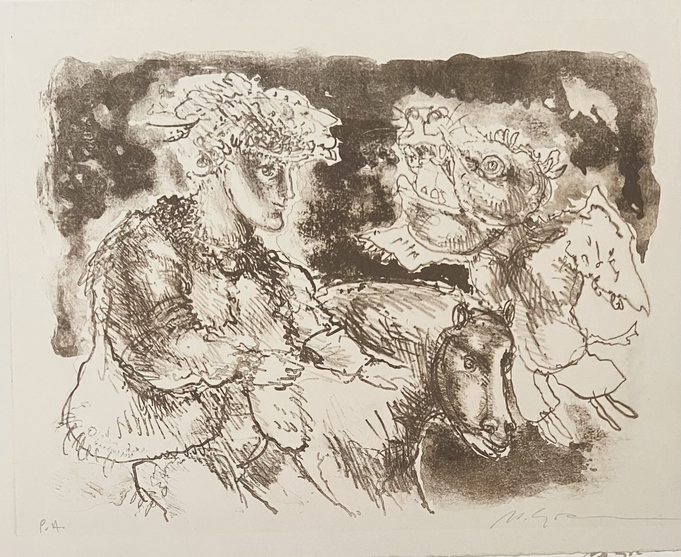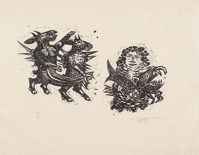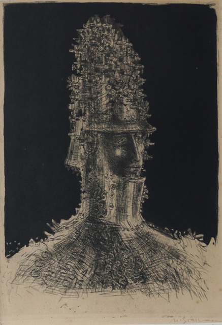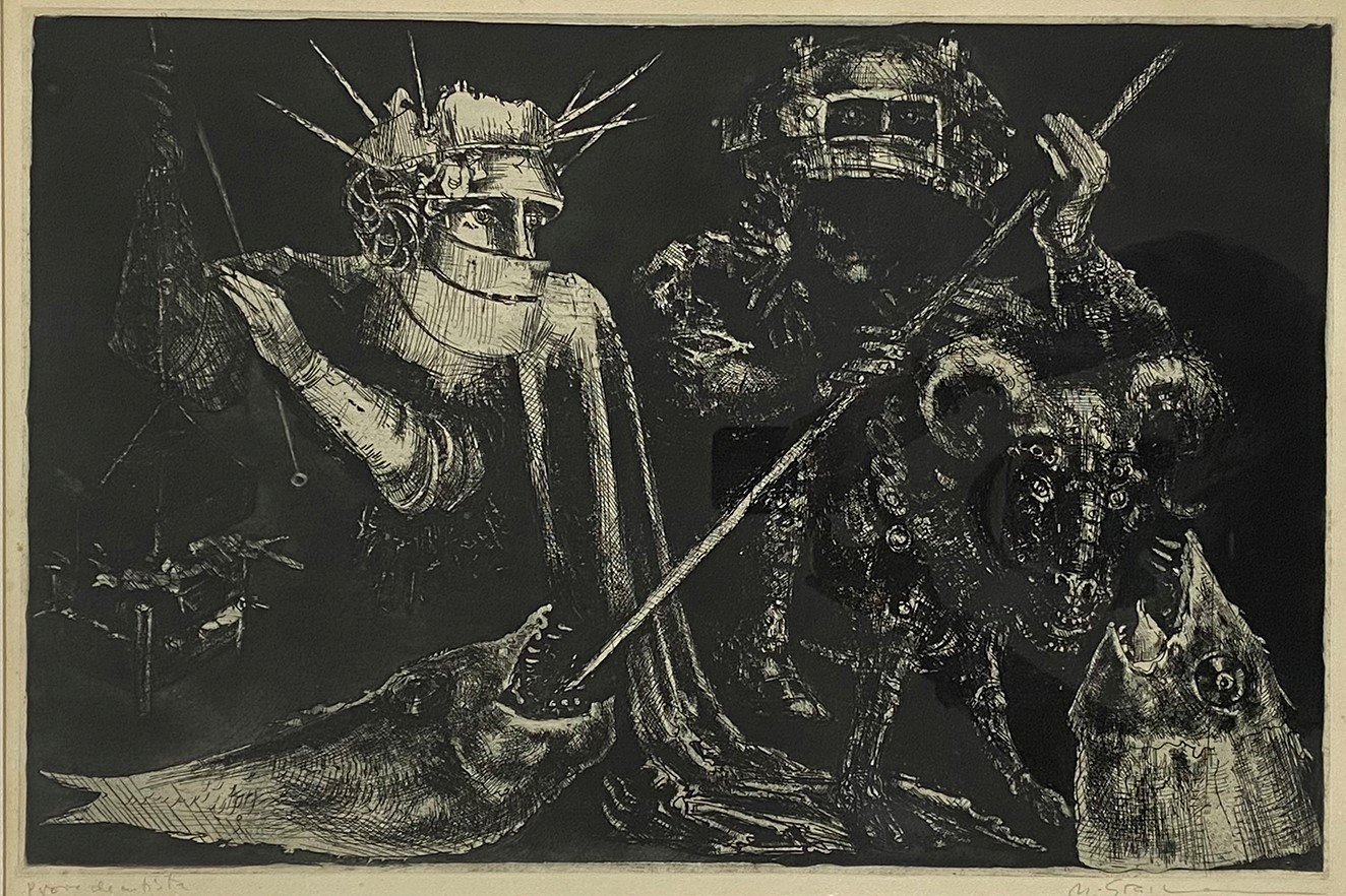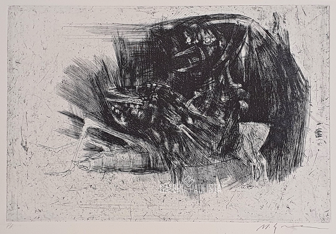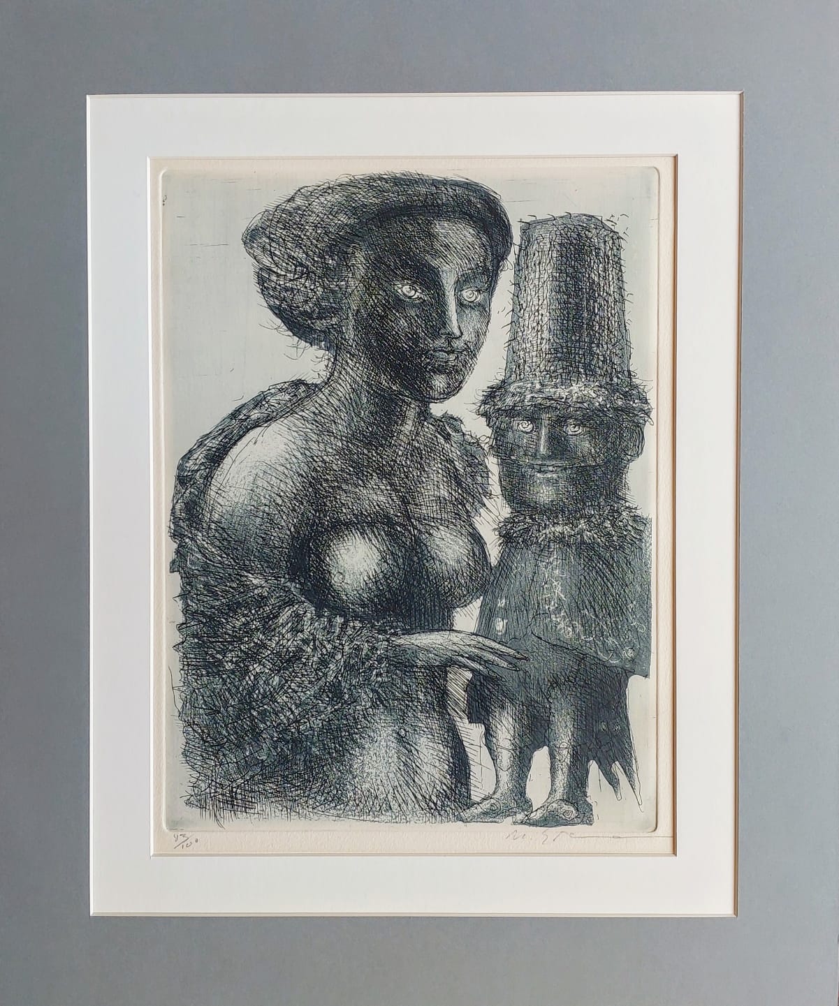 Marcelo Grassmann (1925–2013) – Figura. Gravura em metal, prova do artista (P.A.). Gravador, desenhista, ilustrador e professor brasileiro, referência central da gravura no Brasil, com formação técnica sólida e atuação como ilustrador da imprensa. Ass. CID. Dimensões: 42 × 32 cm.