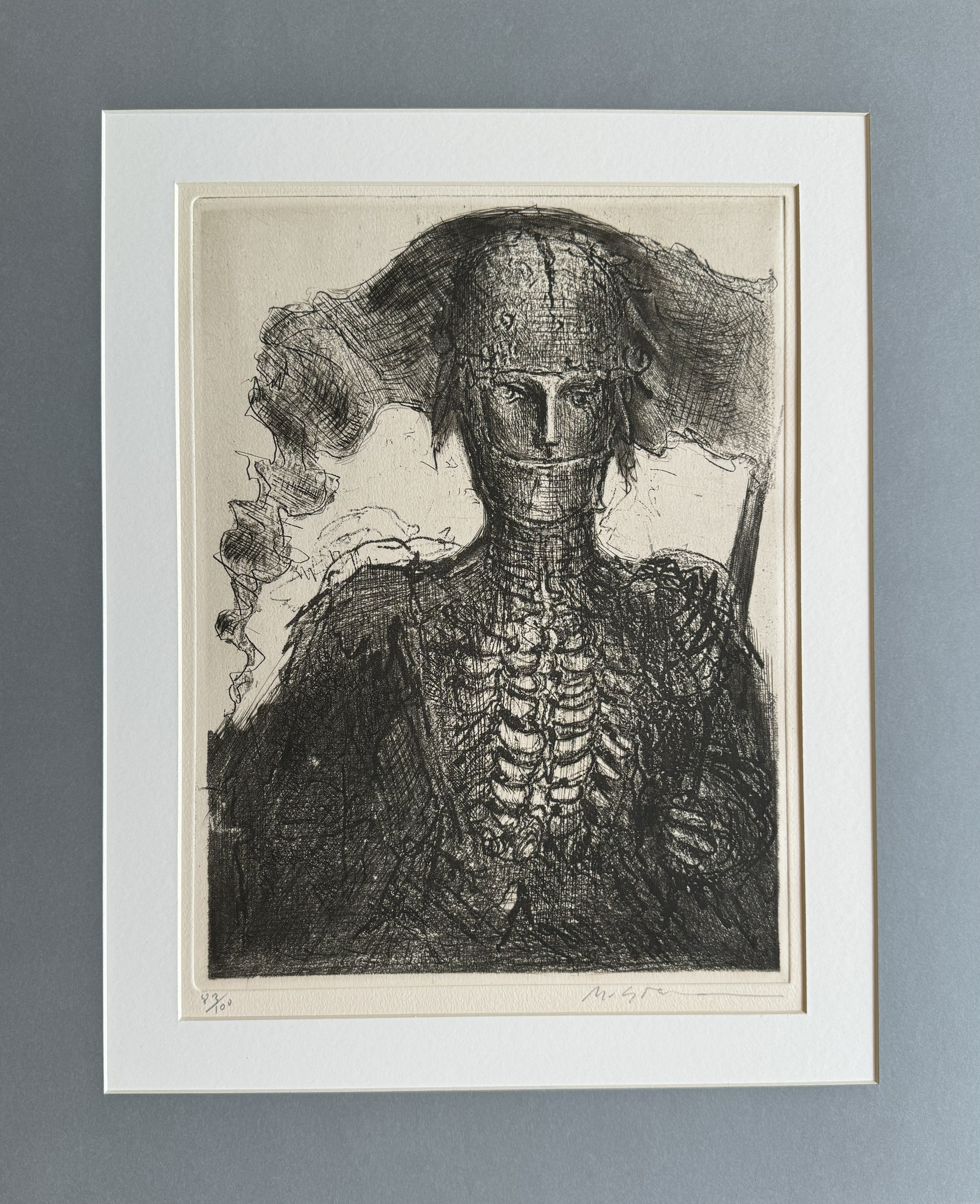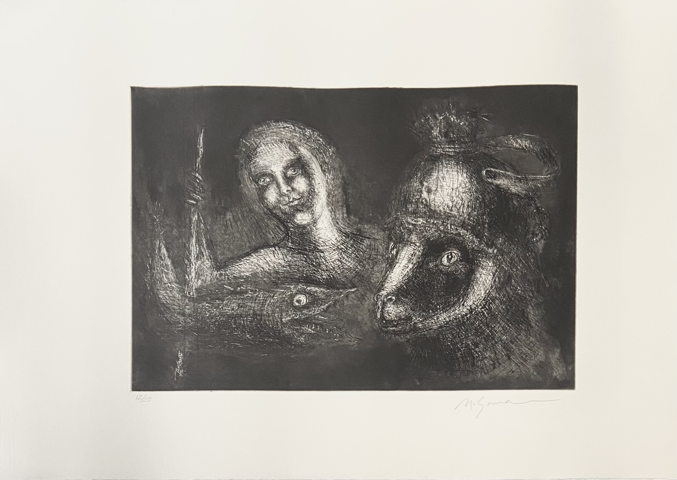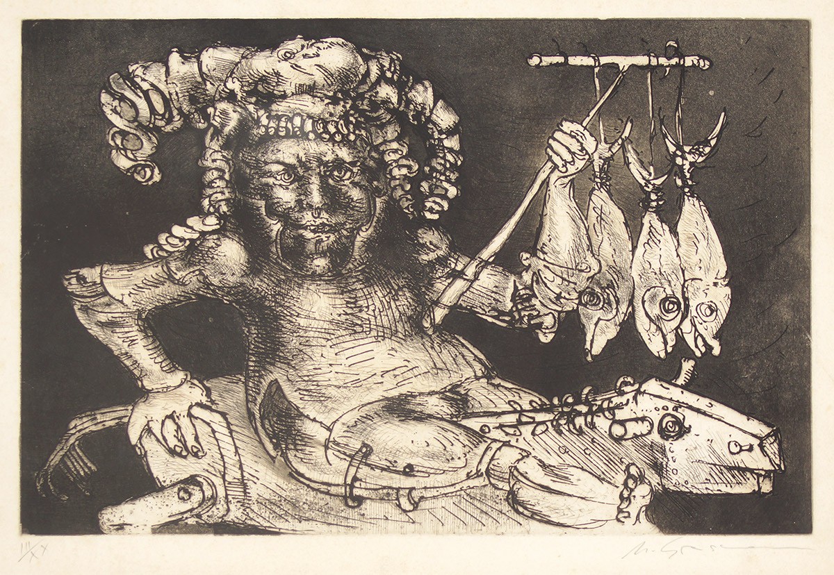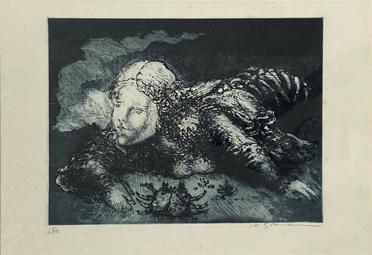 Marcelo Grassmann (1925–2013) – Figura. Gravura em metal, prova do artista (P.A.). Gravador, desenhista, ilustrador e professor brasileiro, referência central da gravura no Brasil, com formação técnica sólida e atuação como ilustrador da imprensa. Ass. CID. Dimensões: 42 × 32 cm.