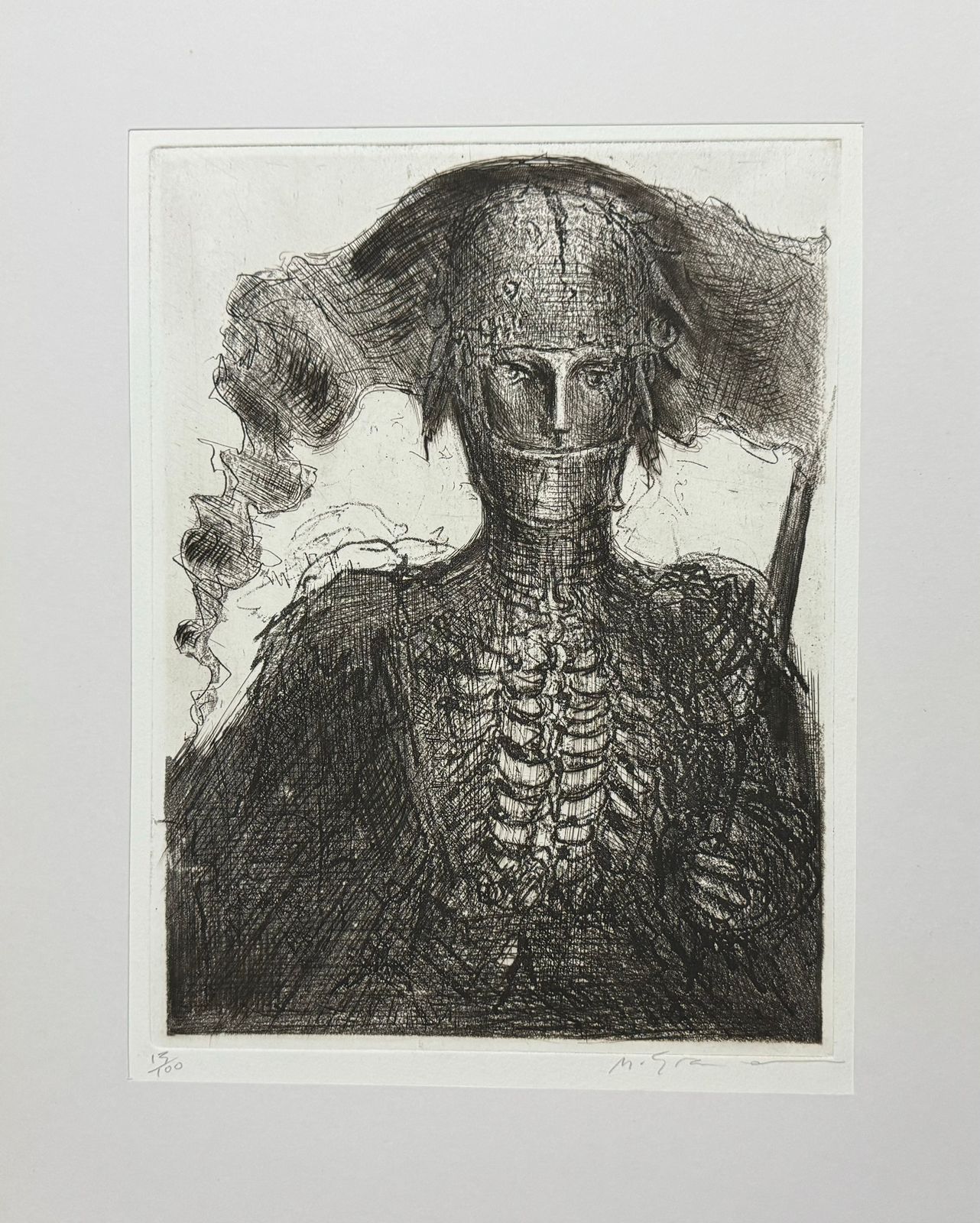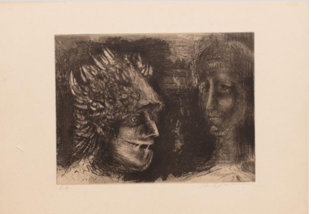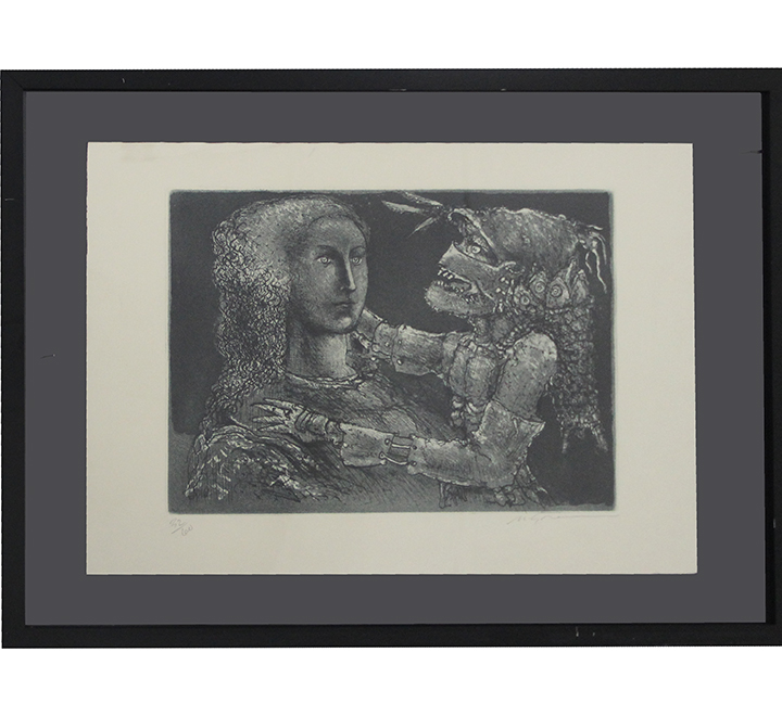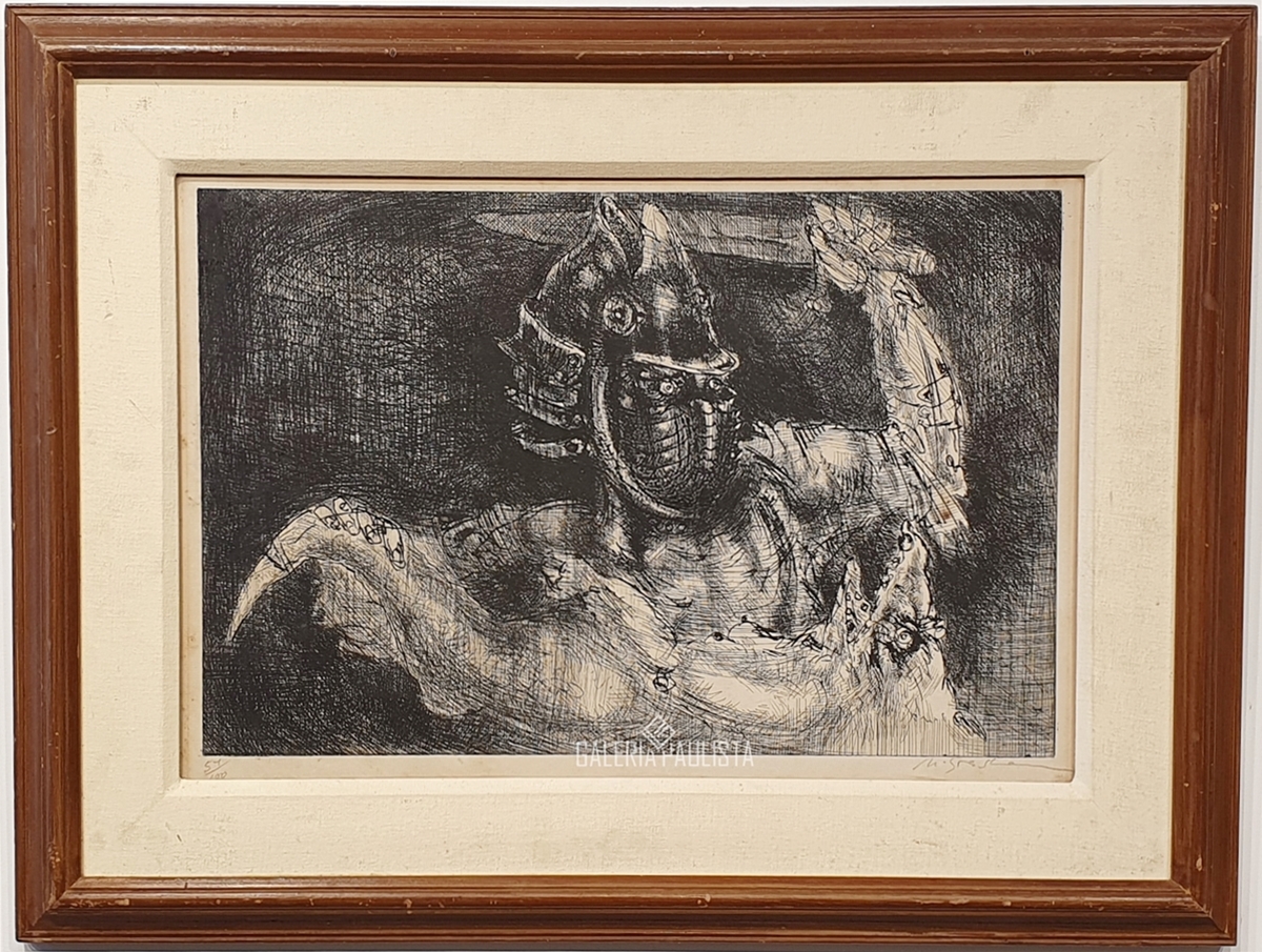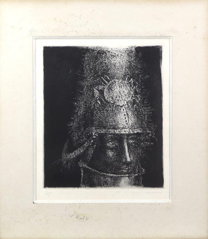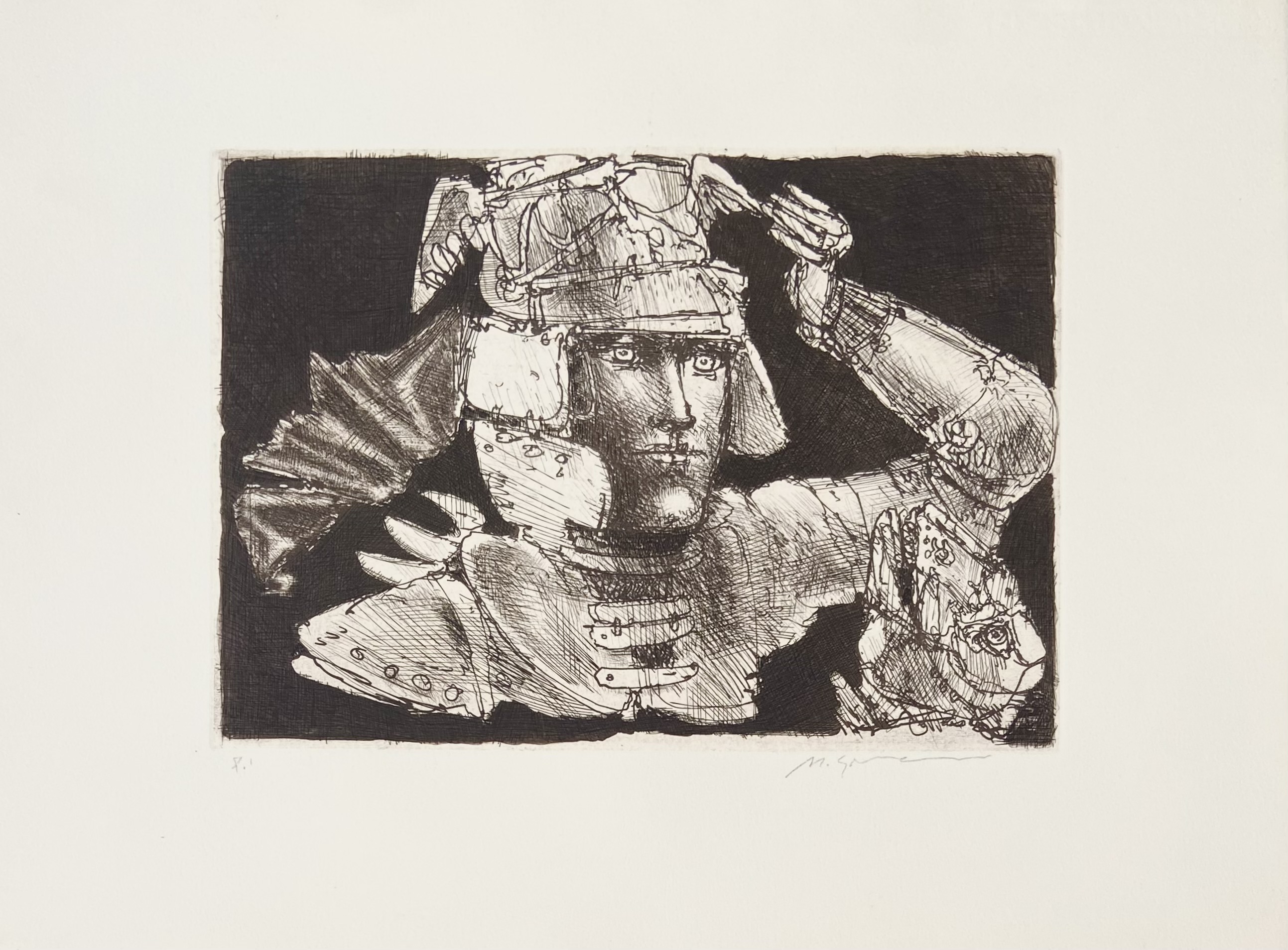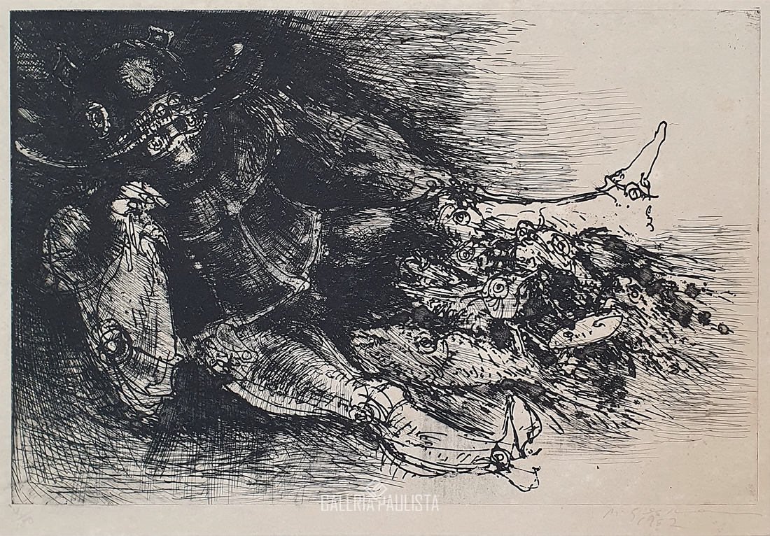 Marcelo Grassmann (1925–2013) – Figura. Gravura em metal, prova do artista (P.A.). Gravador, desenhista, ilustrador e professor brasileiro, referência central da gravura no Brasil, com formação técnica sólida e atuação como ilustrador da imprensa. Ass. CID. Dimensões: 42 × 32 cm.