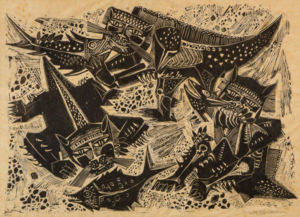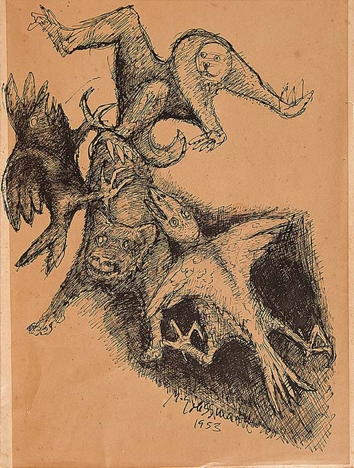 Marcelo Grassmann - Pescador. Nanquim e aguada sobre papel, 50x65 cm, 1962, A.C.I.D. Com moldura