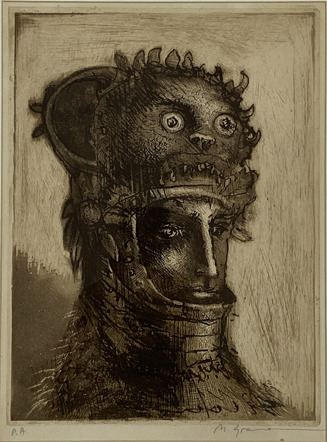 Marcelo Grassmann (1925–2013) – Figura. Gravura em metal, prova do artista (P.A.). Gravador, desenhista, ilustrador e professor brasileiro, referência central da gravura no Brasil, com formação técnica sólida e atuação como ilustrador da imprensa. Ass. CID. Dimensões: 42 × 32 cm.