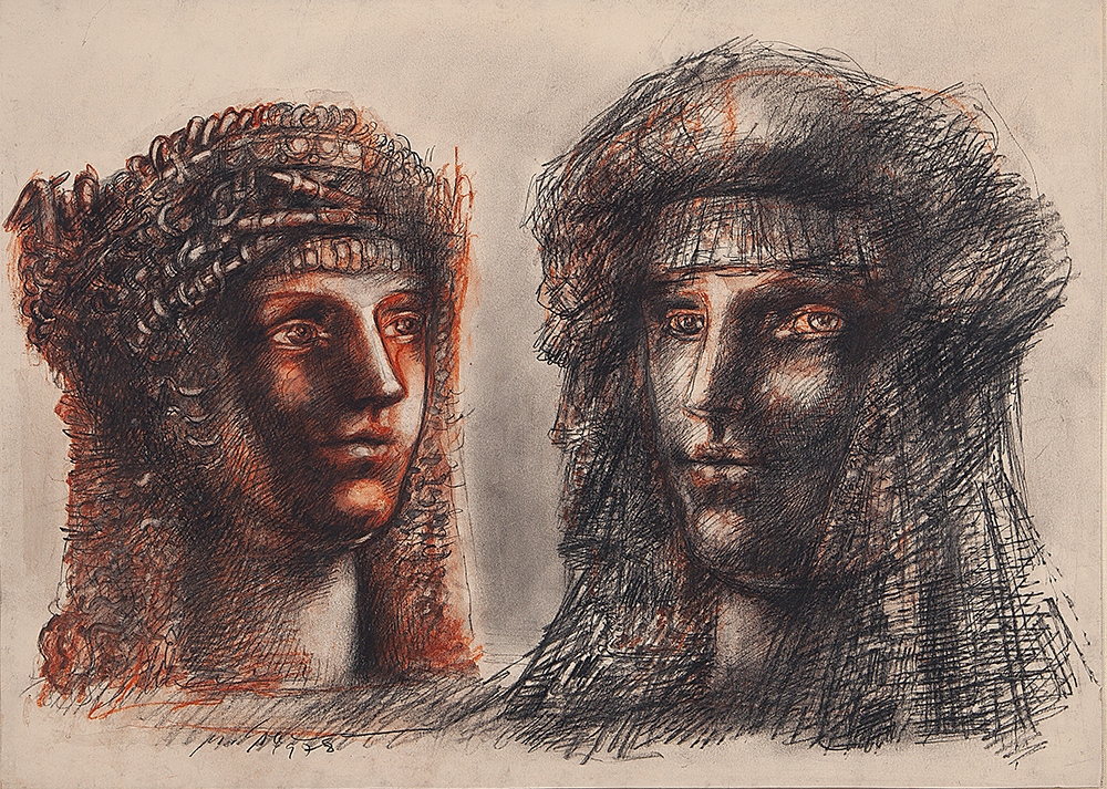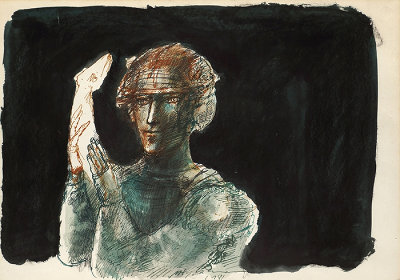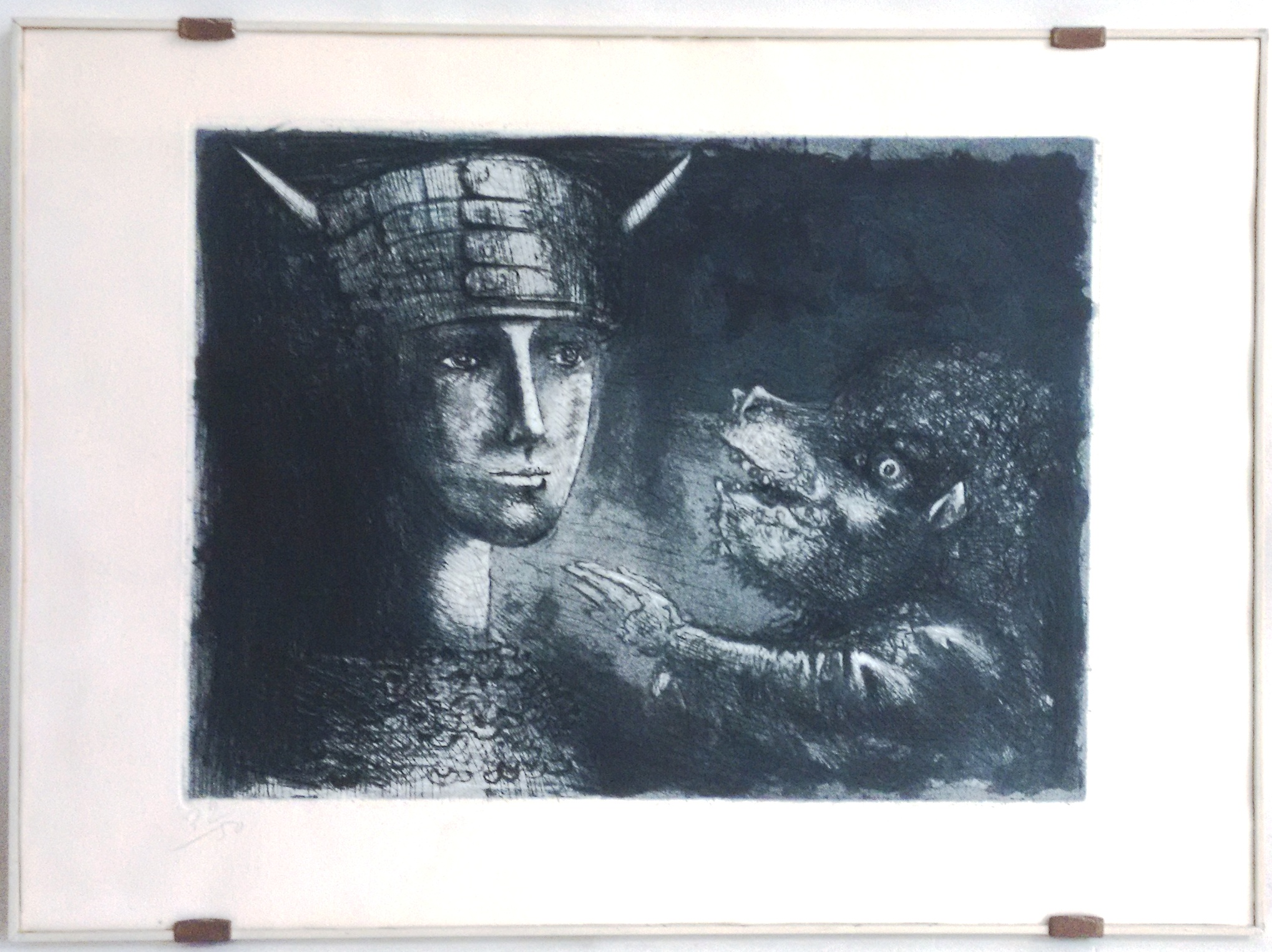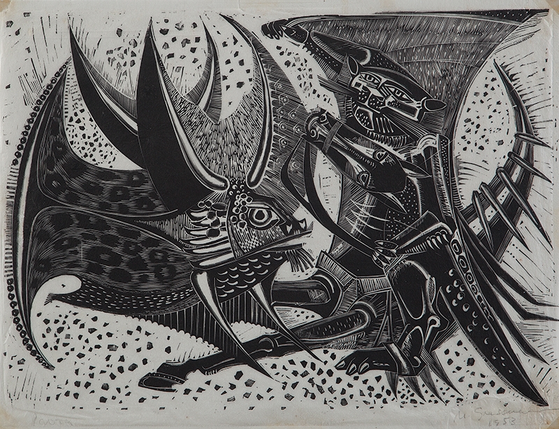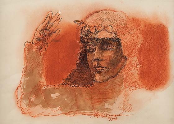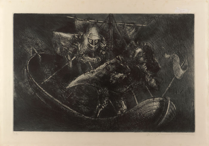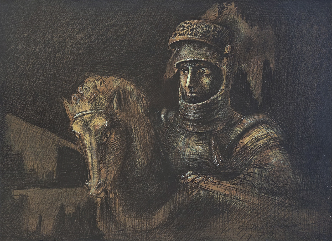 MARCELLO GRASSMANN, Guerreiro, Técnica Mista sobre Papel, ACID, 35 x 45cm (m.i). Datado 1971 (papel com manchas de umidade)