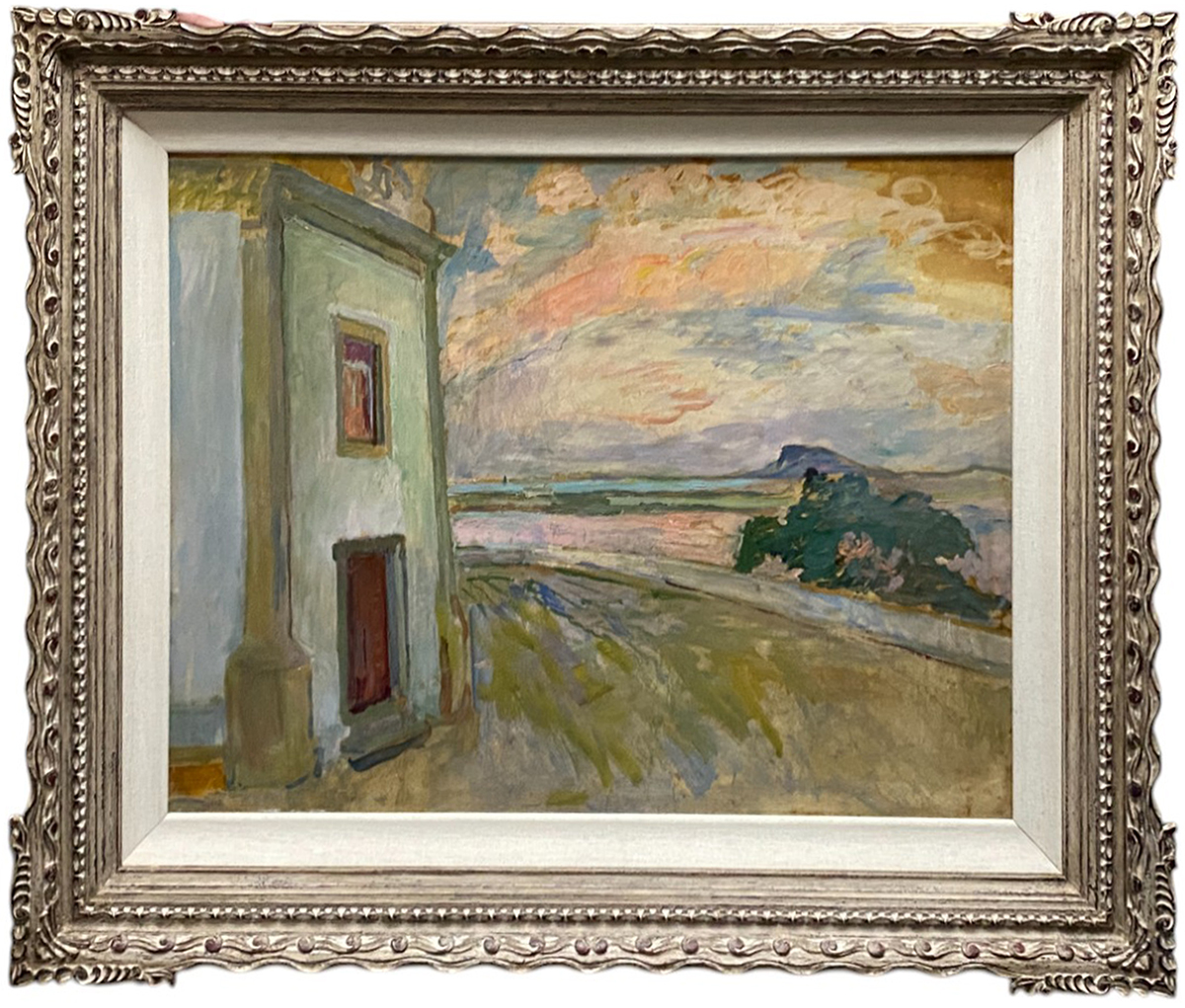 Nivoulies de Pierrefort. Lateral da Igreja da Penha. Óleo sobre madeira. 69 x 89 cm. Medida total com a moldura: 95 x 115cm. Obra não assinada, mas com autenticação no verso de Sergio Telles.