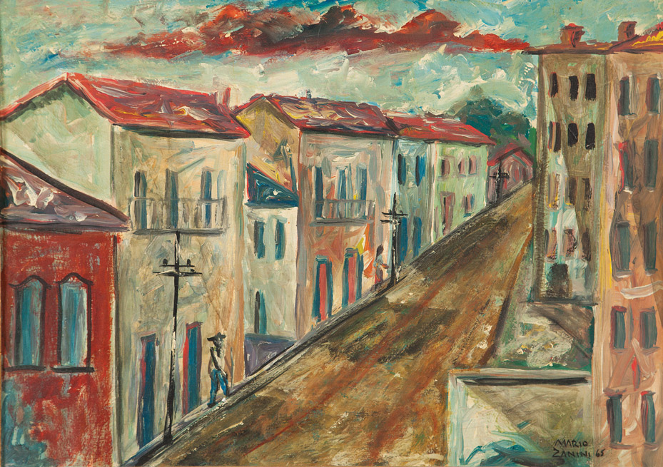 Mário Zanini (São Paulo SP 1907 - idem 1971). Pintor, decorador, ceramista, professor. Aos 13 anos, inicia curso de pintura da Escola Profissional Masculina do Brás, em São Paulo. Trabalha como letrista na Companhia Antarctica Paulista, entre 1922 e 1924. Em 1924, matricula-se no curso noturno de desenho e artes do Liceu de Artes e Ofícios de São Paulo - Laosp, que conclui em 1926. Conhece Alfredo Volpi em 1927 e no ano seguinte estuda com o pintor Georg Elpons. Trabalha no escritório de decoração de Francisco Rebolo entre 1933 e 1938. Em 1935, instala-se no palacete Santa Helena, na praça da Sé, onde divide, a partir de 1936, uma sala com Manoel Martins e Clóvis Graciano. Da reunião desses e de outros artistas, surge o Grupo Santa Helena. Em 1940 recebe medalha de prata no 46º Salão Nacional de Belas Artes - SNBA e é convidado por Rossi Osir a trabalhar em seu ateliê de azulejos artísticos, o Osirarte. Sua primeira exposição individual acontece em 1944, na galeria da Livraria Brasiliense, em São Paulo. Em 1950, viaja por seis meses pela Itália, em companhia de Volpi e Osir. Ensina gravura na Associação Paulista de Belas Artes e na Escola Carlos de Campos em 1958. A partir de 1968 leciona na Faculdade de Belas Artes de São Paulo. Sua família doa 108 de suas obras ao Museu de Arte Contemporânea da Universidade de São Paulo - MAC/USP em 1974.