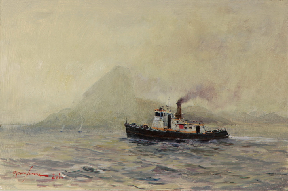 Mauro Ferreira - Puxando a falua - Homenagem a Raimundo Cela - 20 x 30 cm - Óleo sobre eucatex - Assinatura canto inferior direito e Data 2010