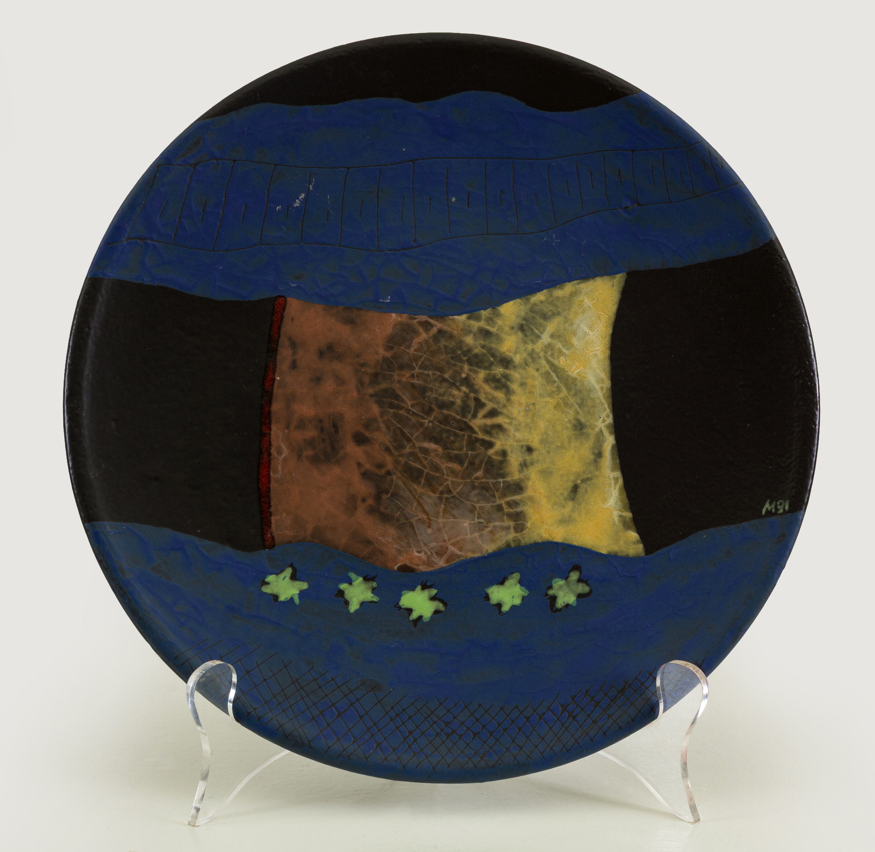 MEGUMI YUASA, Prato de cerâmica policromada e esmaltada, assinado. Diam. 30cm. Datado 1991