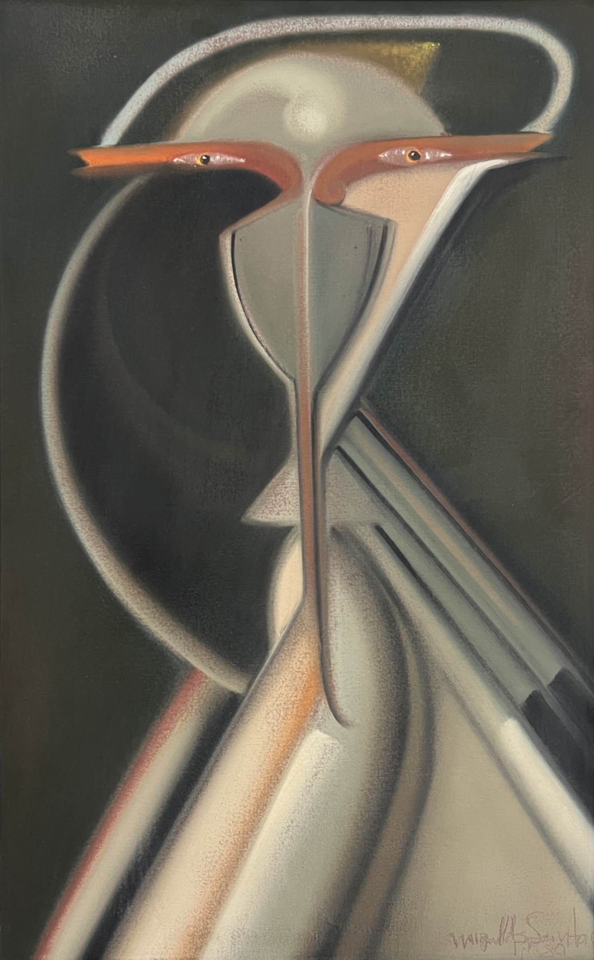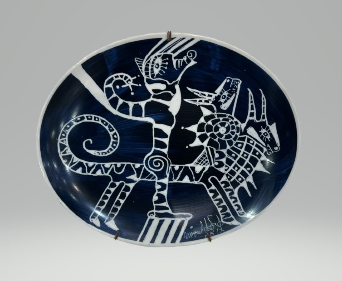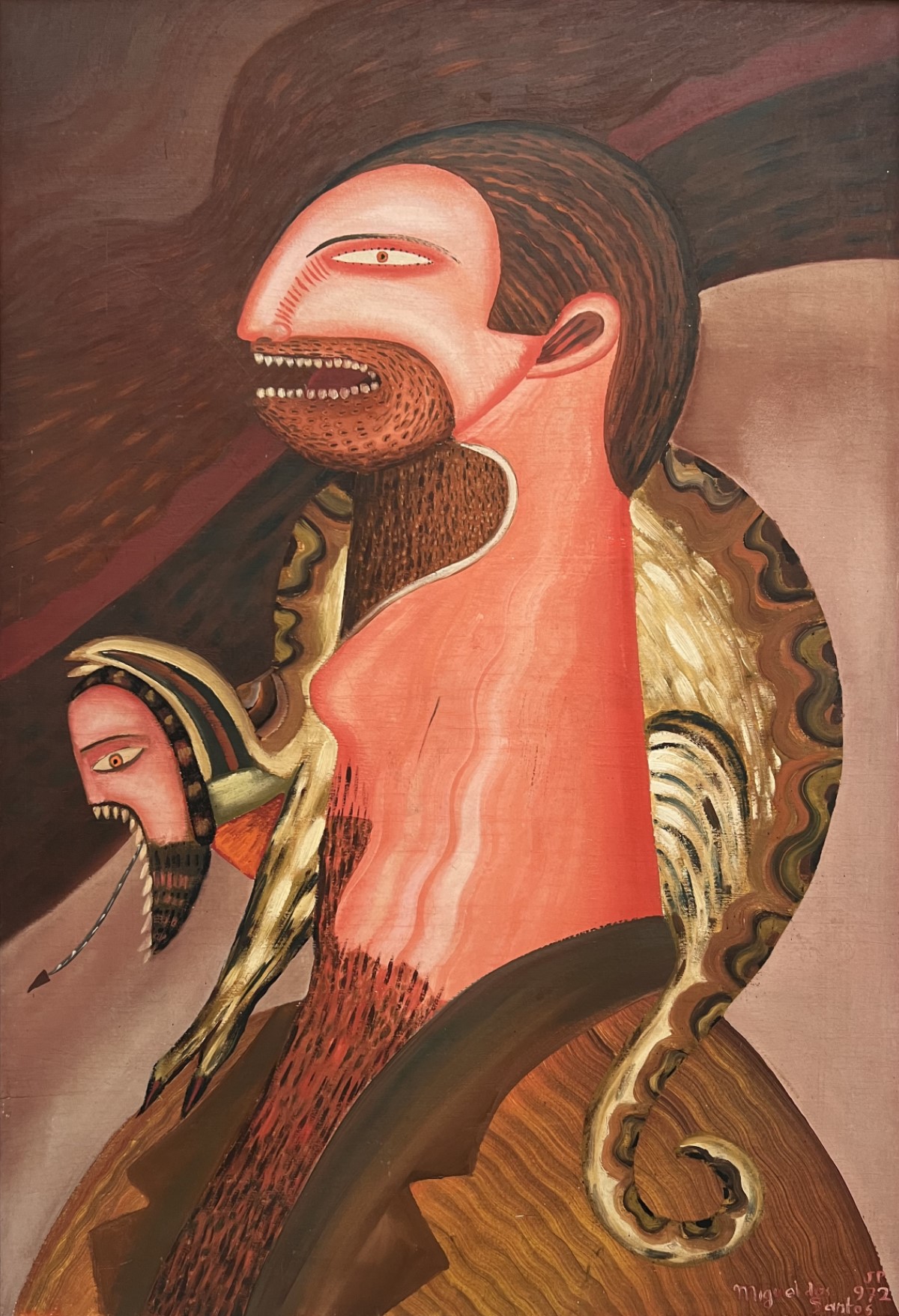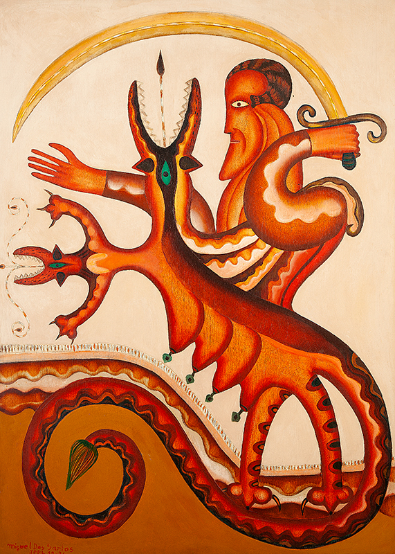 Miguel Dos Santos (1944) nasceu Caruaru-PE mas, desde 1960, reside em João Pessoa, PB, onde possui ateliê. O versátil artista (ceramista e pintor) também esculpe peças em mármore e madeira. Já participou de dezenas de exposições individuais e coletivas em importantes galerias e museus no Brasil e no exterior: Rio de Janeiro, São Paulo, Porto Alegre, João Pessoa, Brasília e também na Argentina, Bélgica, Chile, Colômbia, Dinamarca, Estados Unidos e Nigéria. Miguel libera sua fantasia criando esculturas personalíssimas voltadas para o realismo mágico, enamorado pelos mitos nordestinos, explorando com competência a composição figurativa de animais míticos ou fantásticos vestígios do passado com saudações a muitos deuses. A influência Africana é patente com a confecção de mascaras ritualísticas. O esmero de sua técnica de modelagem e de decoração se traduz em peças de pequenas e grandes dimensões.