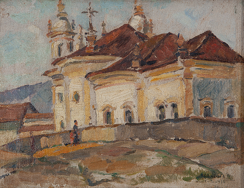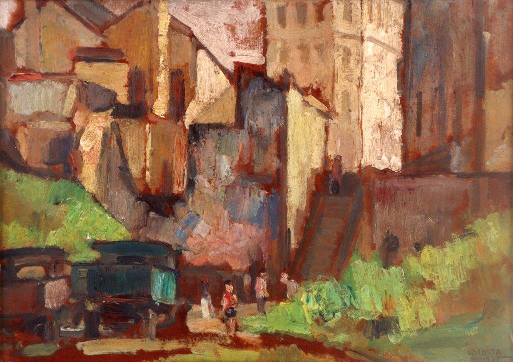 MILTON DACOSTA (1915–1988) – Figura na cidade. Óleo sobre placa. Pintor, desenhista, gravador e ilustrador brasileiro, um dos fundadores do Núcleo Bernardelli, com formação e atuação no Brasil, Estados Unidos e Europa, participante do Salon d’Automne e figura central do modernismo brasileiro, com fases que vão do construtivismo ao retorno ao figurativo a partir da década de 1960. Ass. CID. Dimensões: 24 × 34 cm.