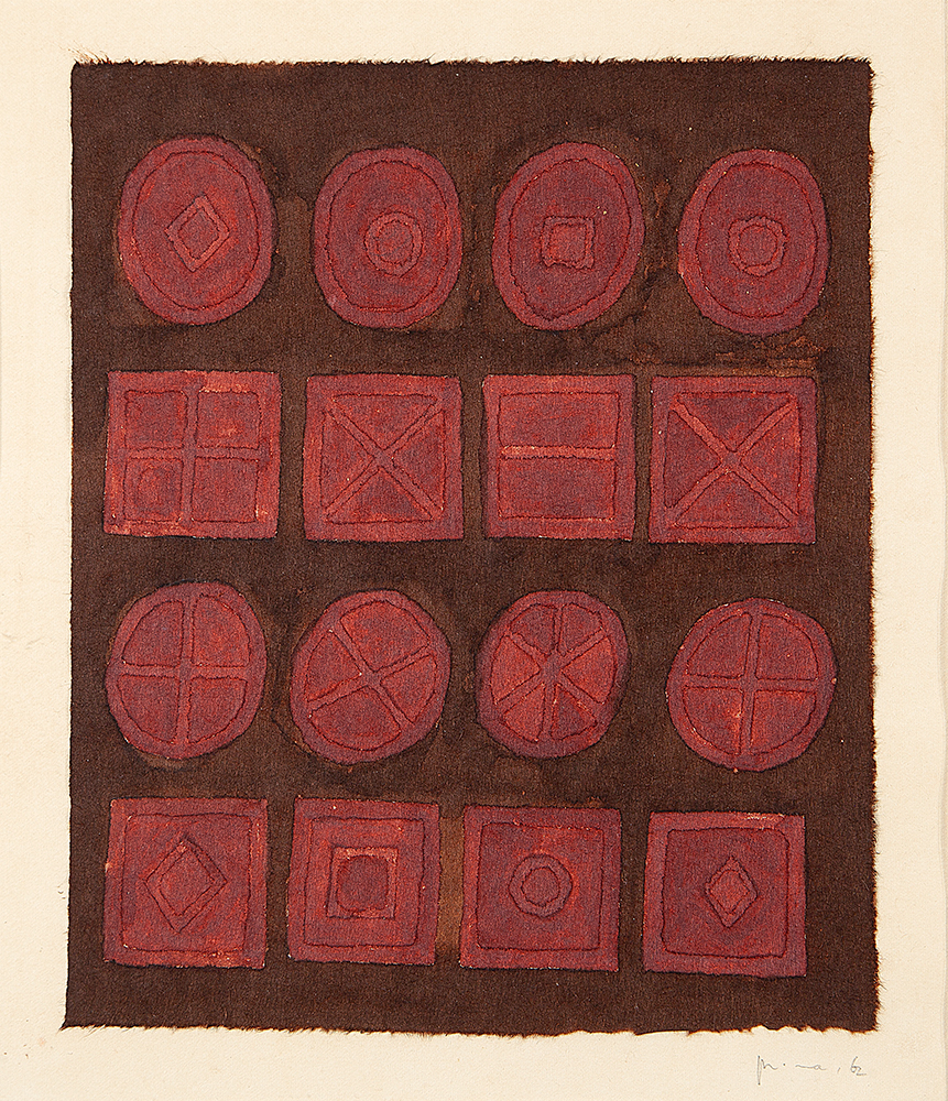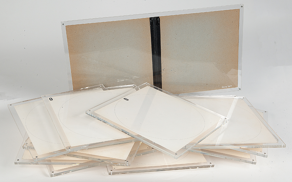 A produção artística de Mira Schendel, marcada pela constante experimentação, é constituída por múltiplas séries de trabalhos, experiências bastante diversas quanto a formato e dimensões, aos suportes escolhidos e à técnica adotada, mas que guardam entre si uma coerência no que diz respeito às questões por eles suscitadas. As obras de Mira Schendel geralmente não têm títulos, mas ela nomeia as séries, que funcionam como apelidos aos trabalhos. Na década de 1950, sua linguagem pictórica simplifica-se progressivamente, em trabalhos que exploram o tratamento dado à superfície.
