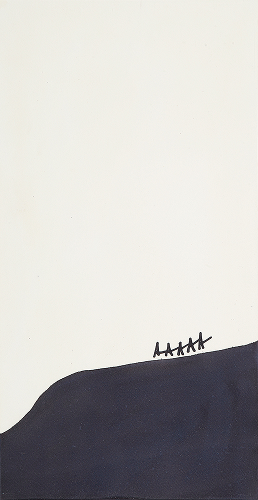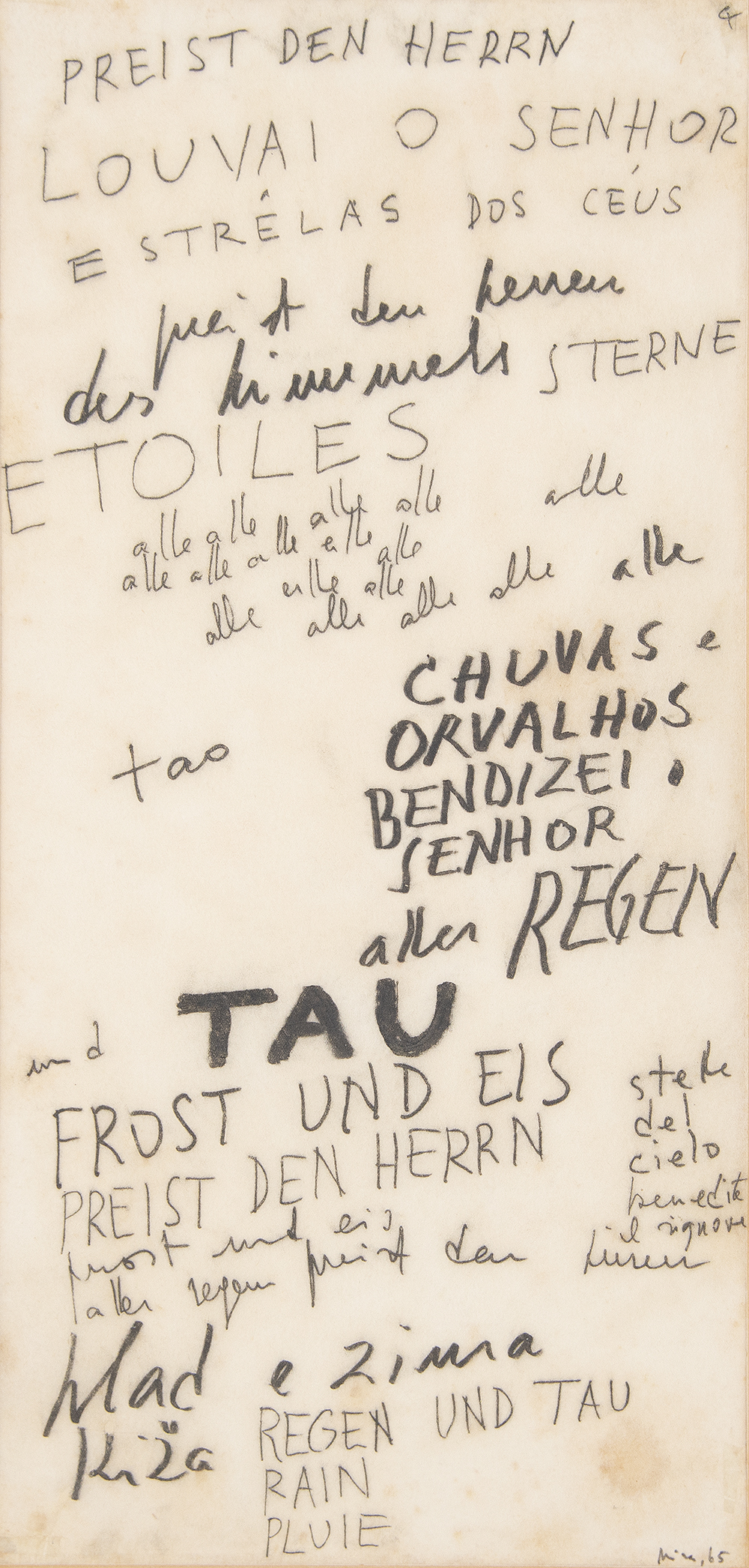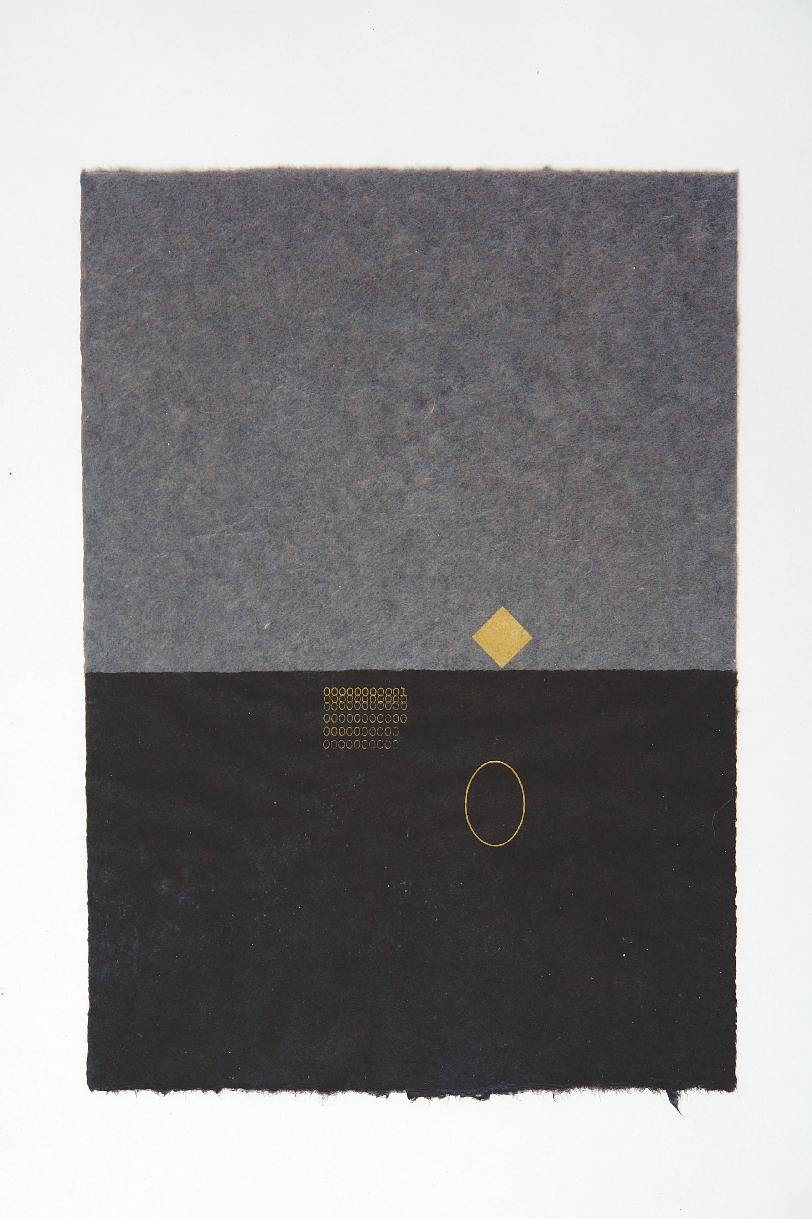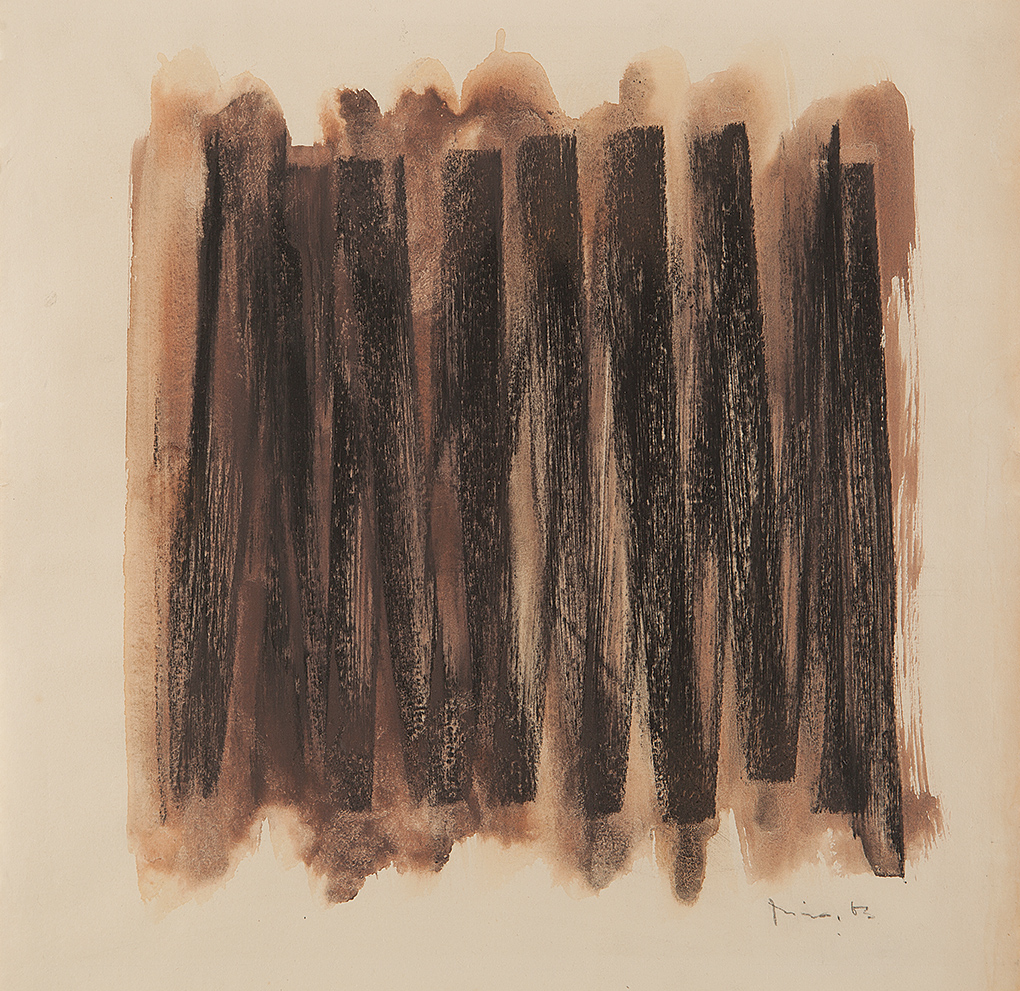 Mira Schendel - Sem título, série Toquinho P - 1972 - Letraset e papel artesanal tingido com ecoline sobre papel - Assinado canto inferior direito - 48 x 24 cm.