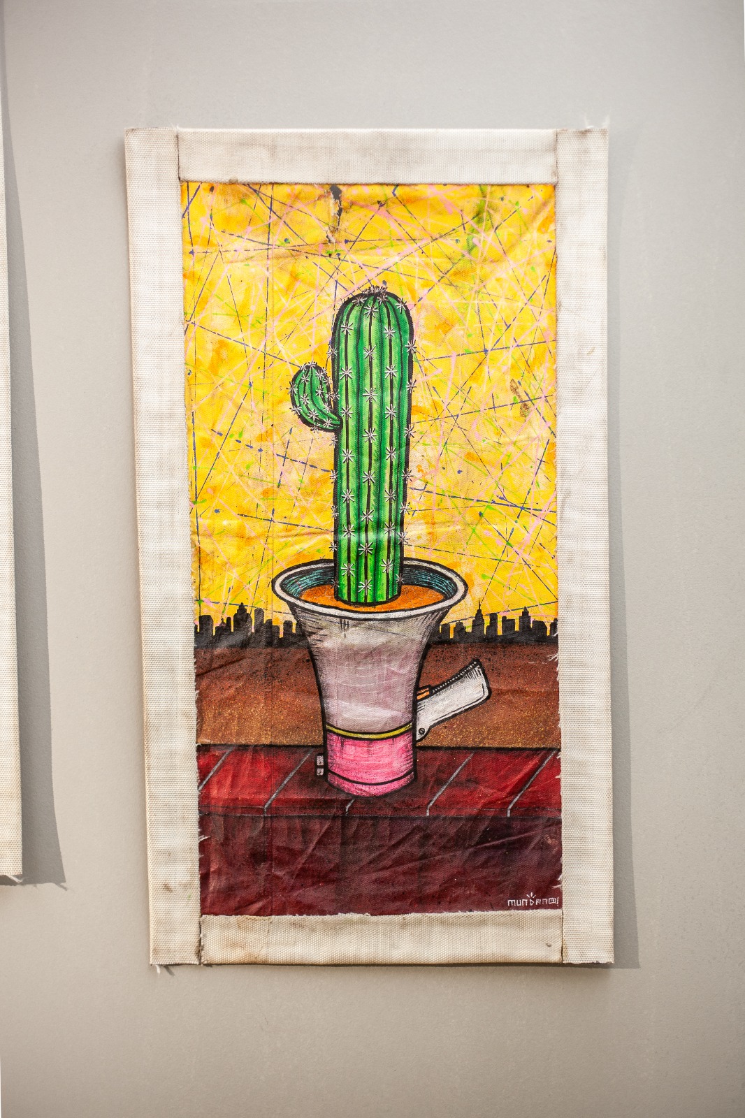 Em San Pedro (Trichocereus pachanoi), eu articulei elementos centrais da minha pesquisa artística para refletir sobre a resistência socioambiental e o poder da fala. A obra integra uma série de três pinturas em que diferentes espécies de cactos emergem de megafones, estabelecendo uma conexão direta entre o instrumento de denúncia e a força vital da flora. Enquanto o megafone atua como um símbolo de amplificação das vozes que reivindicam direitos, o cacto introduz a urgência da questão hídrica e a resiliência intrínseca tanto à natureza quanto às populações que dela fazem parte. A materialidade da peça reforça essa mensagem, utilizando lama do Rio Doce e uma moldura de mangueira de incêndio para situar a obra no campo da urgência e da persistência, reafirmando que a vida e a resistência florescem mesmo em territórios de escassez. (Mundano)