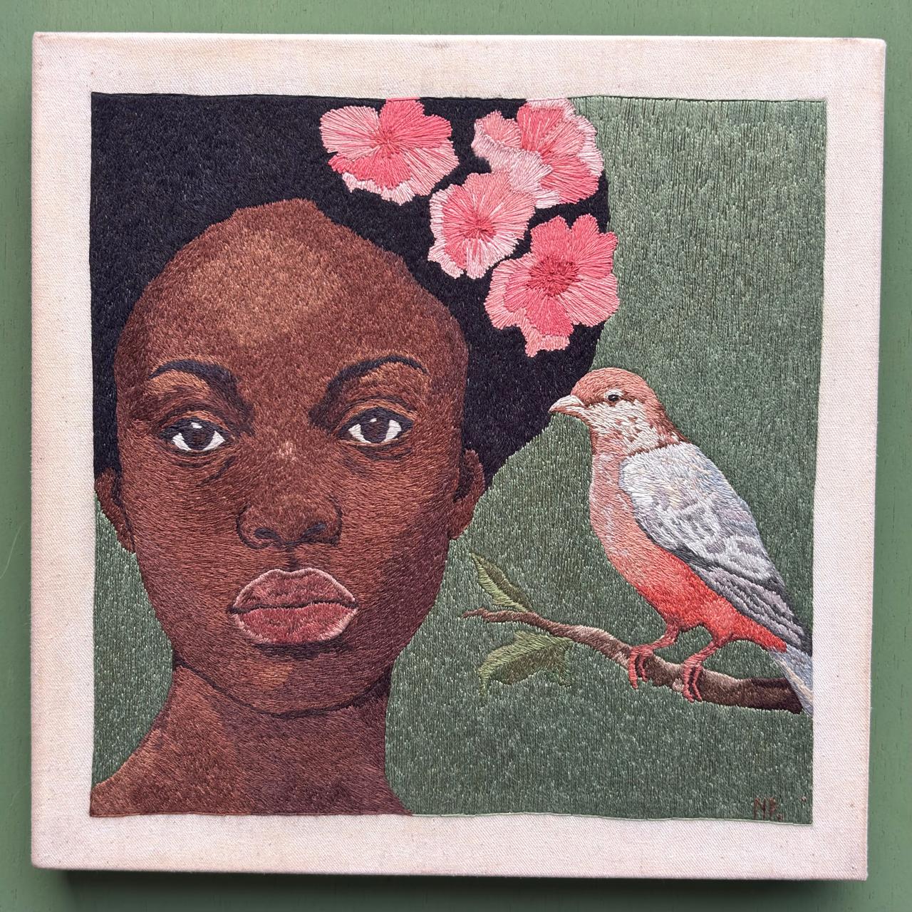 Memória que pousa, afeto que voa é um desdobramento da série Um passarinho me contou, em que a pintura com linha constrói, ponto a ponto, uma imagem de presença e escuta. Bordada manualmente sobre tela, a obra evidencia o gesto lento e preciso como linguagem, criando camadas de cor e textura que dão corpo à figura e ao pássaro. Entre o que pousa e o que voa, a obra fala sobre pertencimento, ancestralidade e as histórias sussurradas que encontram morada em nós. (Negana)