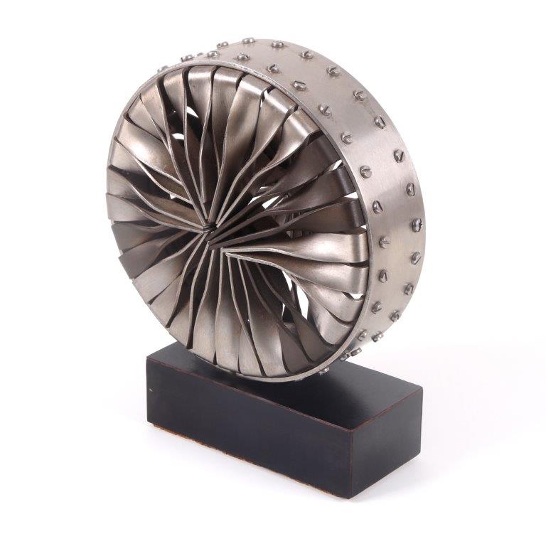 NICOLAS VLAVIANOS – Grande Mandala VI (maquete), 2003, 15 cm. Escultura em pequena escala que funciona como maquete de uma obra maior do artista, relacionada à série Relevos. Antecipando a linguagem da peça Mandala (2021), em aço inox e latão, esta versão revela o estudo formal e estrutural característico de Vlavianos. Assinada na base: Vlavianos, 2003.