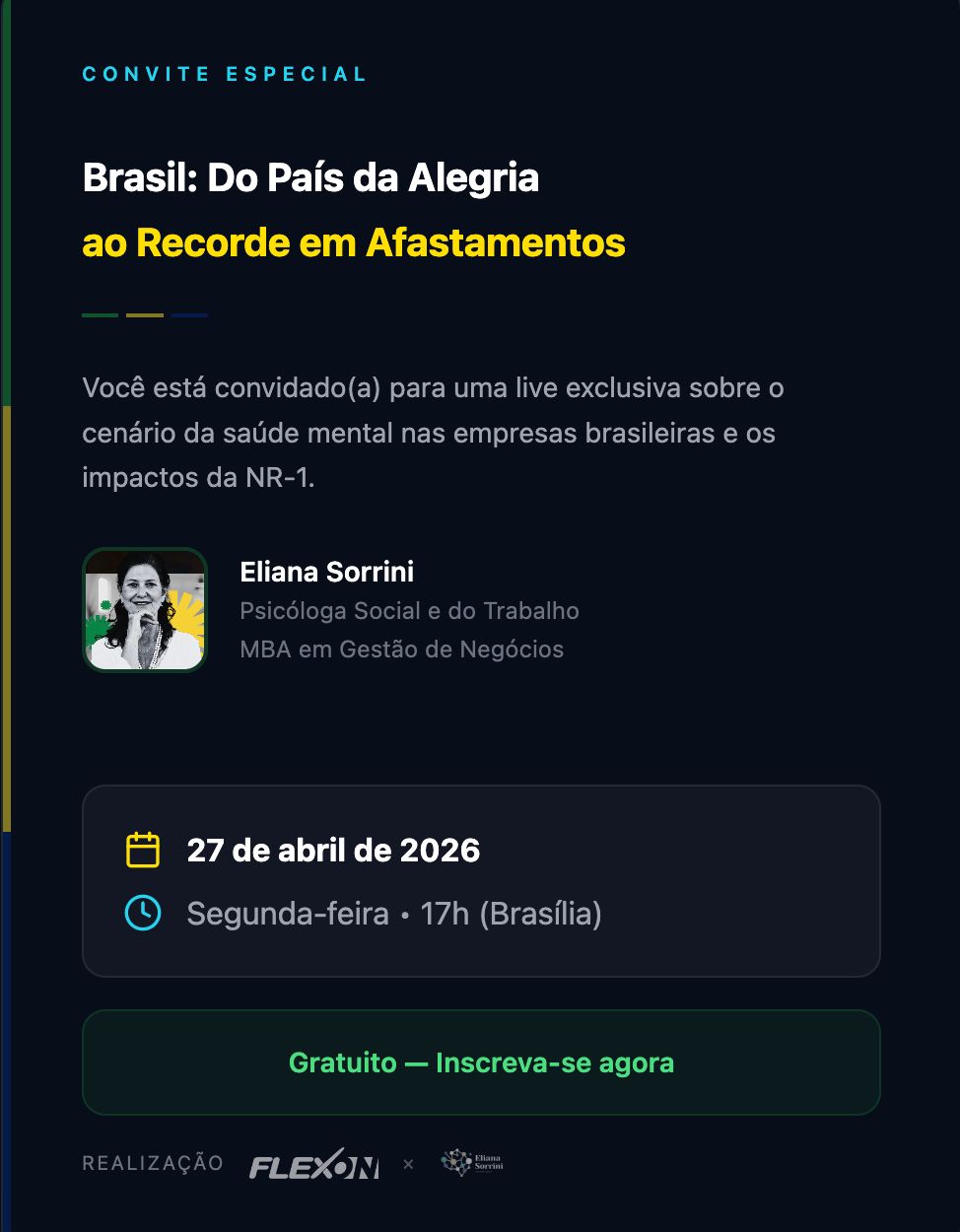 O Brasil adoeceu. E o trabalho tem tudo a ver com isso. Da imagem de país da alegria ao recorde mundial em afastamentos por saúde mental. A NR-1 trouxe uma obrigação. Esses números aparecem no absenteísmo, no presenteísmo, na rotatividade e no resultado financeiro da empresa. A NR-1 atualizada exige que os riscos psicossociais sejam mapeados. A pergunta é: você sabe por onde começar?