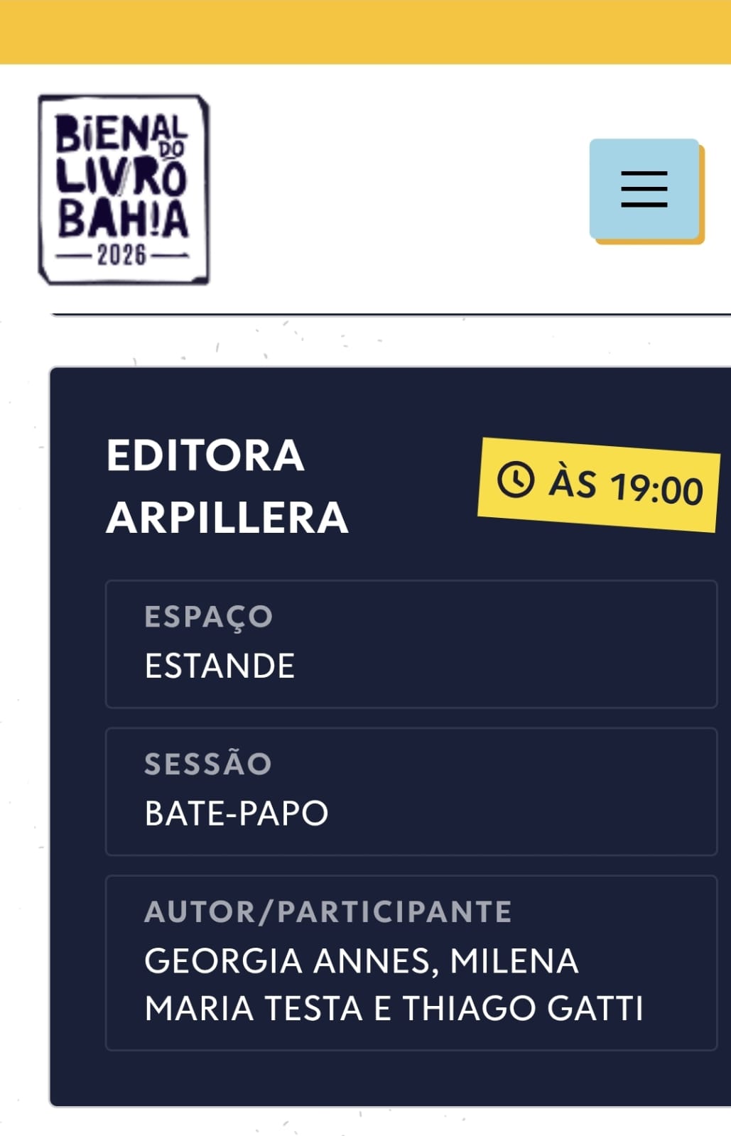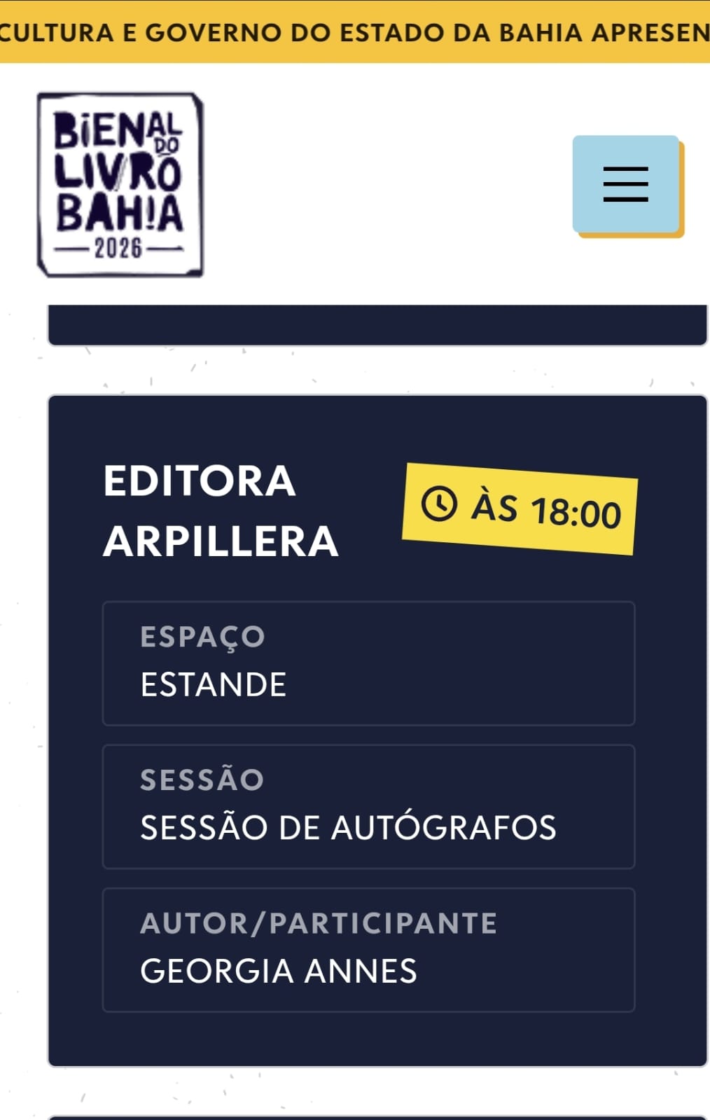 A escritora carioca Georgia Annes estará presente na Bienal do Livro Bahia 2026, participando de debates, bate-papos e autografando seu novo livro, 'A Voz de Elza Lopes', pela Editora Arpillera.