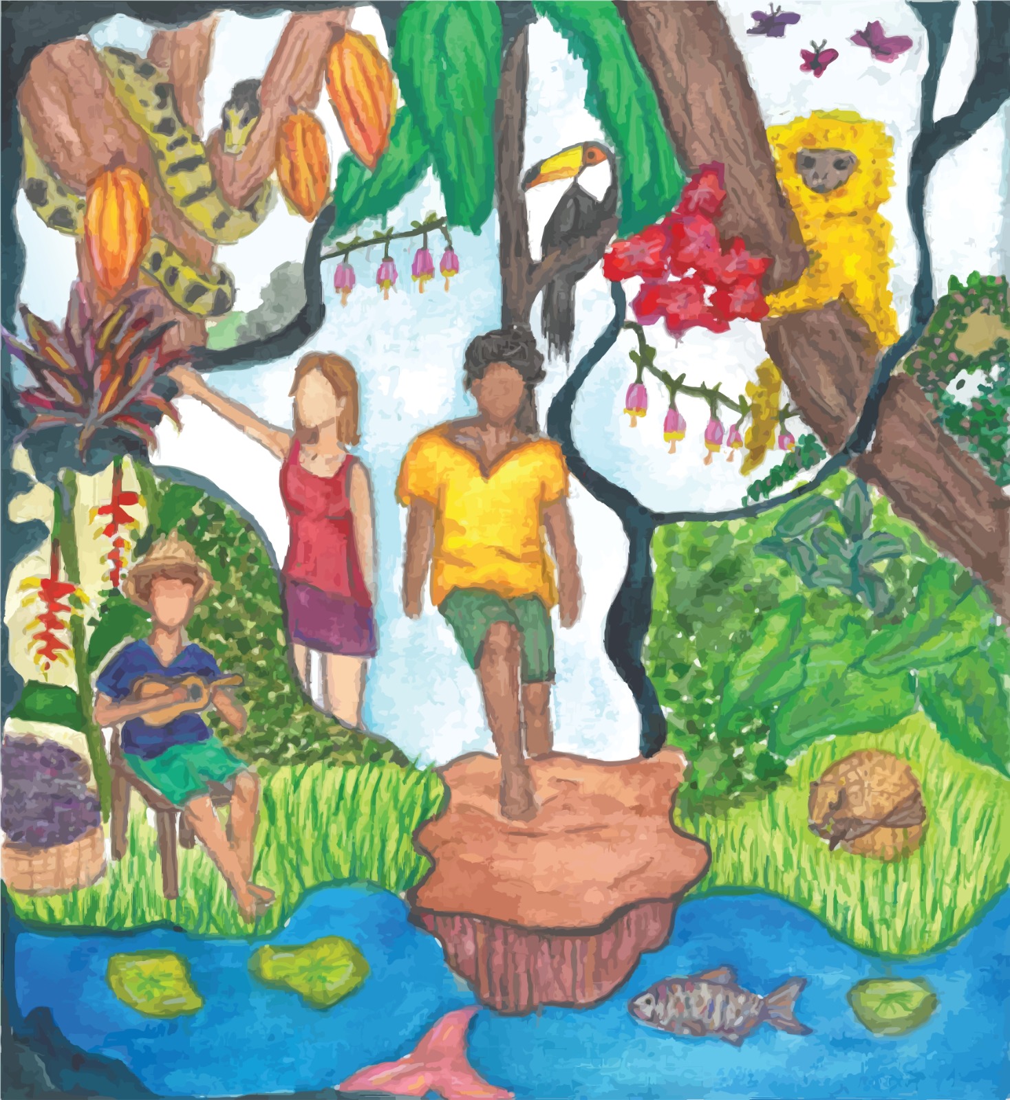 Na ilustração da jovem artista, dois turistas contemplam a paisagem cercados por nossa biodiversidade e símbolos de nossas tradições – uma metáfora, segundo ela, de sua própria jornada. “Creio que, assim como os turistas, ainda estou conhecendo novos retratos do meu país”, afirma Maria Luiza.
