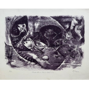 Otávio Araújo litografia com fundo aquarelado 50 x 68cm intitulada "Enigma de verão" ass. CID datada 1973 t. PA