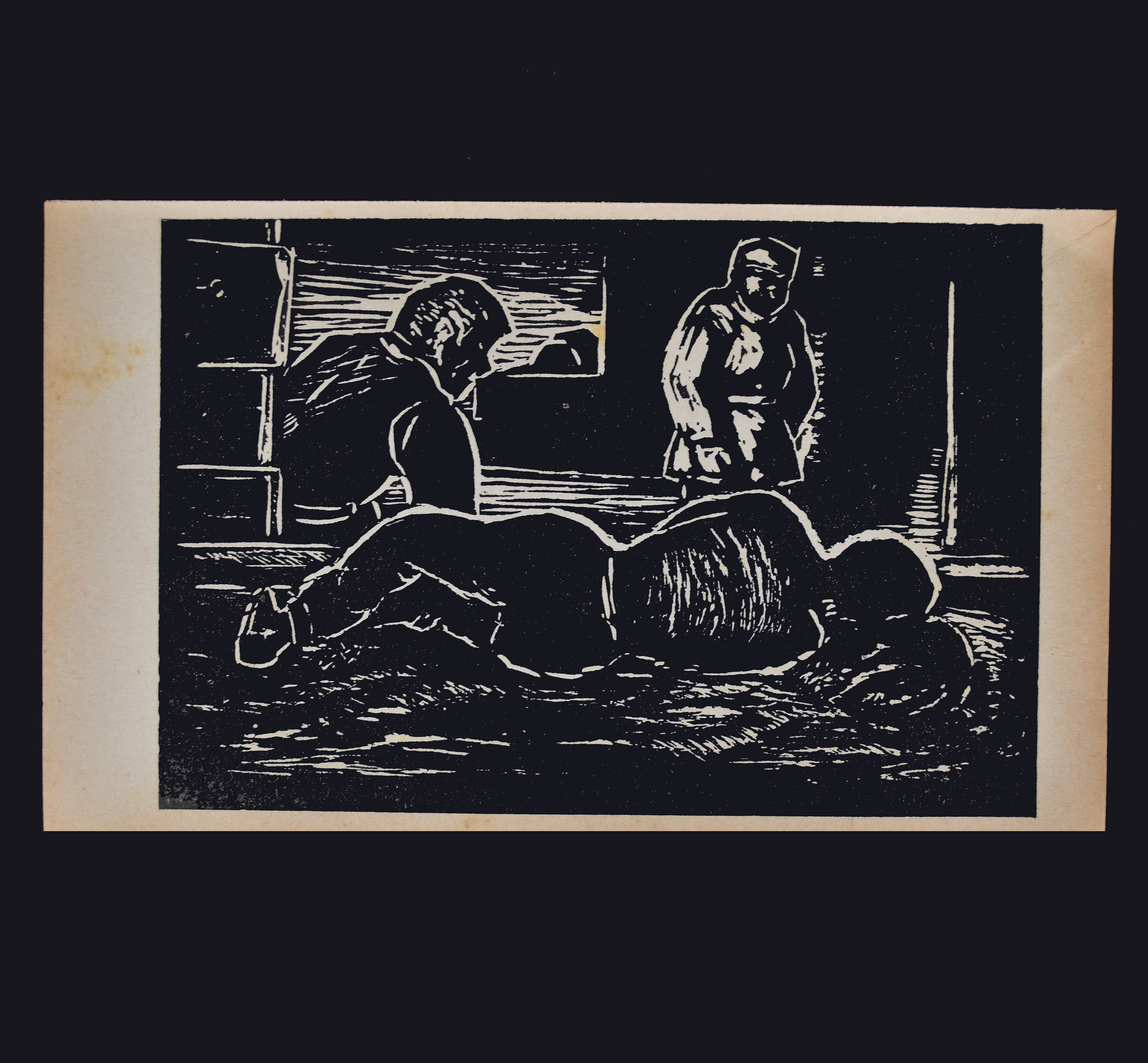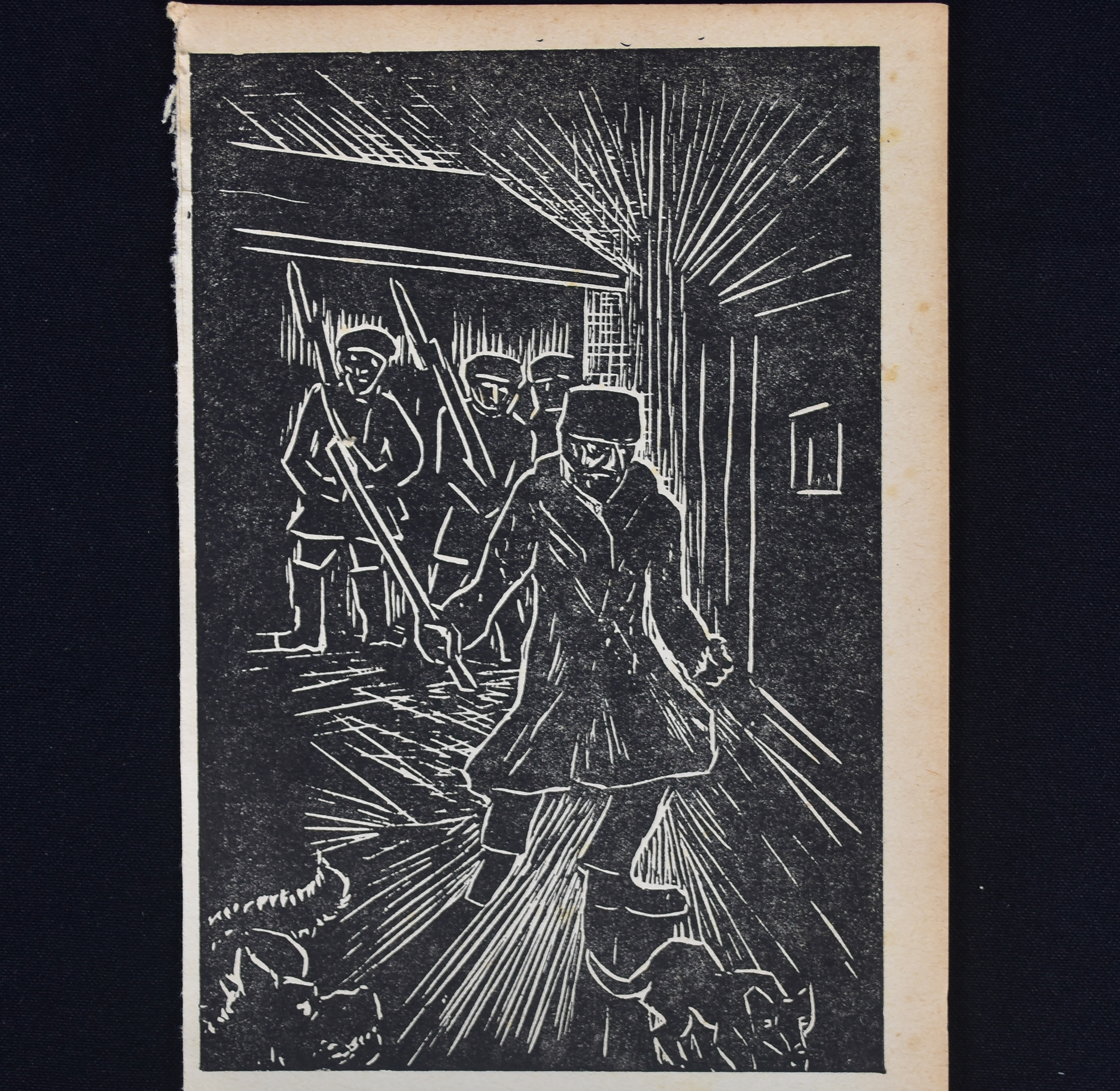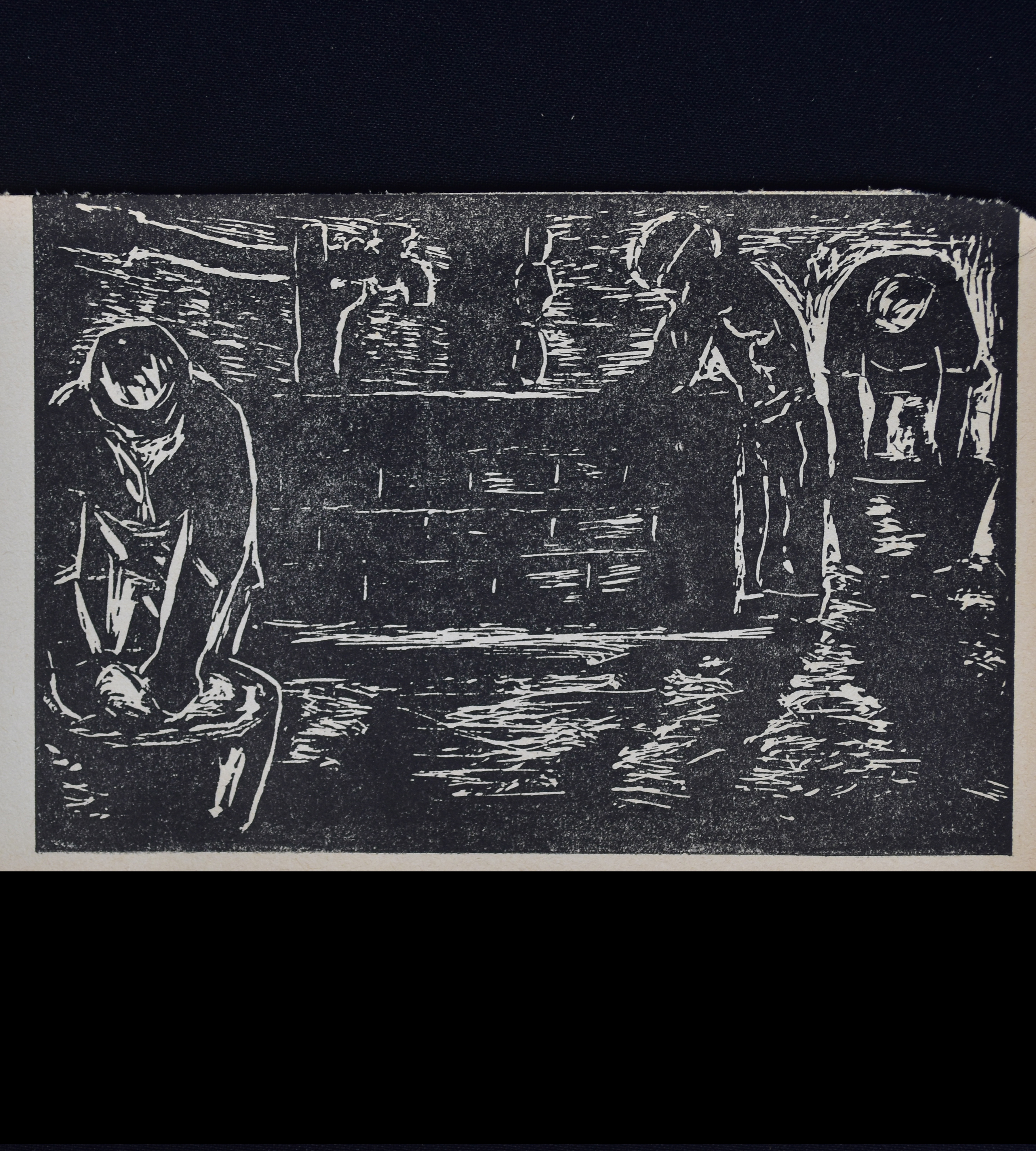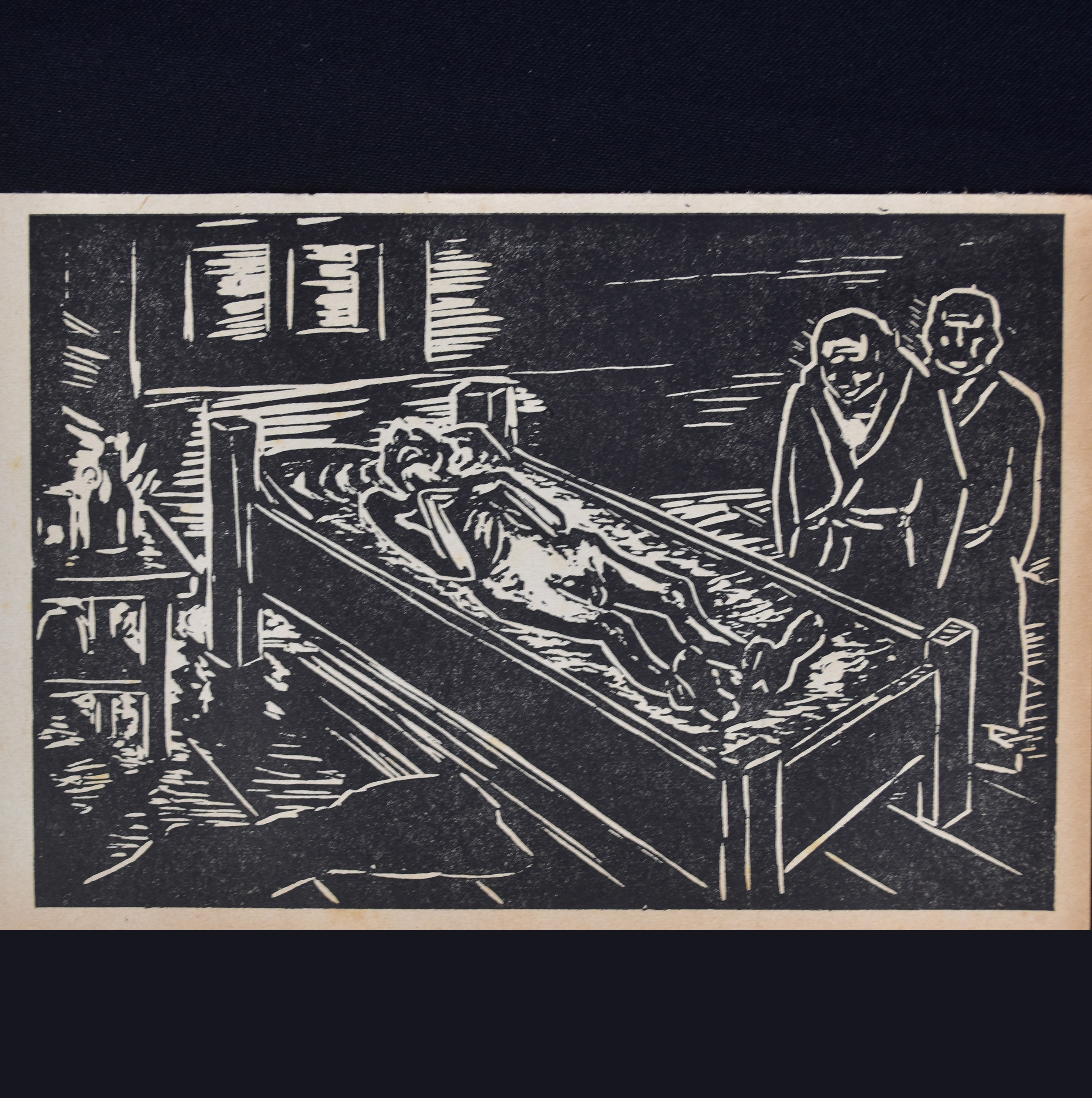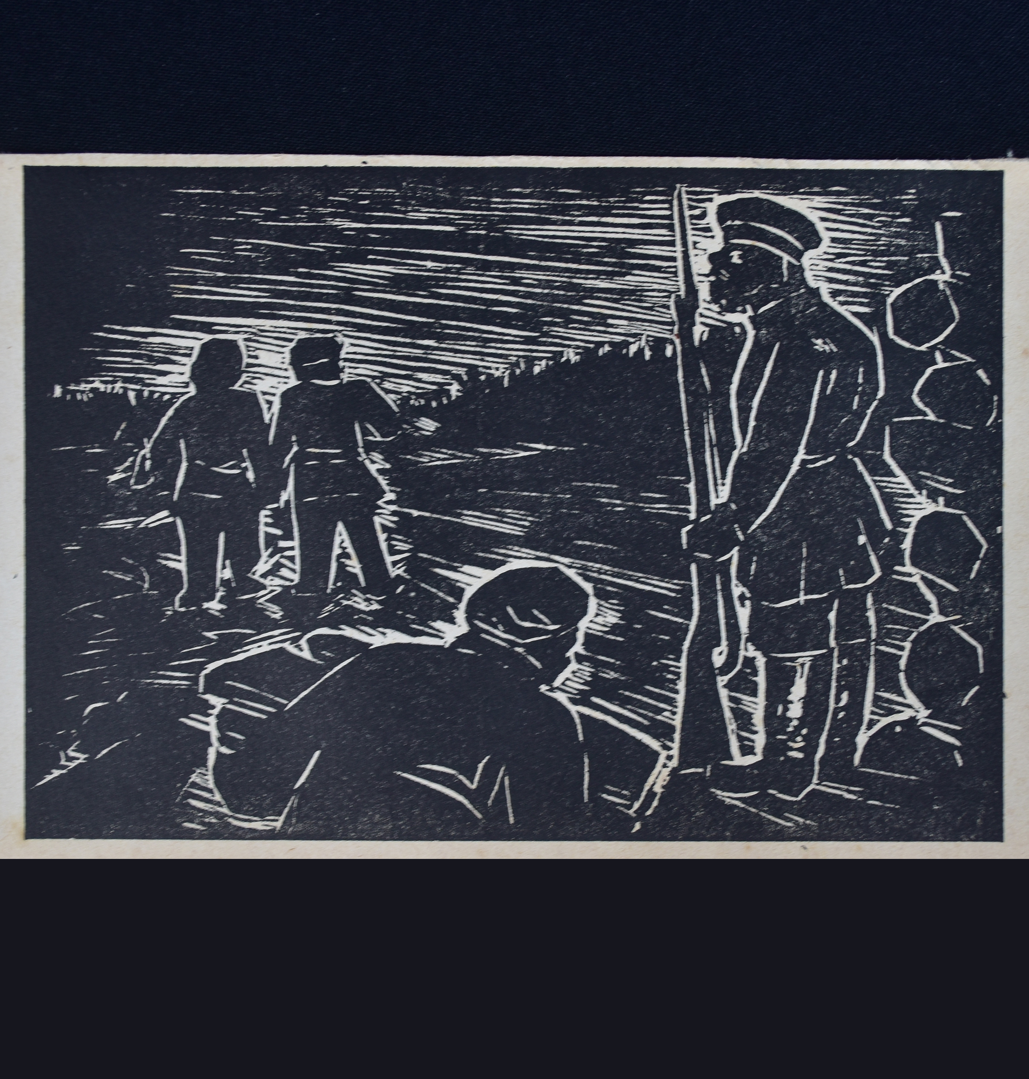 Oswaldo Goeldi Med. 14 x 23 cm. Clicheria, para as ilustrações do livro "Recordações da Casa dos Mortos" de Dostoiévski. Embora Goeldi tenha criado as obras originalmente como xilogravuras em madeira, a clicheria metálica que reproduzia fielmente o desenho entalhado
